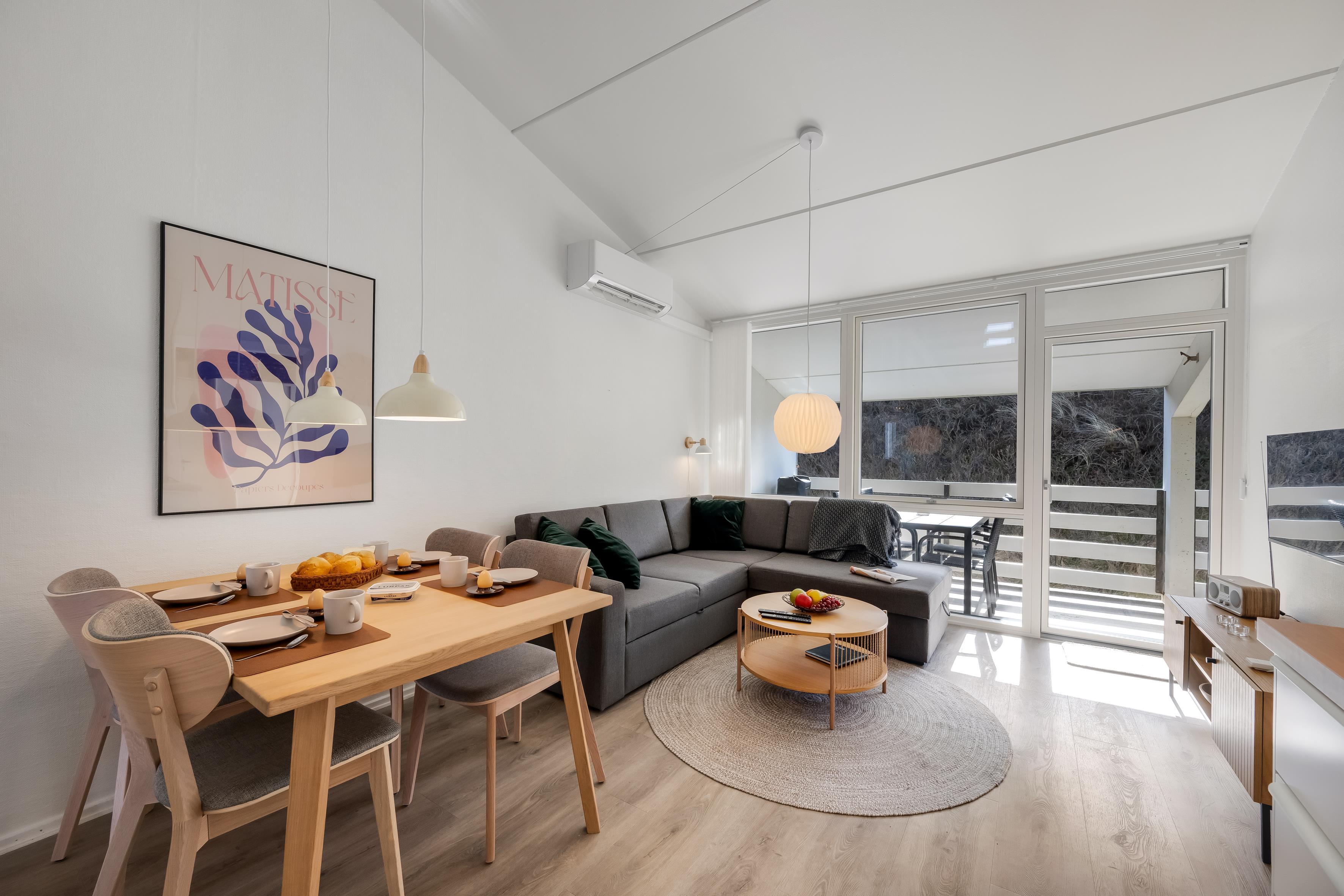 Den store balkon er et fantastisk sted at tilbringe tid sammen, uanset vejret. Her kan du nyde morgenkaffen eller en god bog i fred og ro. Du kan også tænde husets elgrill, så du kan tilberede aftensmaden i det fri. Boligen er også udstyret med en barneseng og barnestol, hvilket gør det til et perfekt valg for børnefamilier. Husdyr er tilladt, så du kan tage din firbenede ven med på ferie!