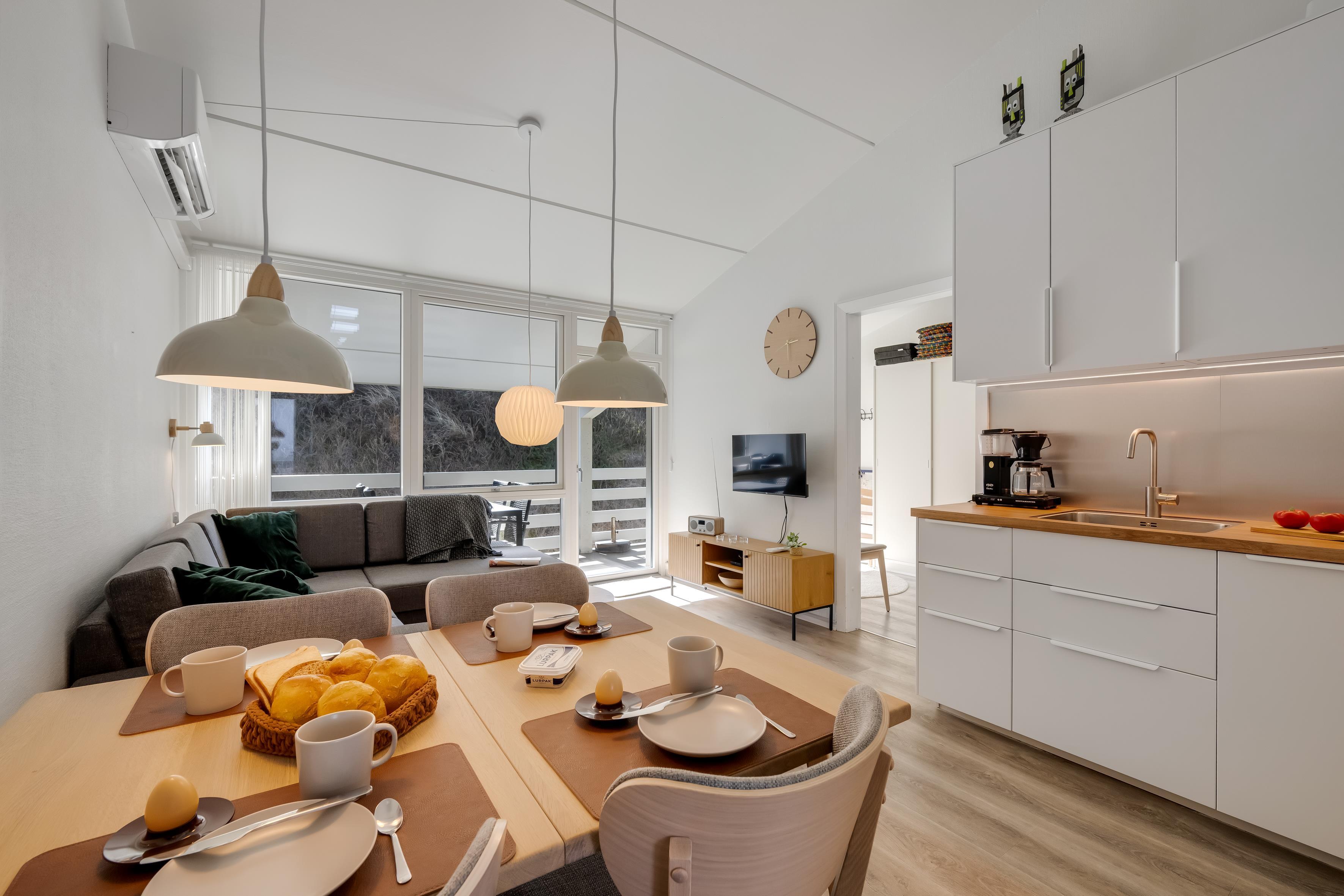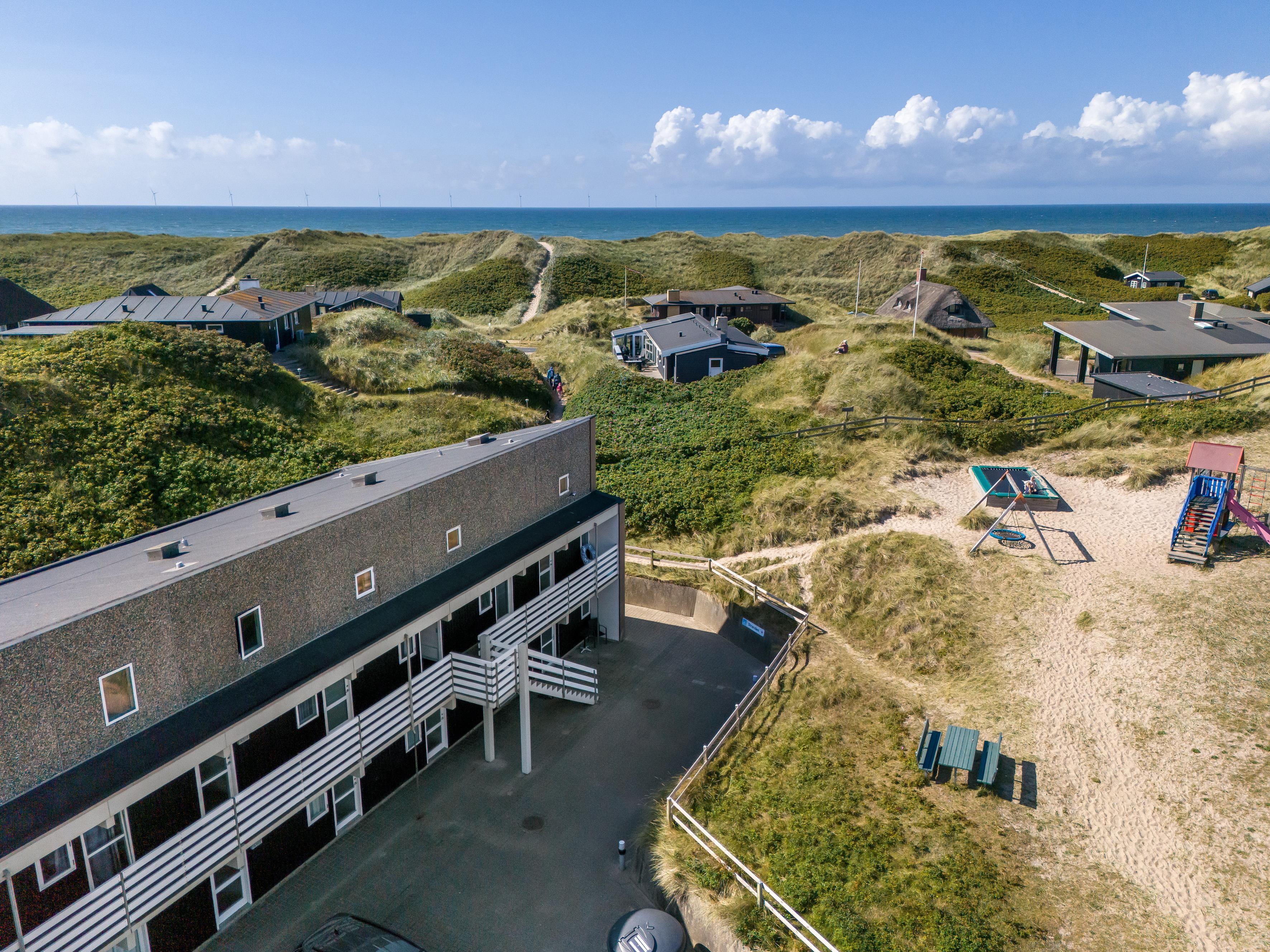 Boligen er ideelt placeret kun 150 meter fra Vesterhavet, hvilket gør det nemt at tage en dukkert eller nyde en hyggelig dag på stranden. Indkøbsmuligheder ligger blot 300 meter væk, mens en restaurant kan nås på kun 100 meter, hvilket giver dig mulighed for at forkæle dig selv med lækre måltider, uden at skulle tænke på bilen.