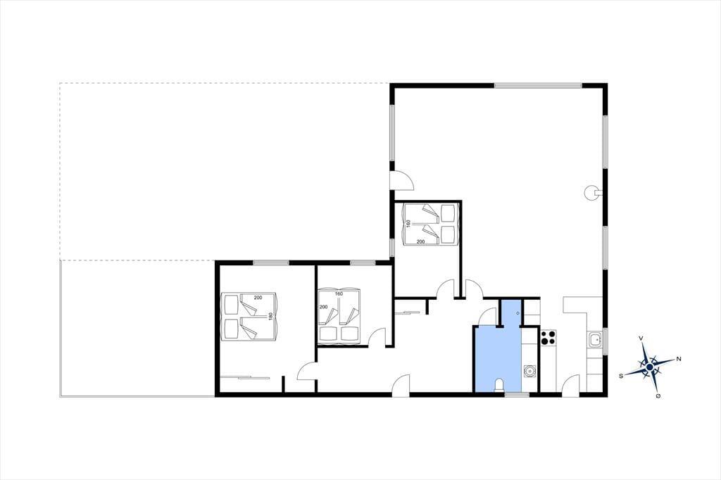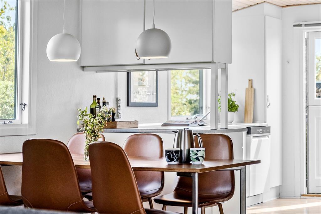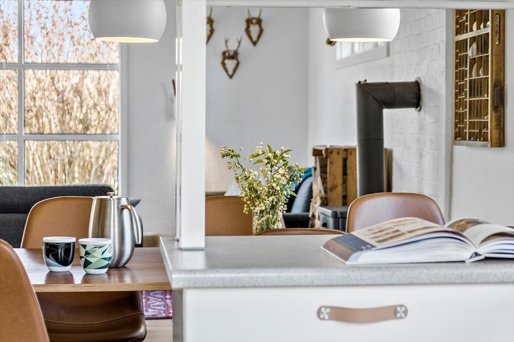 Brændeovnen varmer nemt den hyggelige stue og det åbne køkken, i direkte forbindelse, op. Sommerhuset har desuden varmepumpe med køl. Køkkenet har induktionskomfur samt opvaskemaskine, og fra køkkenet er der udgang mod øst til haven. Feriehuset har fra fordelingsgang adgang til tre gode soverum med dobbeltsenge.