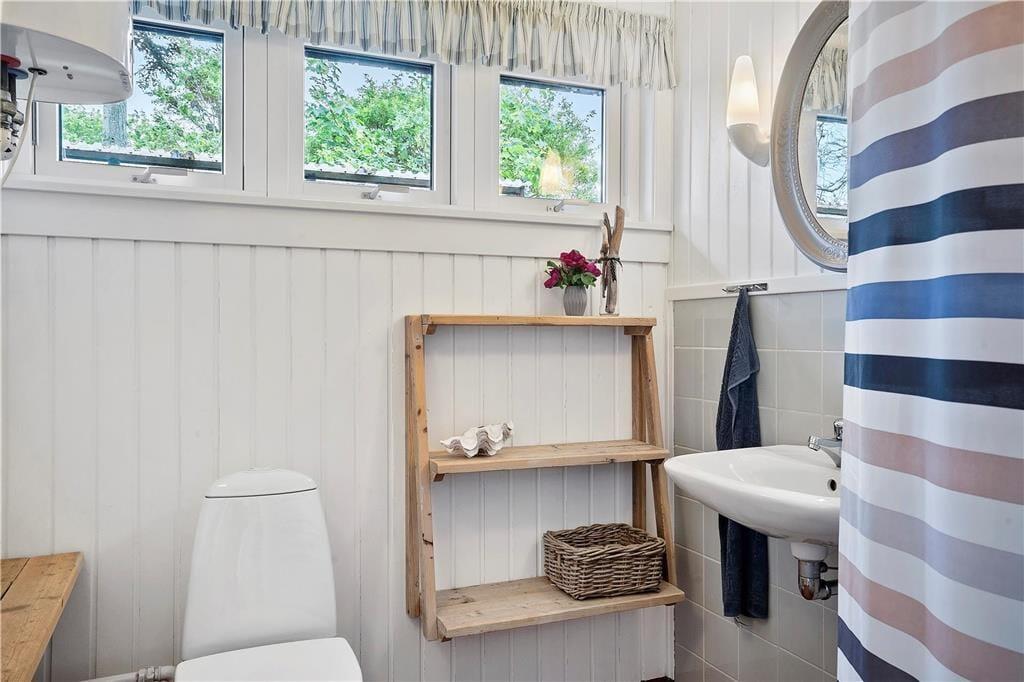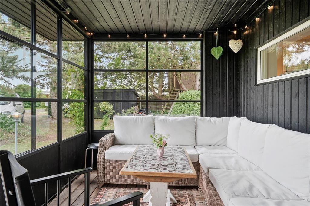Sommerhuset er stilfuldt og hyggelig indrettet og har dejlig stue med brændeovn og med udgang til haven og et dejligt køkken. Egner sig godt til familier med små børn, da der i huset er børnevenligt og har bl.a. barnestol, barneseng og babybadekar. Udover badeværelset i sommerhuset er der ekstra toilet i tilstødende skur. Hyggelig udestue.