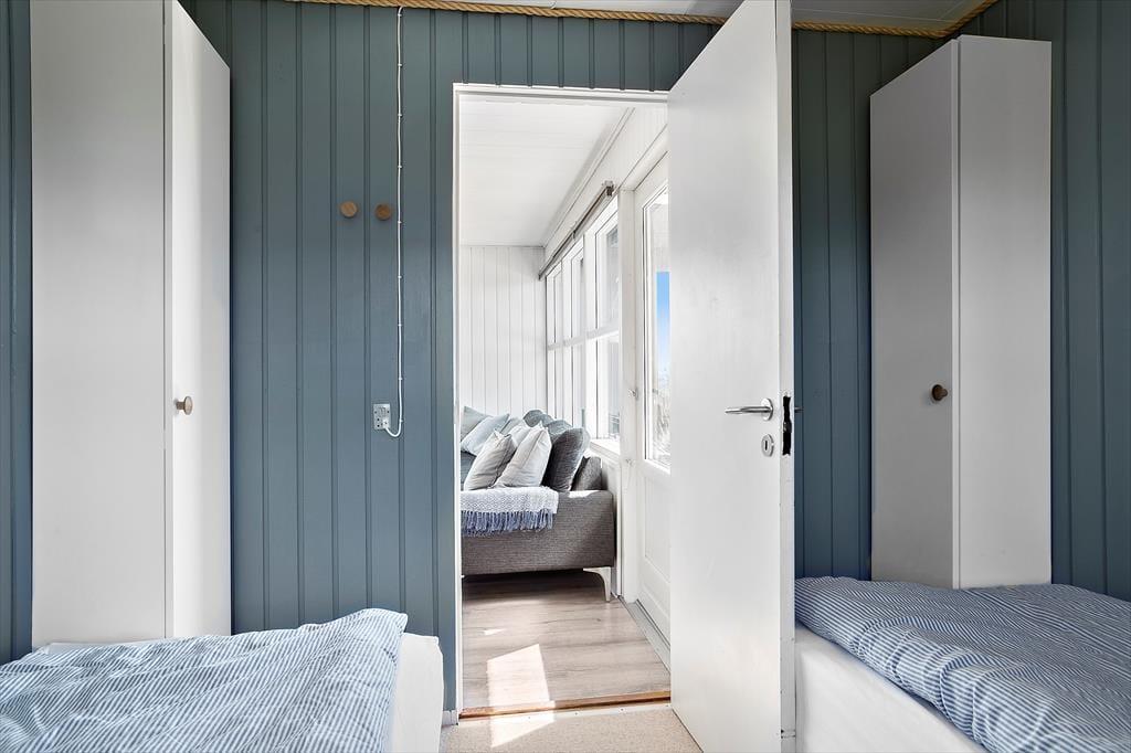 Sovepladserne er fordelt i et soverum med dobbeltseng, et rum med enkelte senge og et rum med køjeseng.