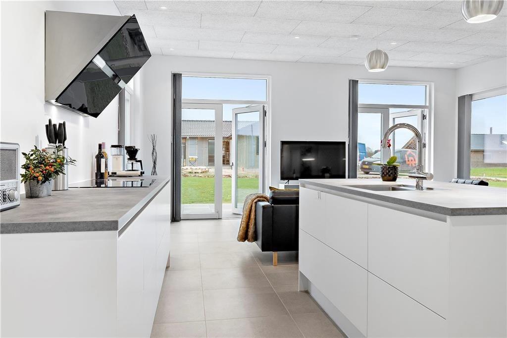 Det lyse køkken/alrum er central placeret i huset, hvor køkkenet indeholder alt, hvad I skal bruge af moderne faciliteter. Her er induktionskogeplader, ovn, mikroovn, opvaskemaskine, køleskab, stor fryser og Quooker – nemt til kogende vand.