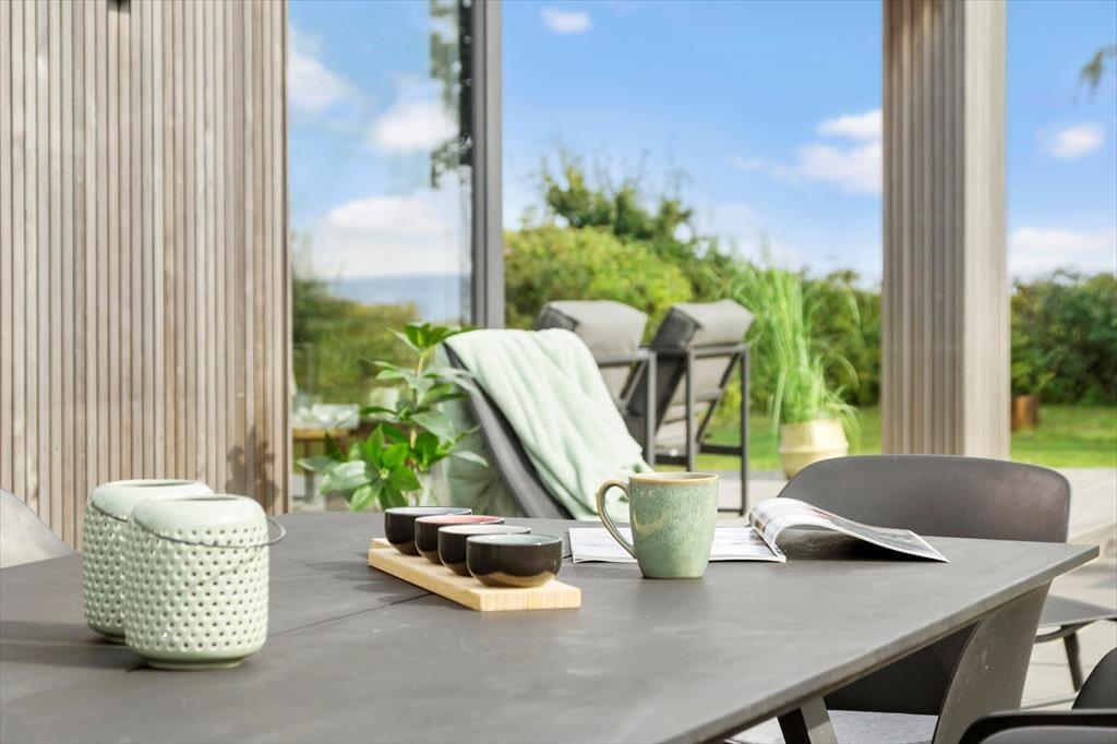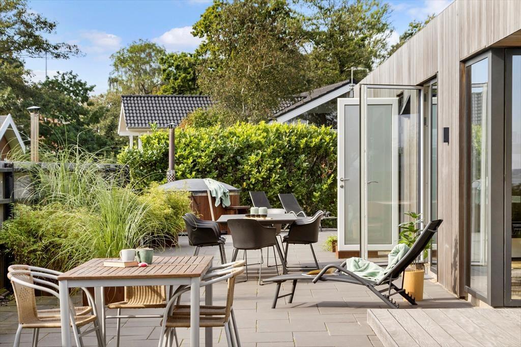 Hvis ikke lige dagen skal bruges her på en af Østjyllands bedste badestrande, så er der mange fine muligheder for at nyde opholde, vejret og hinanden rundt om huset på den fine træterrasse med havemøbler, liggestole, parasol m.m.