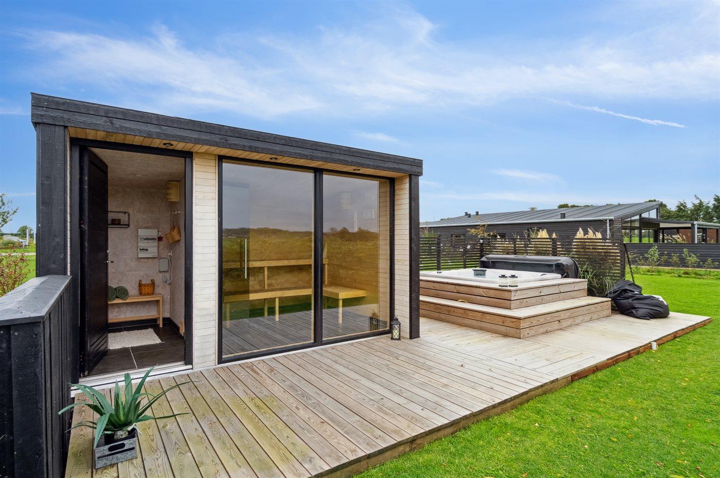I denne skønne have findes der et fantastisk wellness-område med et 5 personers spabad, hvorfra den dejlige udsigt kan nydes samt en sauna (slow cook), som kun bliver omkring 60 grader varm og som har et stort glasparti – ligeledes med udsigt. Hele wellness-området er omkranset af en terrasse således man kan gå direkte fra spabadet og i saunaen.