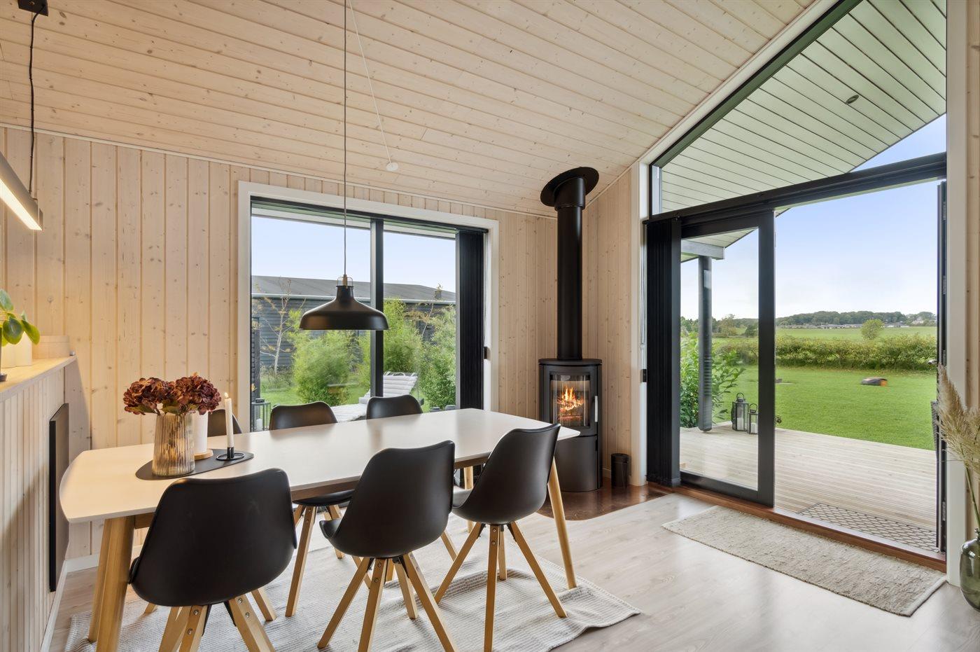Sommerhusets gode indretning passer rigtig fint til f.eks. en familie med 2-3 børn, der ønsker at holde ferie i disse fantastiske omgivelser. Sommerhuset er beliggende med en særdeles skøn udsigt udover marker og den dejlige natur. Udsigten kan nydes fra det dejlige køkken/alrum og stue, men i høj grad også fra den dejlige og delvist overdækkede terrasse. På den store terrasse, hvor der altid er mulighed for at finde en lækrog, kan man nyde ferien i ro og mag med en god kop kaffe eller et glas vin.