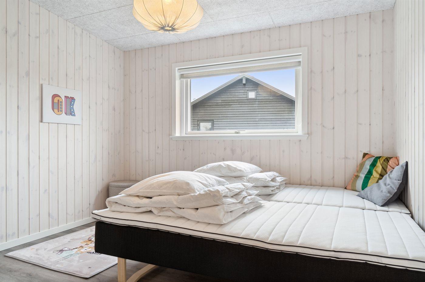 Der er i alt 3 soveværelser. Sovepladserne fordeler sig på: 6 sovepladser i dobbeltsenge. 2 sovepladser i sovesofa (enkelt). 2 af disse sovepladser befinder sig i stuen. Derudover er der 1 stk. barneseng.