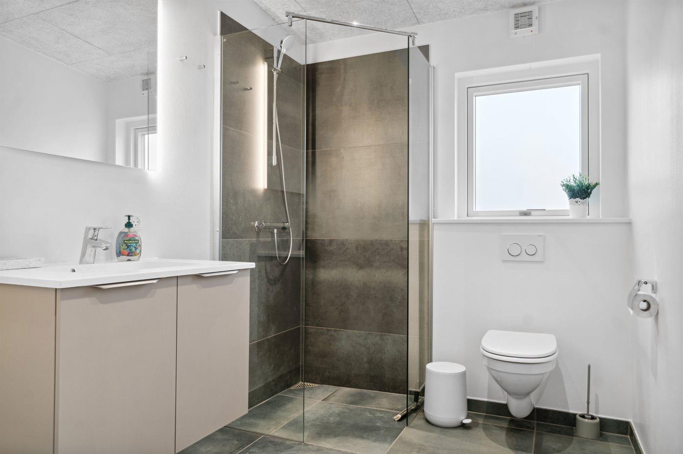 Der er 2 badeværelser med bruseniche og 2 toiletter. Der er gulvvarme på 2 badeværelser. I saunaen er der mulighed for afslapning.