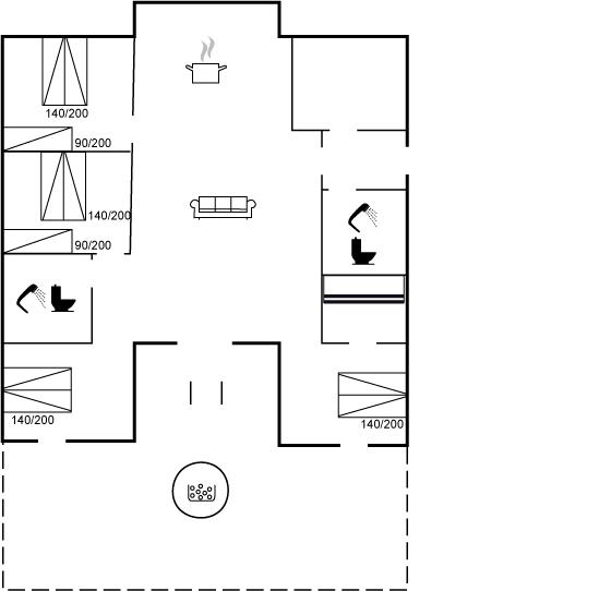 Der er i alt 5 soveværelser. Sovepladserne fordeler sig på: 8 sovepladser i dobbeltsenge. 2 sovepladser i enkeltsenge. 2 sovepladser i køjeseng.