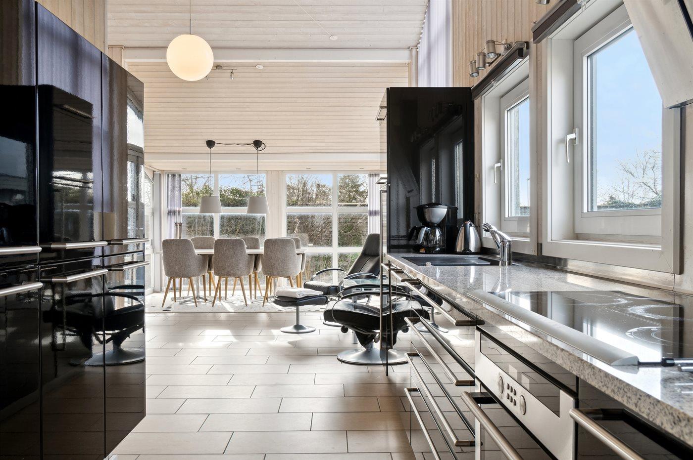 Køkkenet er udstyret med 1 køleskab. Der er 4 keramiske kogeplader, varmluftovn, mikrobølgeovn samt opvaskemaskine Der er gulvvarme i køkkenet.