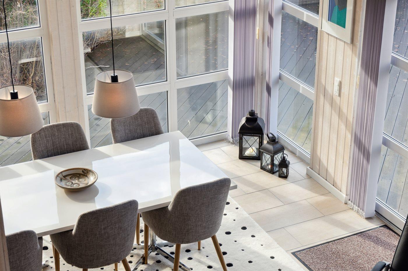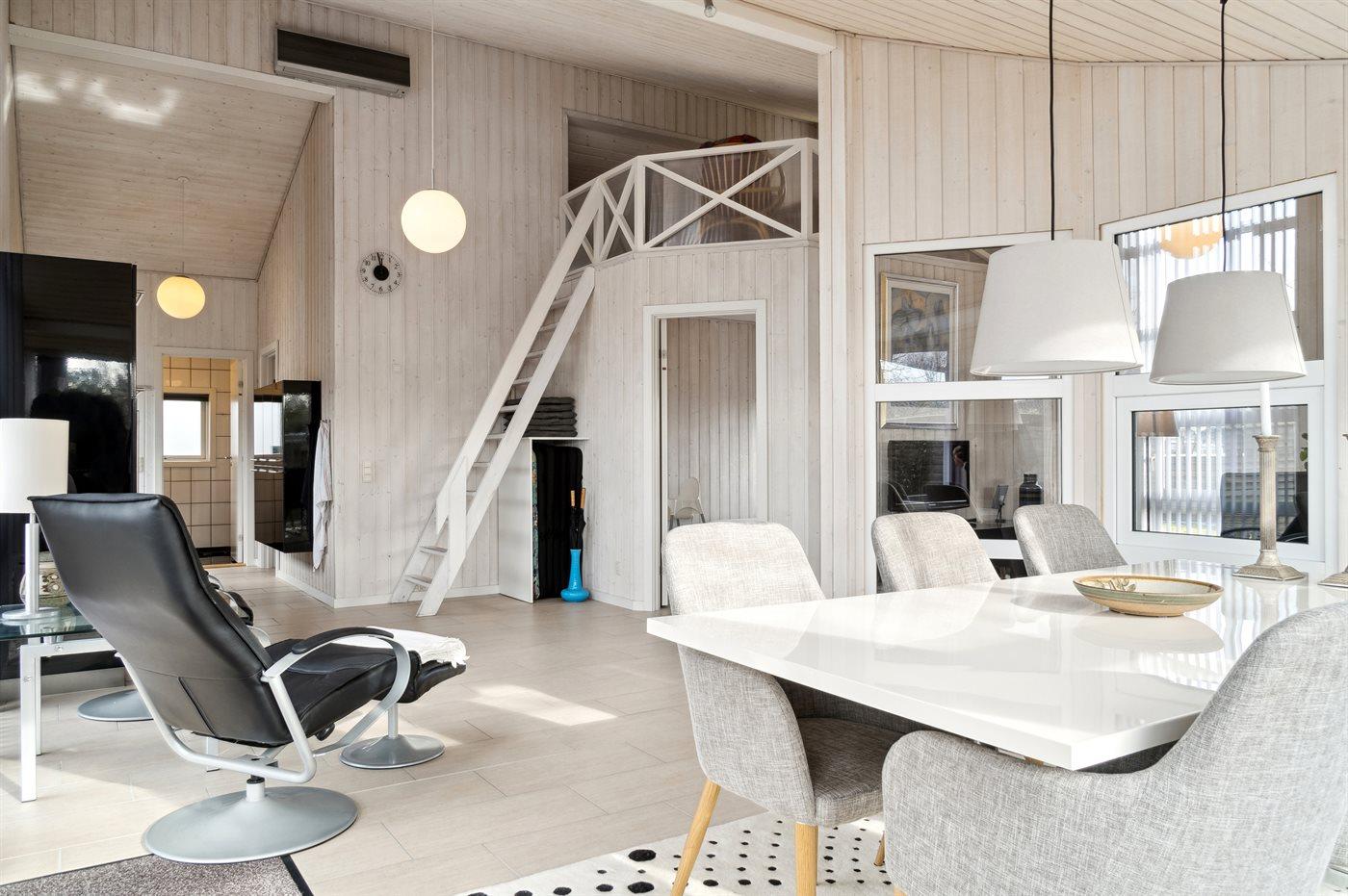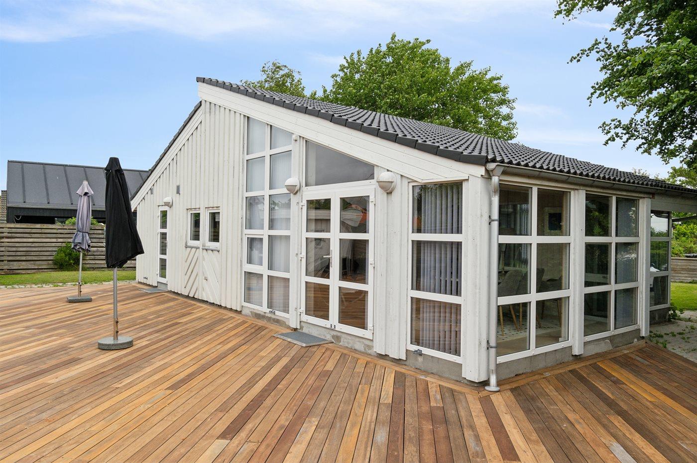 Sommerhuset fremstår lyst og moderne med en fin indretning, som passer godt til f.eks. en familie. To af sovepladserne findes på den hyggelige hems, der er at finde sammen med stuen. Husets hjerte er det store åbne køkken/alrum og stue i et. Sommerhuset ligger helt ugenert på den dejlige, indhegnede grund og har en fantastisk terrasse med rigtig god plads. Her er altid mulighed for at finde en lækrog og nyde disse særlige og rolige omgivelser. Terrassen er virkelig et skønt sted at opholde sig, og den findes på flere sider af sommerhuset, så solen kan nydes i fulde drag det meste af dagen.