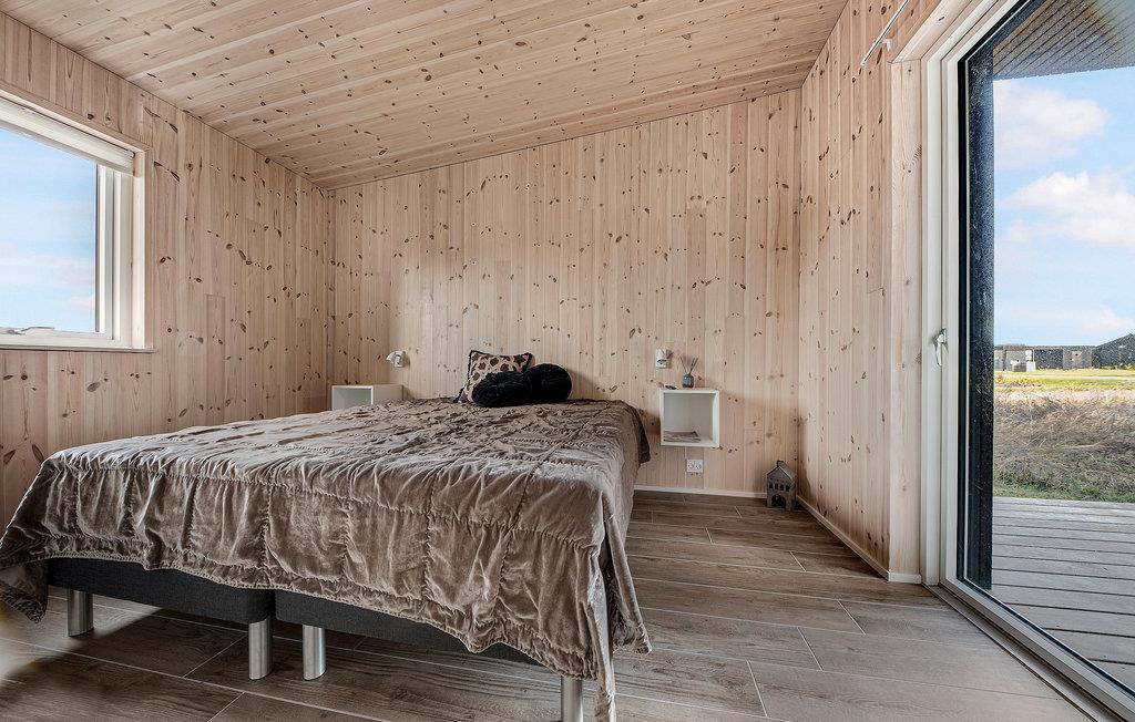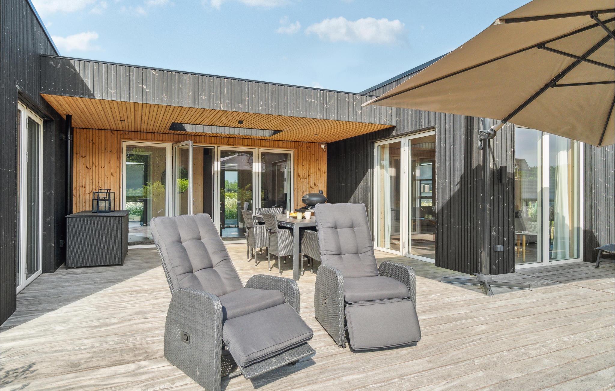 Moderne træhus nær Saksild Strand med stor terrasse og hyggelig atmosfære.