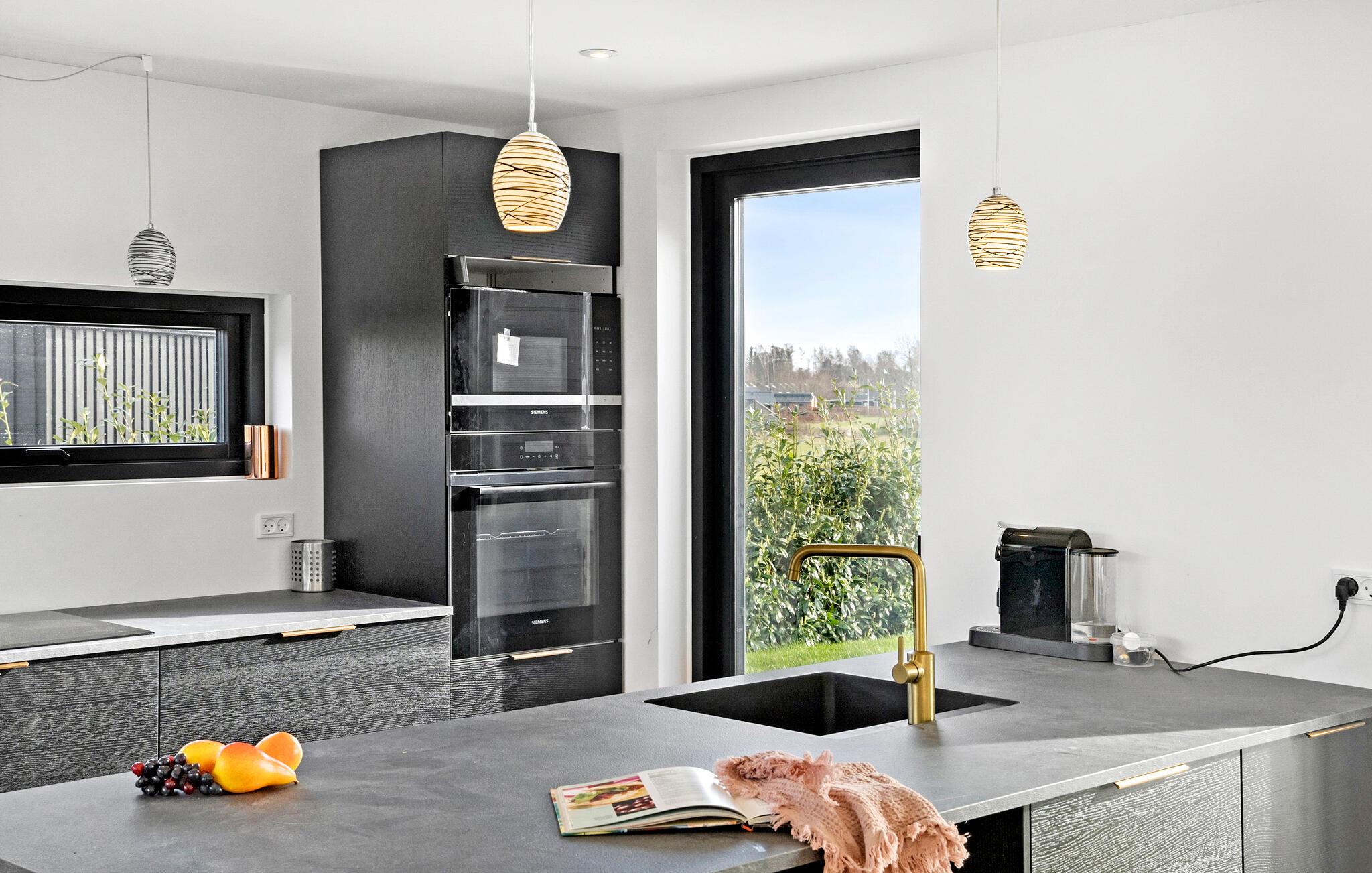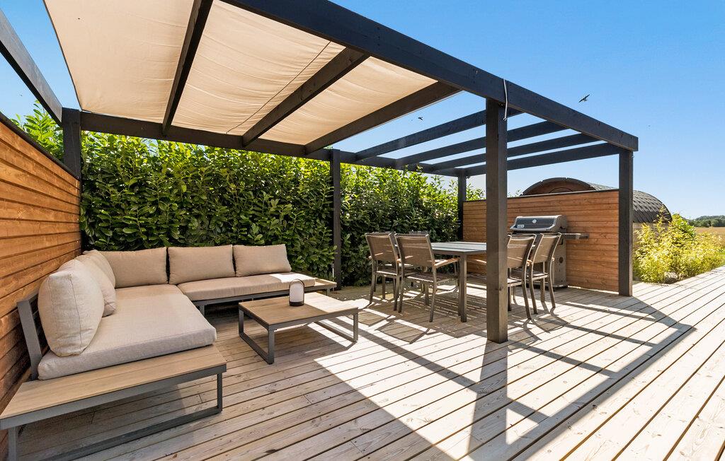 I dette lækre feriehus får I med de mange kvadratmeter og den gennemtænkte indretning den perfekte bolig til en ferie med den udvidede familie. Indvendigt fremtræder huset elegant og stilsikkert med et åbent boligkoncept, rene linjer og store vinduespartier, der lader dagslyset sive ind og samtidig giver en smuk udsigt til landskabet. Tag jer god tid til tingene og gør madlavningen til et sjovt fællesprojekt i det moderne køkken, inden I dækker op til den store festmiddag ved spisebordet og lader blikkene vandre over markerne. Senere kan I hive brætspillene frem eller trække over i sofaen med lækre snacks til en hyggelig filmaften.