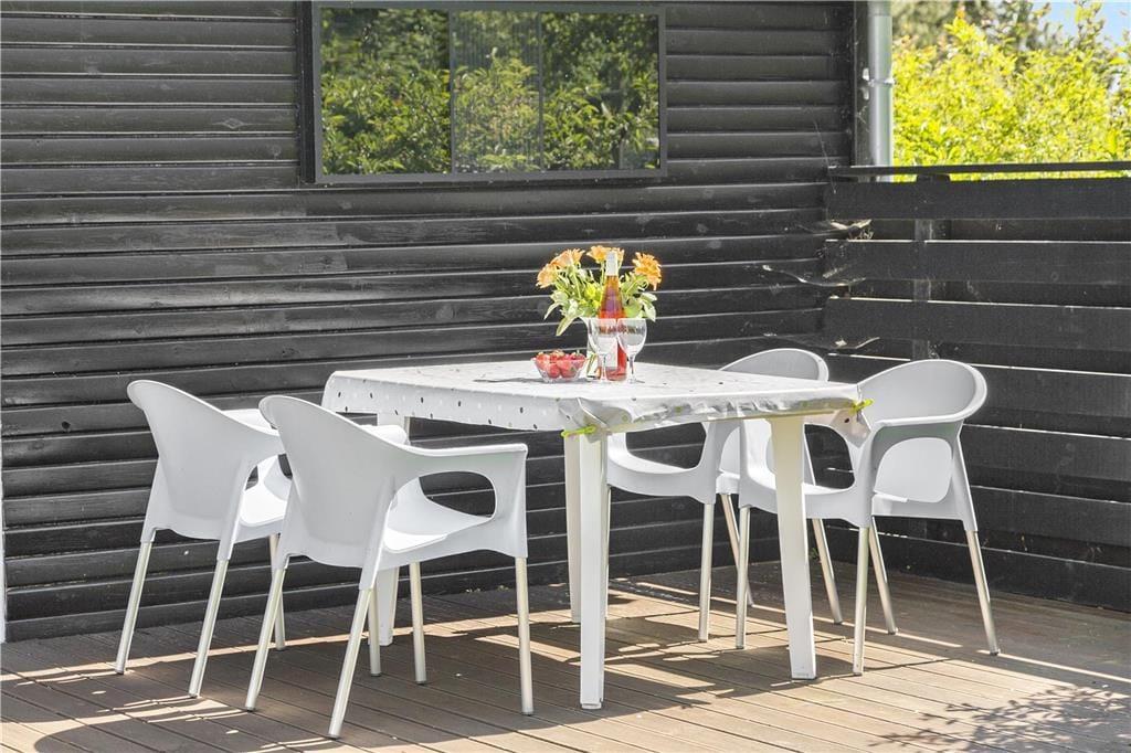 Huset har en ca. 800 m2 grund med en dejlig træterrasse og en hyggelig have med flere solkroge. Fra grunden er der havudsigt. Ved feriehuset er der havemøbler, liggestole, parasol, grill og 2 cykler.