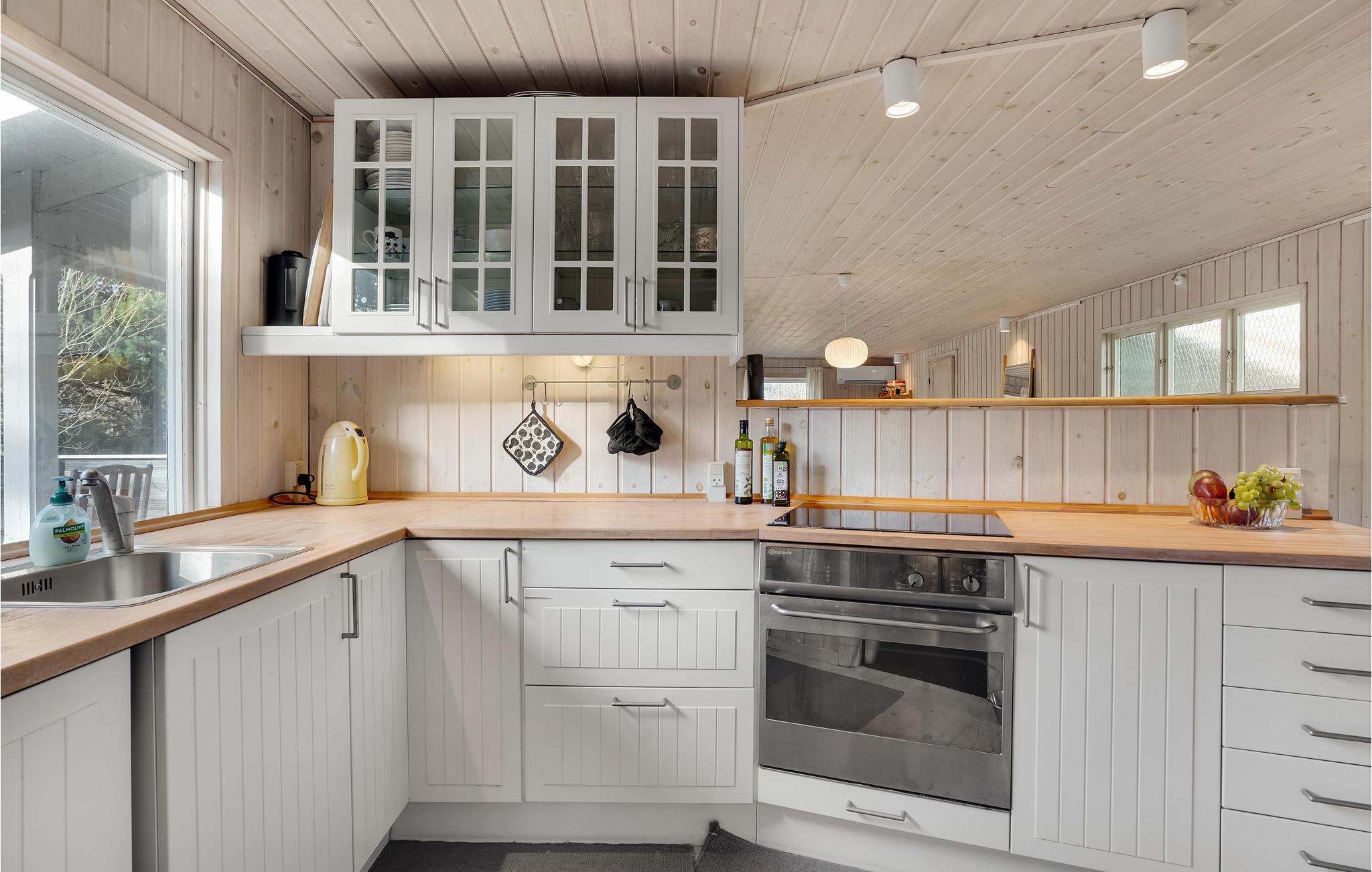 Charmerende feriehus nær Saltbæk Vig med åbent køkken og både overdækket og åben terrasse.
