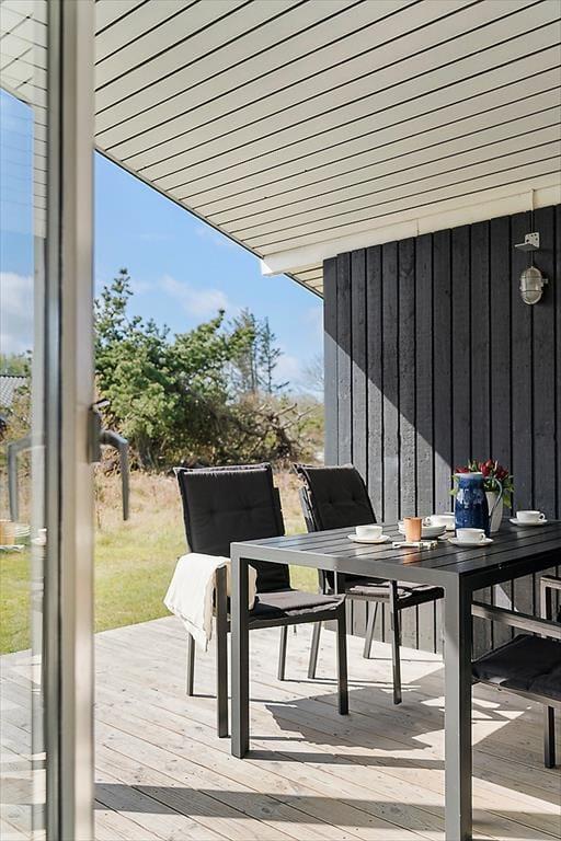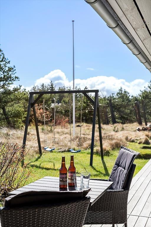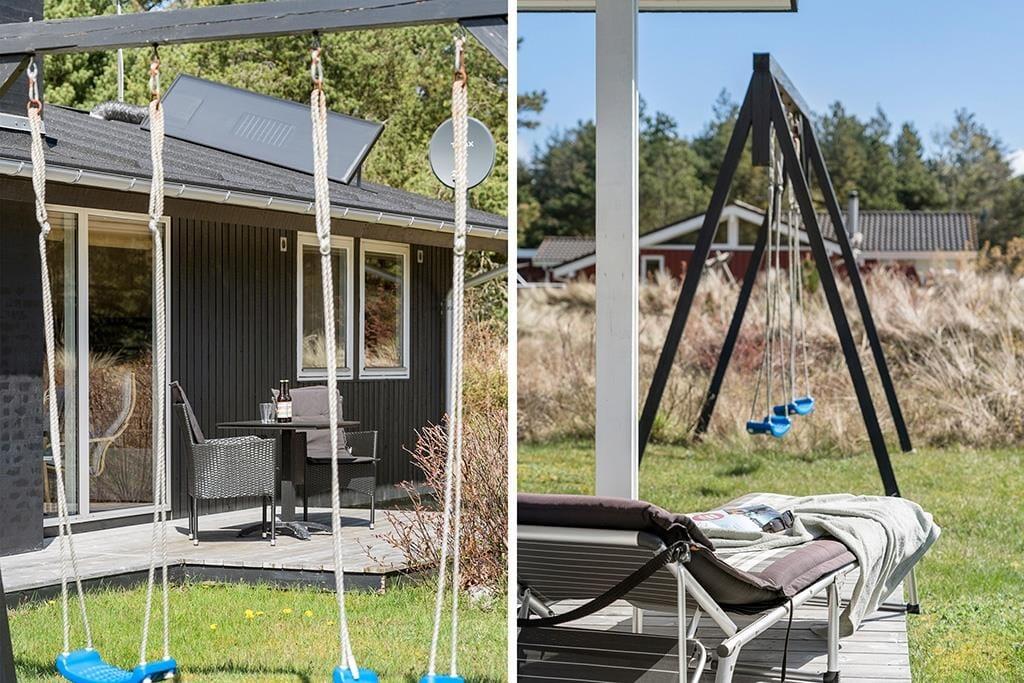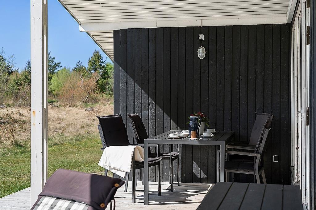 Når du træder udenfor, kan du lade dig indhylle i den rolige natur og den idylliske have. Den hyggelige terrasse er det perfekte sted at tilbringe tid sammen under åben himmel – uanset om det er til morgenkaffen, en frokost eller et afslappende måltid om aftenen. Terrassen er skærmet af træer og buske, hvilket skaber en privat og fredfyldt oase, hvor du kan nyde solen i fred og ro. Den grønne have omkring sommerhuset indbyder til både leg og afslapning, og du vil hurtigt finde ud af, at det er et dejligt sted at tilbringe både dage og aftener.