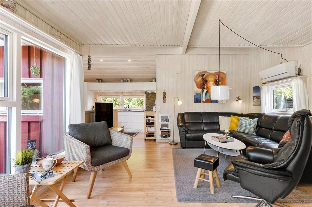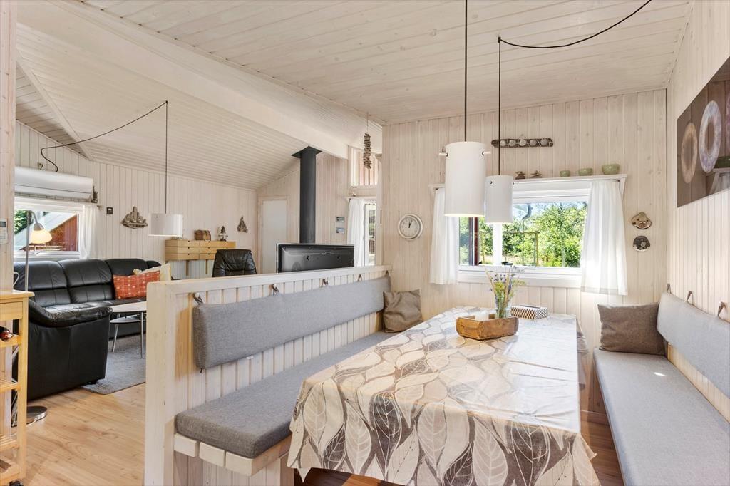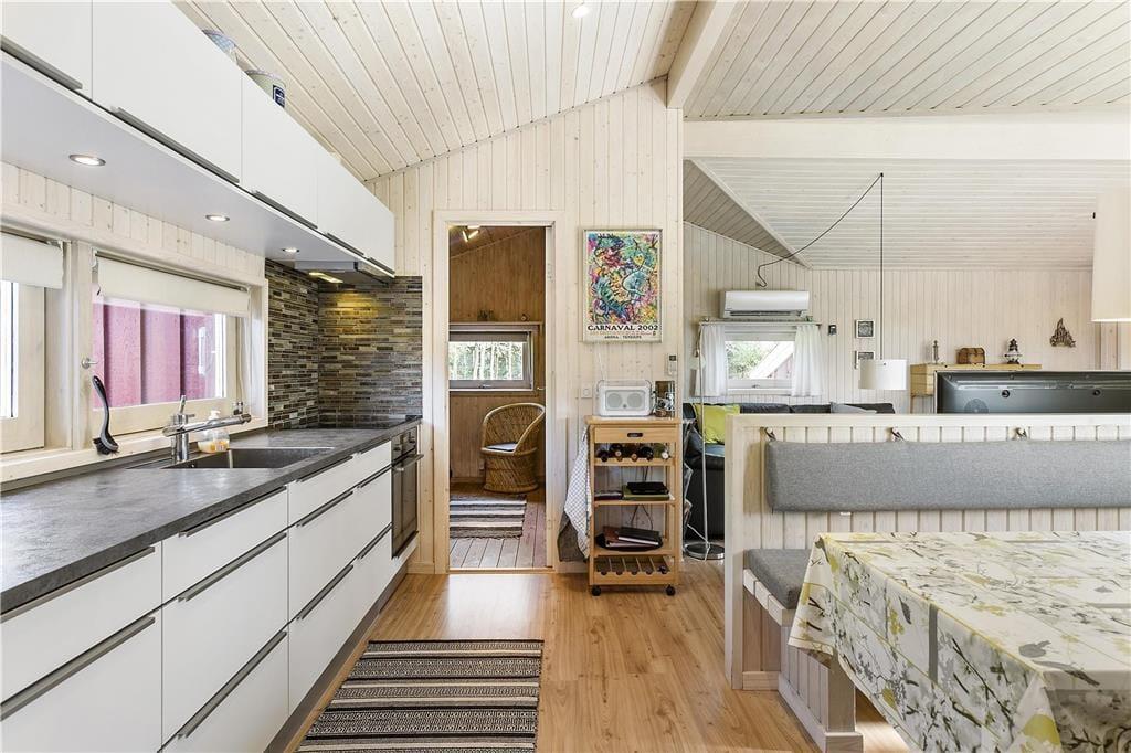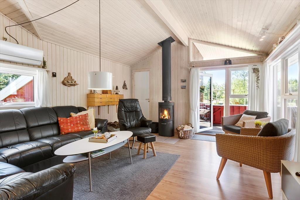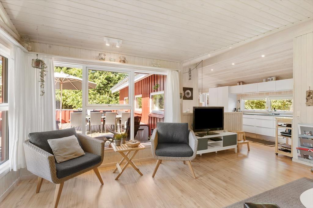 Indenfor præsenterer sommerhuset sig lyst og lækkert, med store vinduer, der giver et flot lysindfald og inviterer naturen indenfor. Stuen er både rummelig og hyggelig med en moderne indretning, som gør det til et oplagt samlingspunkt for hele familien. Her kan I nyde film, spil eller simpelthen slappe af ved brændeovnen efter en dag i naturen. Det åbne køkken giver jer mulighed for at kokkerere sammen, og når dagens måltider er overstået, er der masser af plads til at slappe af og nyde feriens ro.