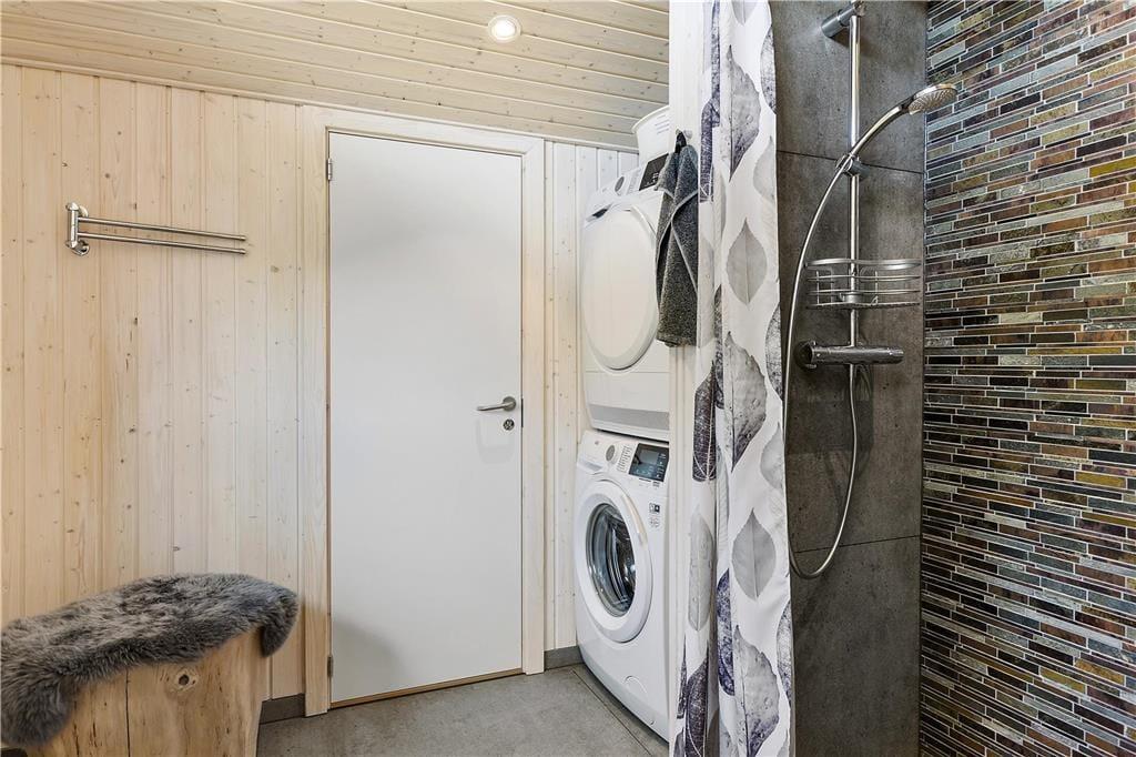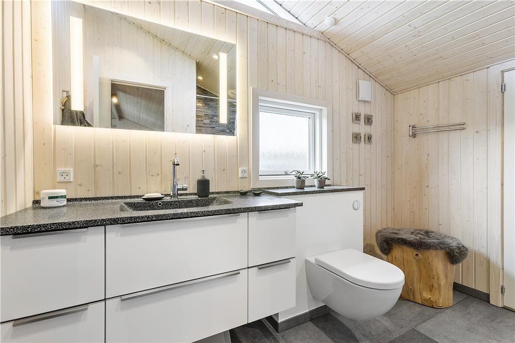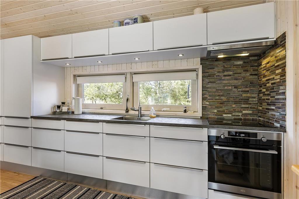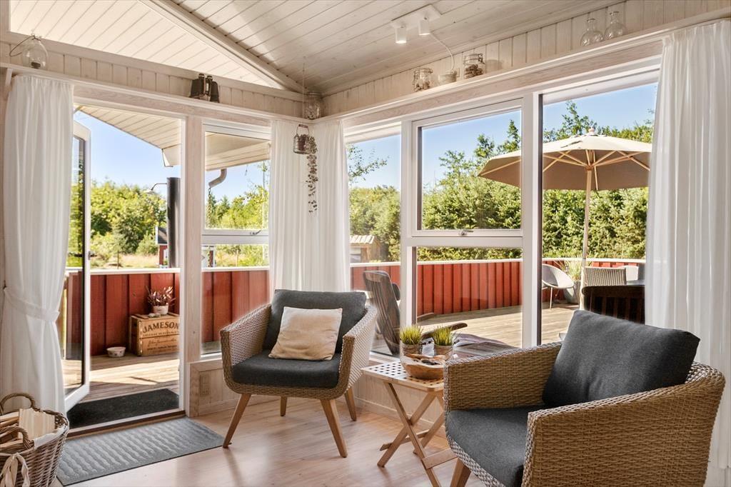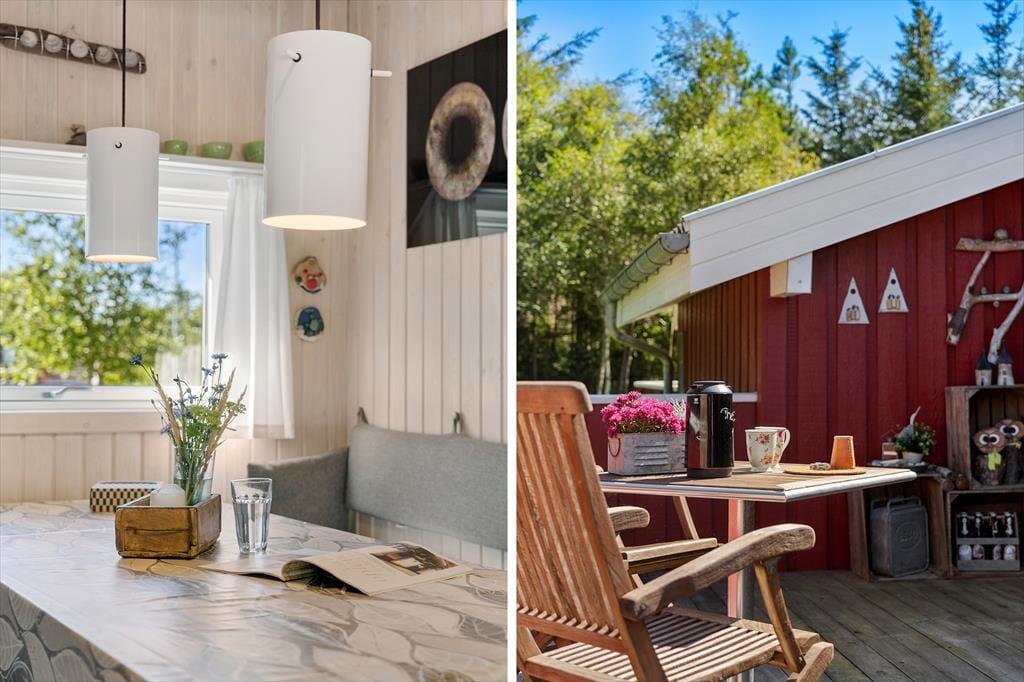 Indenfor præsenterer sommerhuset sig lyst og lækkert, med store vinduer, der giver et flot lysindfald og inviterer naturen indenfor. Stuen er både rummelig og hyggelig med en moderne indretning, som gør det til et oplagt samlingspunkt for hele familien. Her kan I nyde film, spil eller simpelthen slappe af ved brændeovnen efter en dag i naturen. Det åbne køkken giver jer mulighed for at kokkerere sammen, og når dagens måltider er overstået, er der masser af plads til at slappe af og nyde feriens ro.