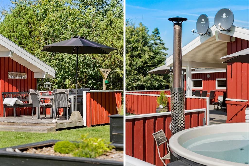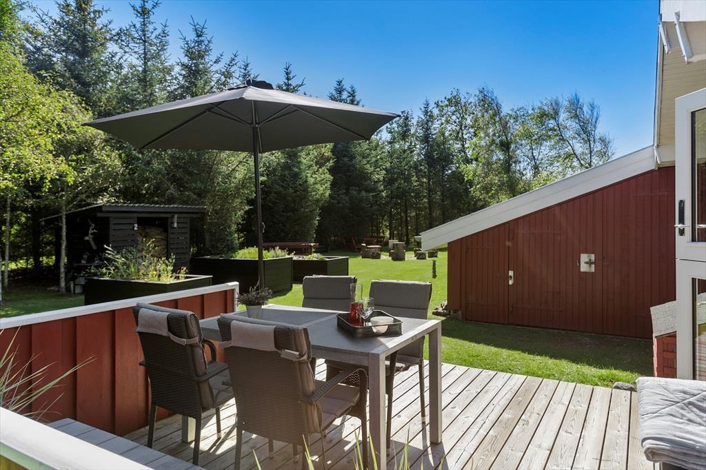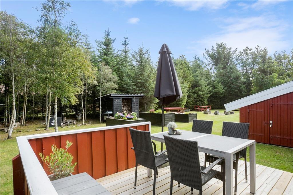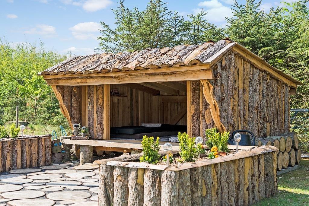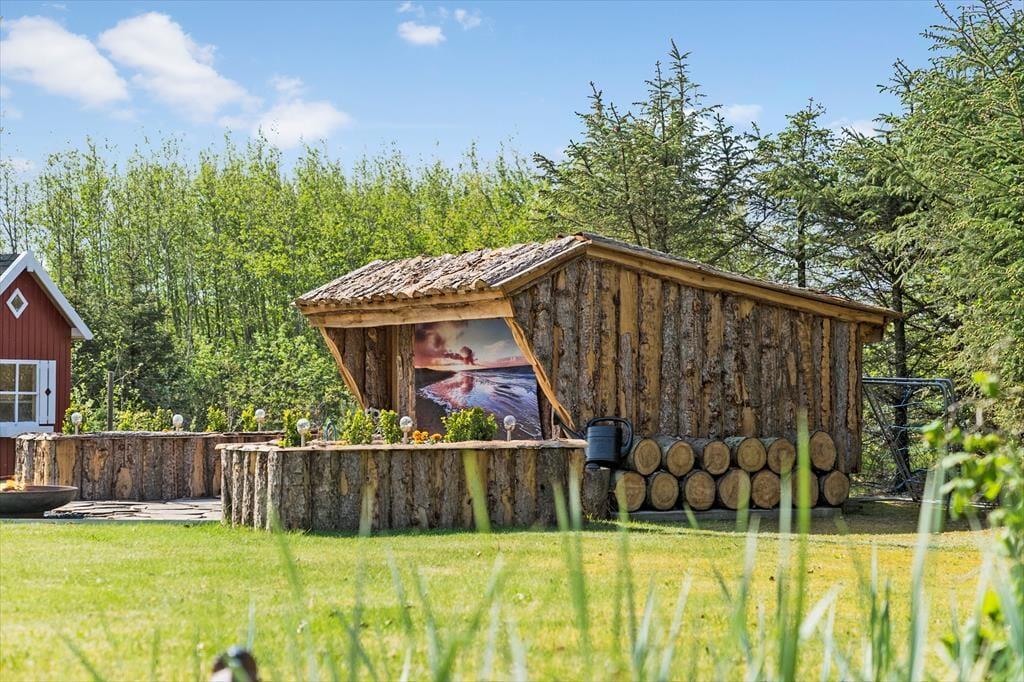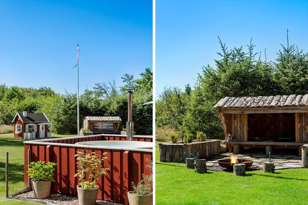 Udenfor venter et skønt terrasseområde, der strækker sig omkring sommerhuset og giver mulighed for både afslapning i solen og beskyttelse mod vinden. På den store grund er der masser af plads til leg, afslapning eller en god middag på terrassen, mens solen går ned. Det er her, du kan udnytte luksusfaciliteterne som vildmarksbadet, hvor du kan varme dig op efter en tur i den friske luft, eller måske nyde natten under stjernerne. Der er også et shelter på grunden, som giver dig en unik mulighed for at overnatte under åben himmel og mærke naturens ro på tæt hold.