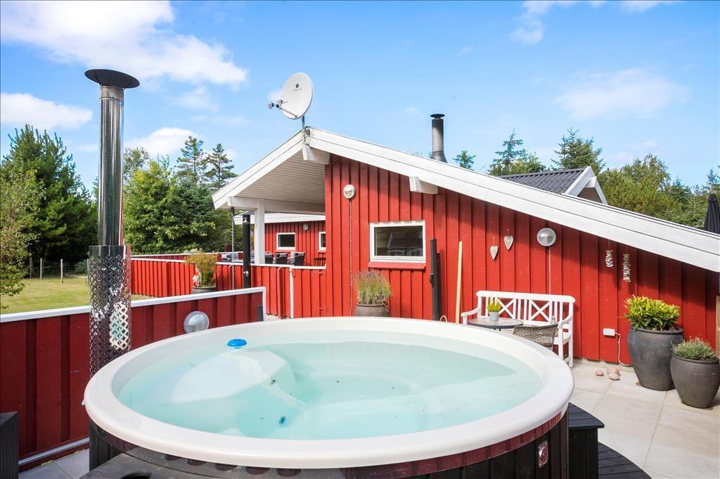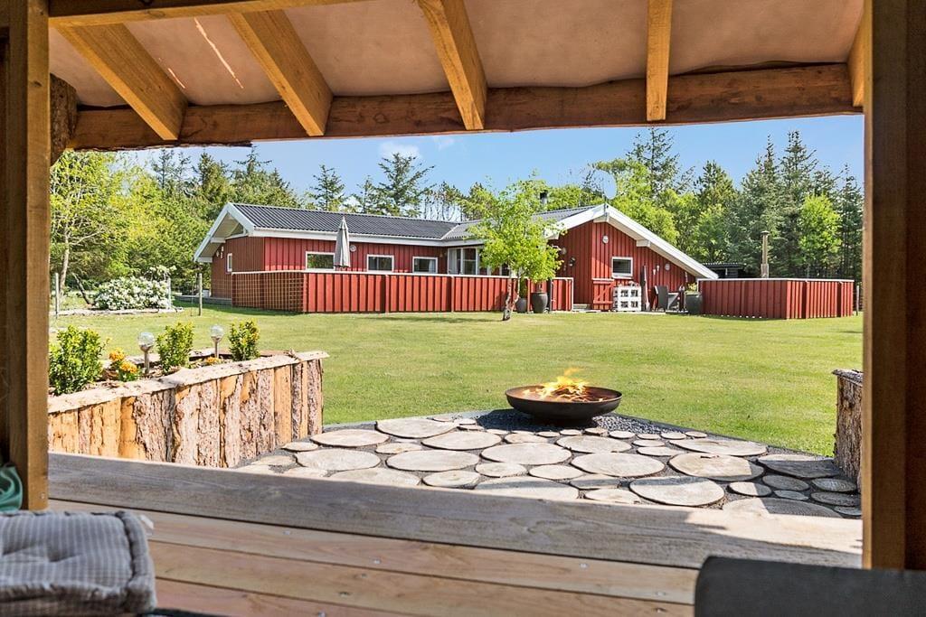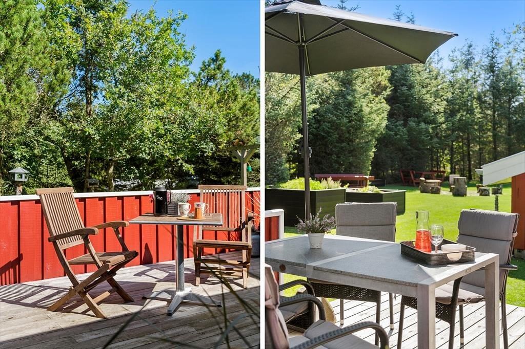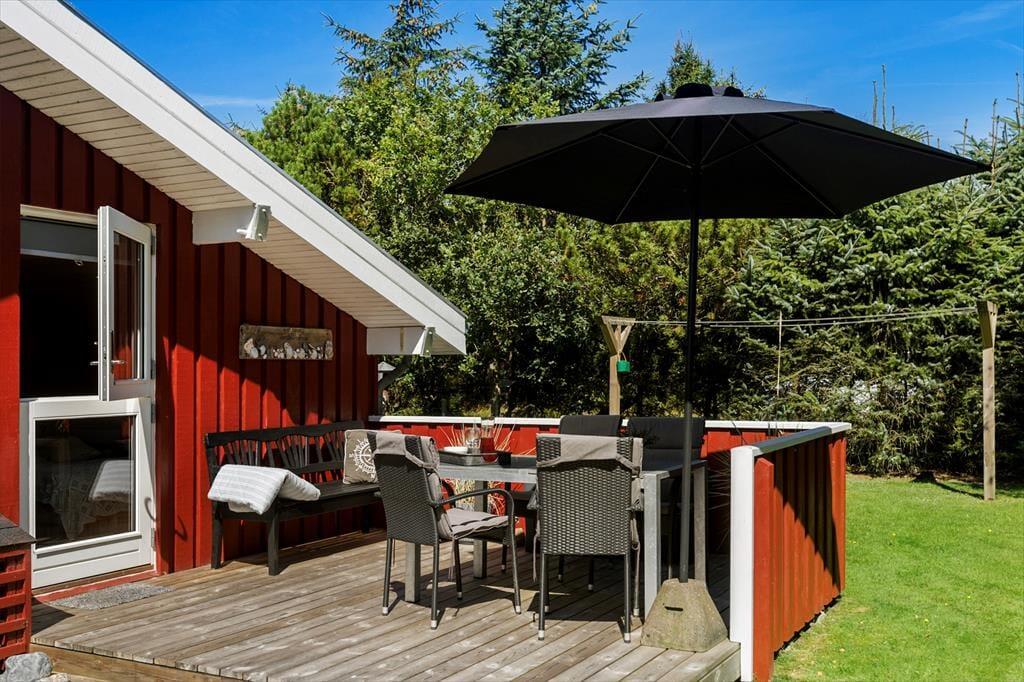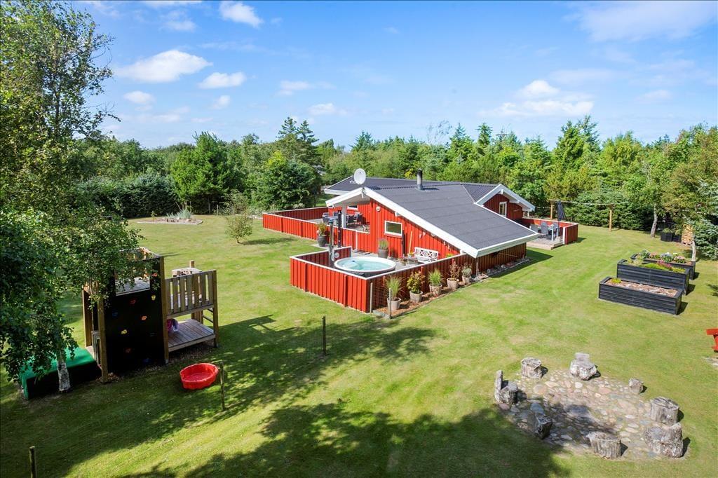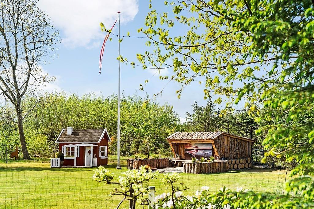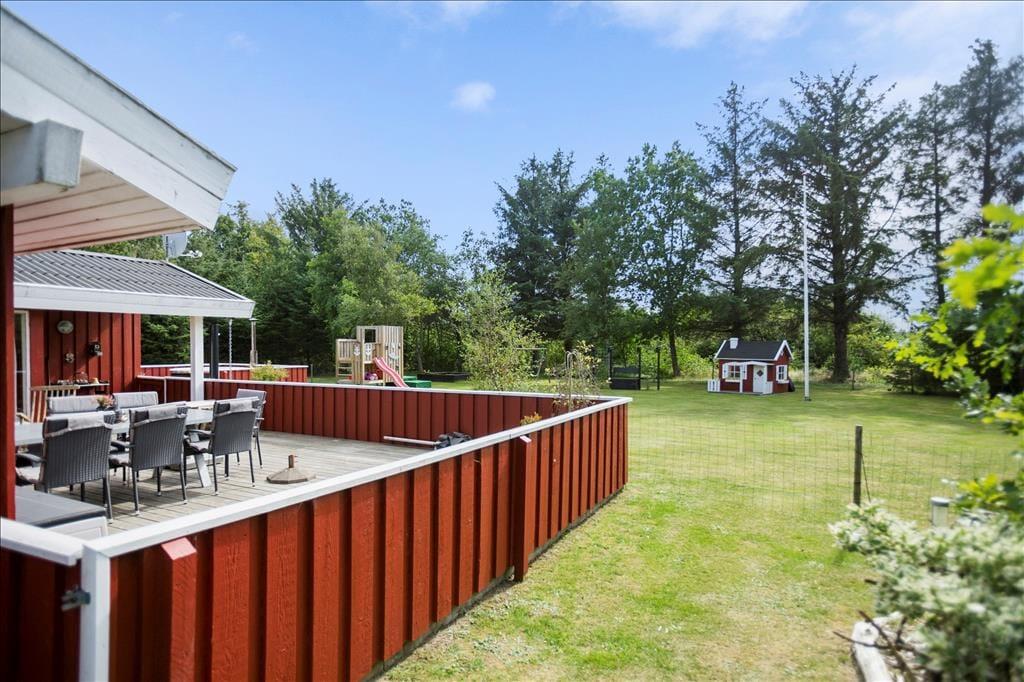 Udenfor venter et skønt terrasseområde, der strækker sig omkring sommerhuset og giver mulighed for både afslapning i solen og beskyttelse mod vinden. På den store grund er der masser af plads til leg, afslapning eller en god middag på terrassen, mens solen går ned. Det er her, du kan udnytte luksusfaciliteterne som vildmarksbadet, hvor du kan varme dig op efter en tur i den friske luft, eller måske nyde natten under stjernerne. Der er også et shelter på grunden, som giver dig en unik mulighed for at overnatte under åben himmel og mærke naturens ro på tæt hold.