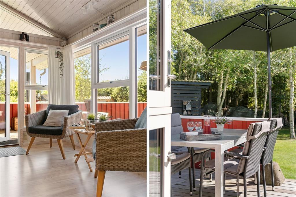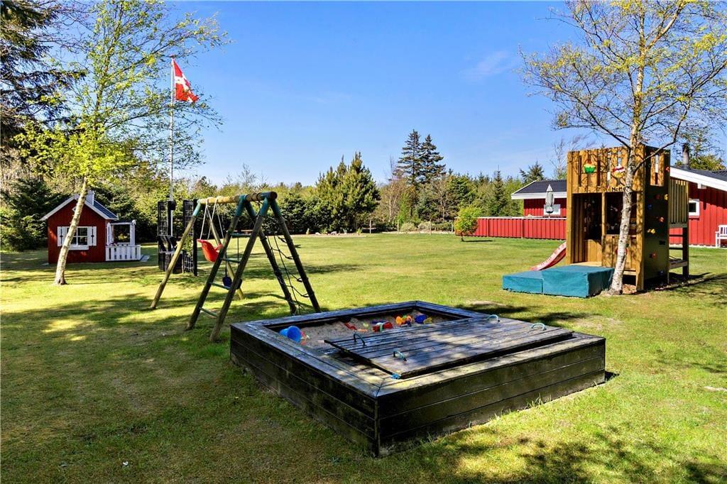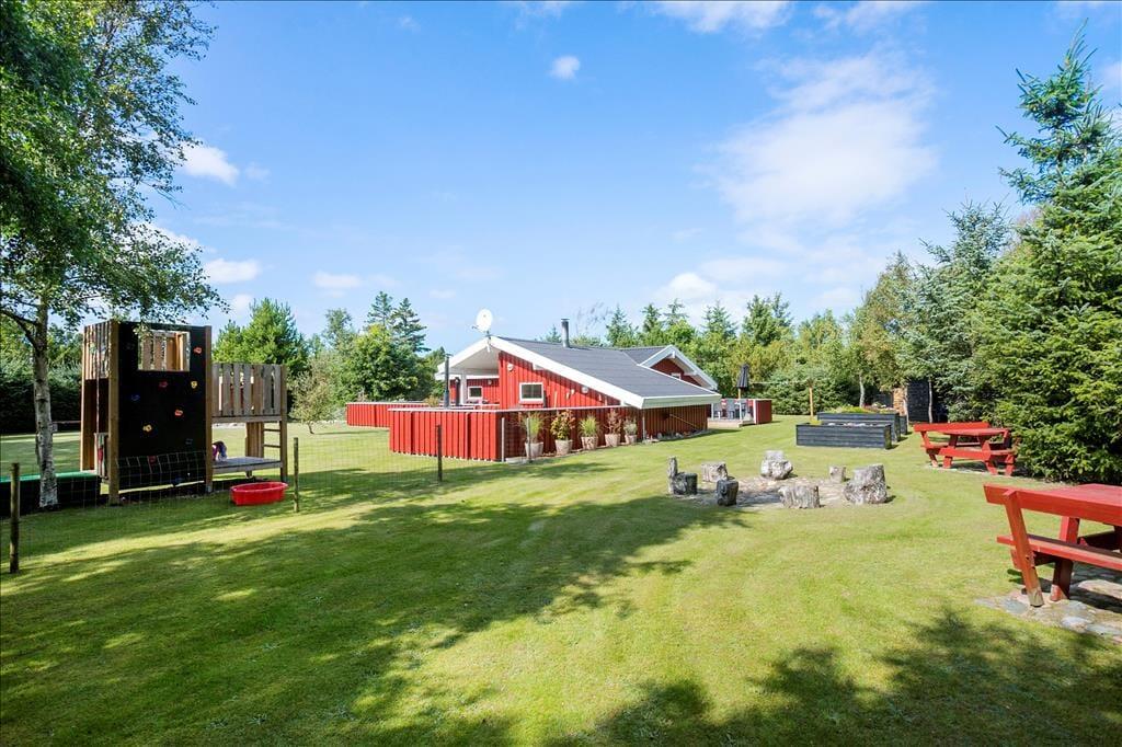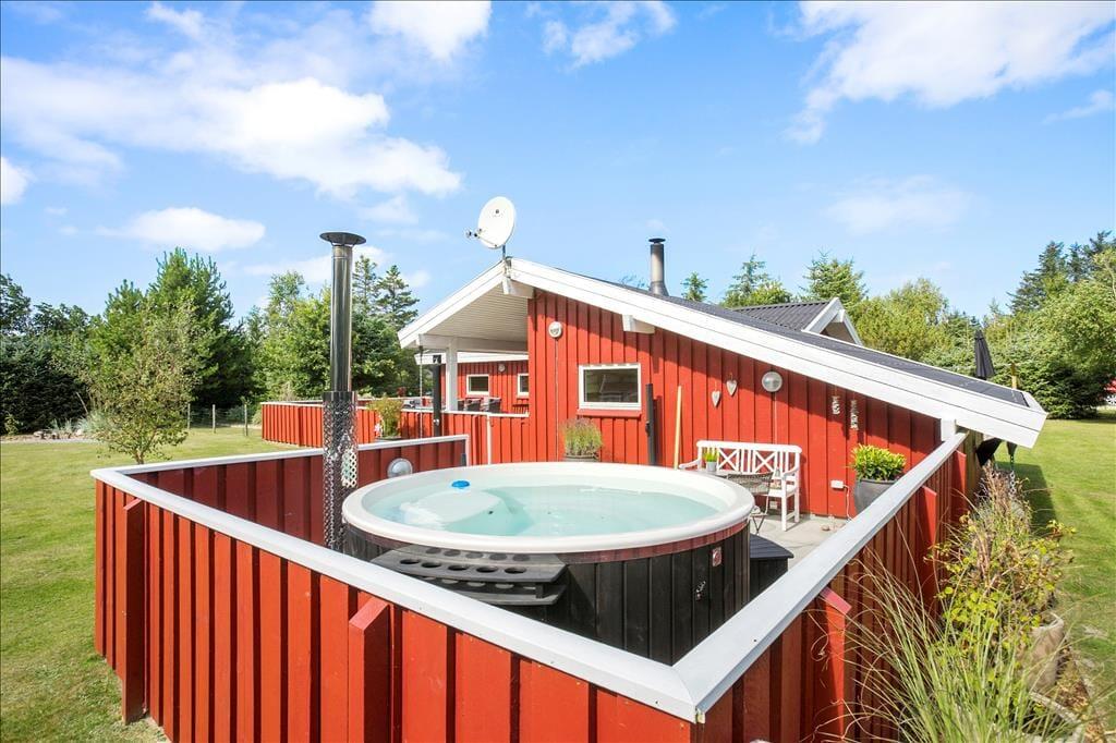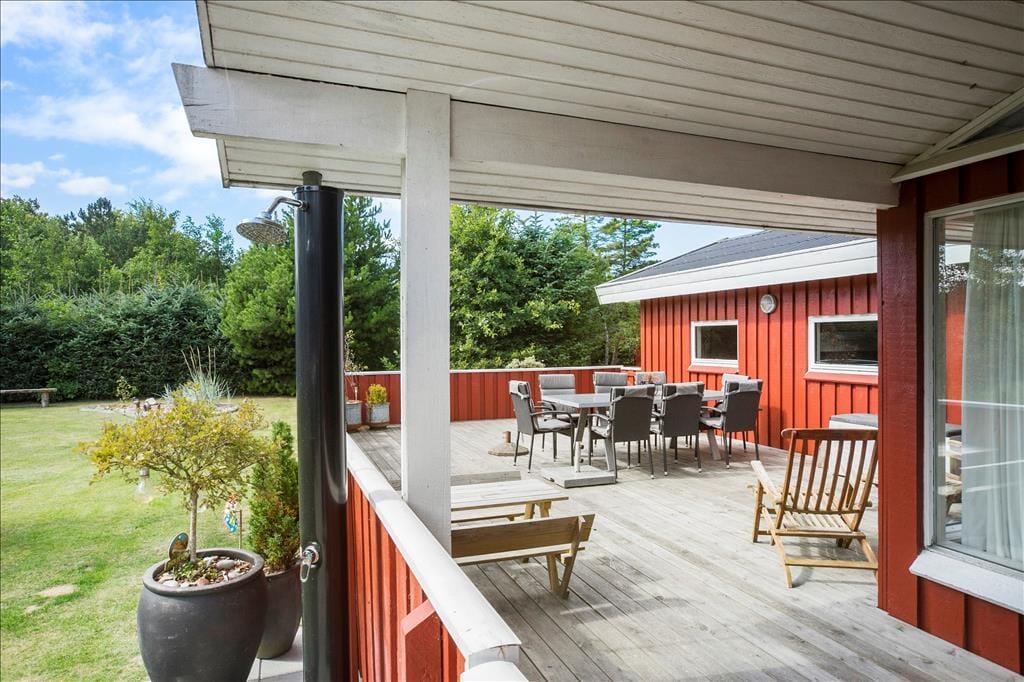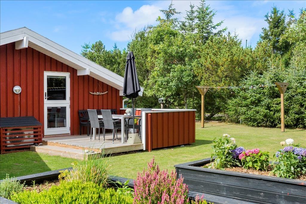 Udenfor venter et skønt terrasseområde, der strækker sig omkring sommerhuset og giver mulighed for både afslapning i solen og beskyttelse mod vinden. På den store grund er der masser af plads til leg, afslapning eller en god middag på terrassen, mens solen går ned. Det er her, du kan udnytte luksusfaciliteterne som vildmarksbadet, hvor du kan varme dig op efter en tur i den friske luft, eller måske nyde natten under stjernerne. Der er også et shelter på grunden, som giver dig en unik mulighed for at overnatte under åben himmel og mærke naturens ro på tæt hold.