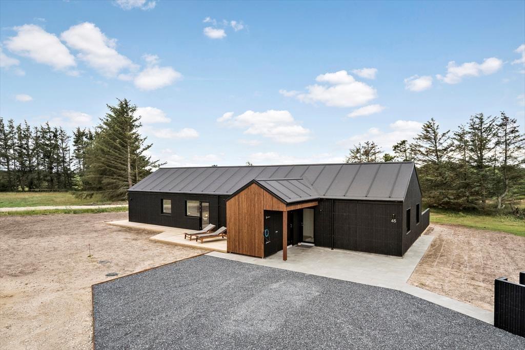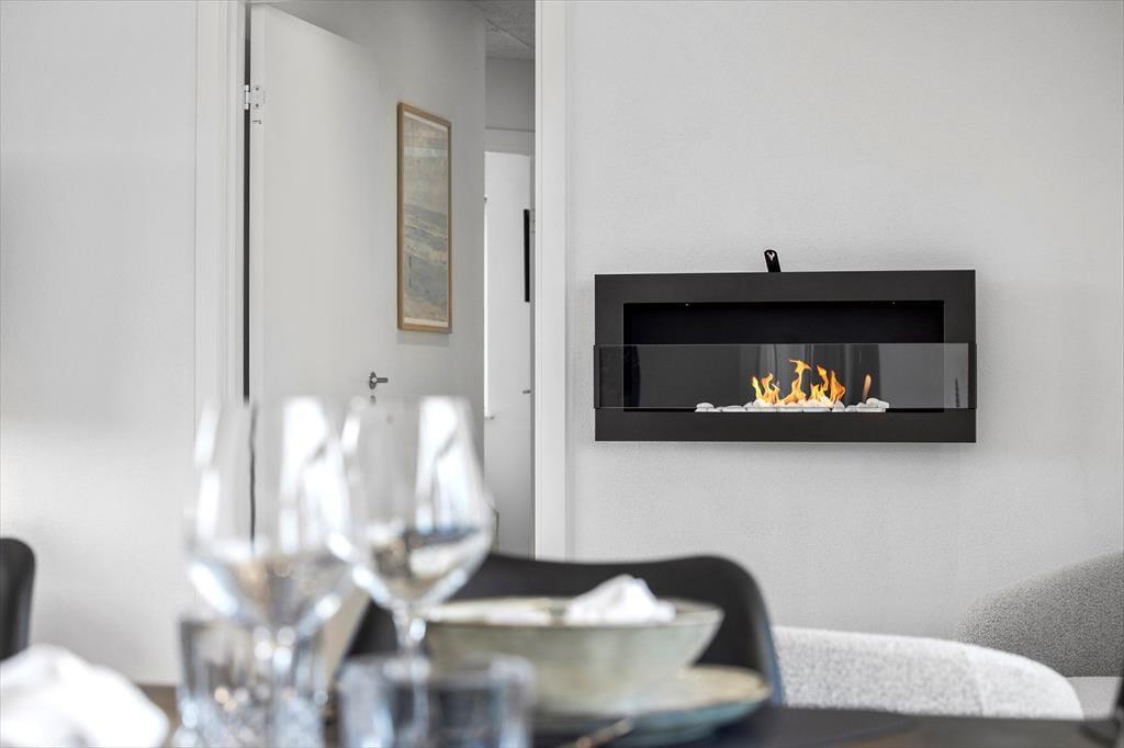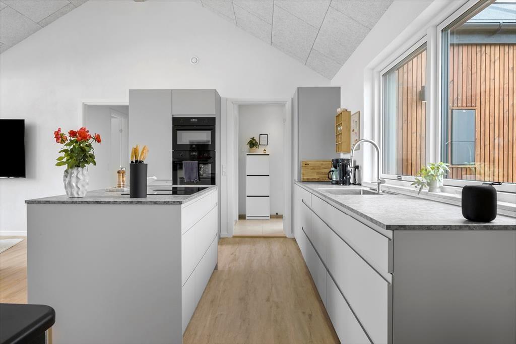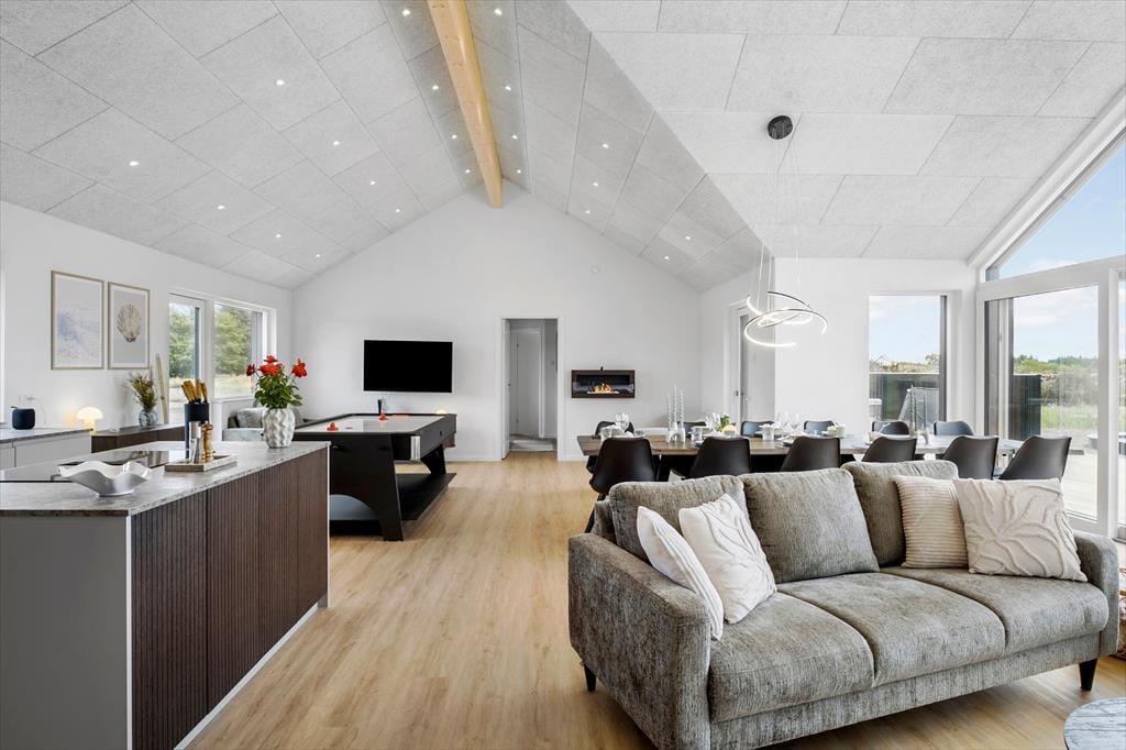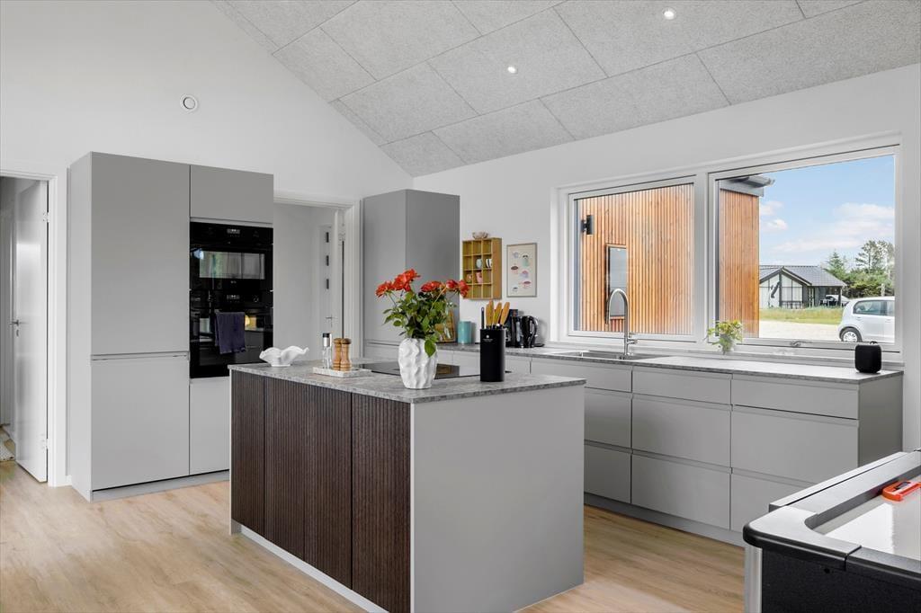 Træd ind i dette indbydende og nybyggede sommerhus på Vesterhavsletten 45 i Saltum – et moderne feriehus, hvor lys, luft og lækre materialer sætter stemningen fra første øjeblik. Hjertet af huset er det store opholdsrum med åbent køkken, spiseplads og stue i ét – perfekt til lange feriedage med samvær, grin og god mad. Køkkenet indbyder til madlavning med hele familien, mens samtaler og småsnak flyder frit ved spisebordet. Efter middagen kan du synke ned i sofaen og nyde flammerne fra den stemningsfulde biopejs, der med ét tryk spreder både varme og hyggelig atmosfære – helt uden røg eller aske. Indretningen er stilren og enkel med sans for detaljer, og husets mange vinduespartier trækker naturen med ind og gør det let at følge dagens skiften fra stue og køkken.