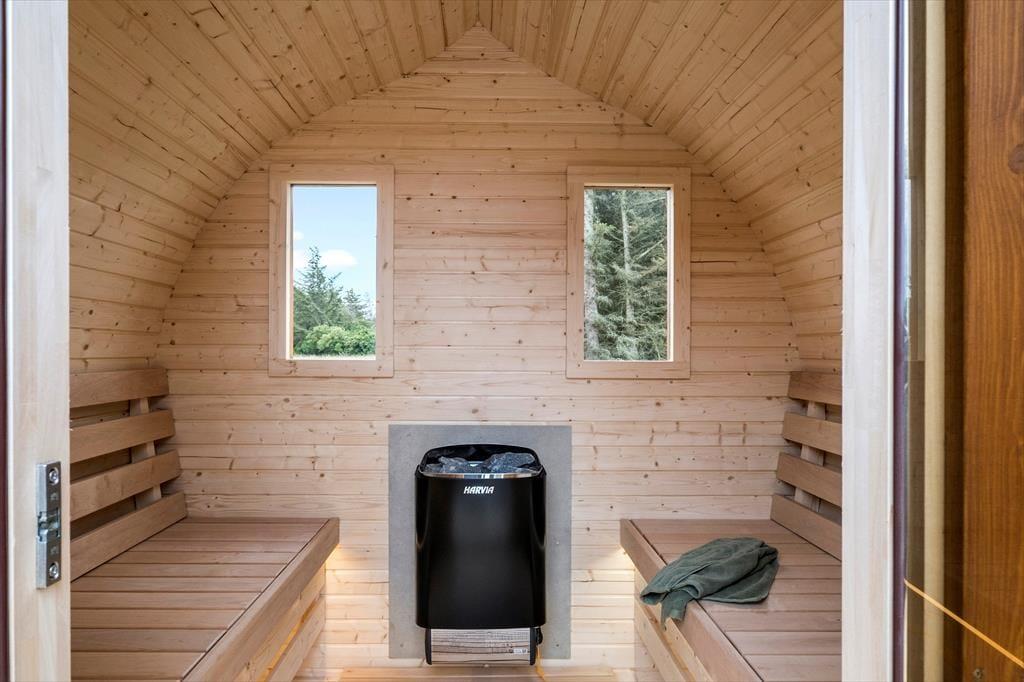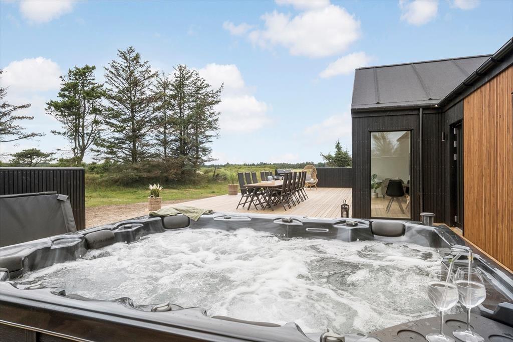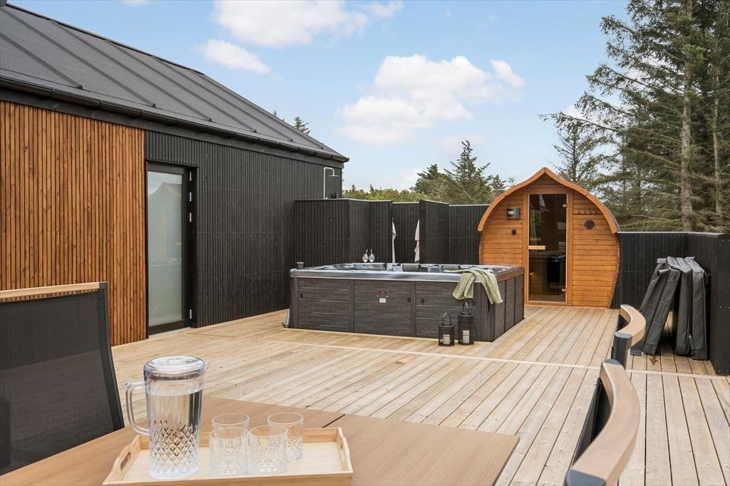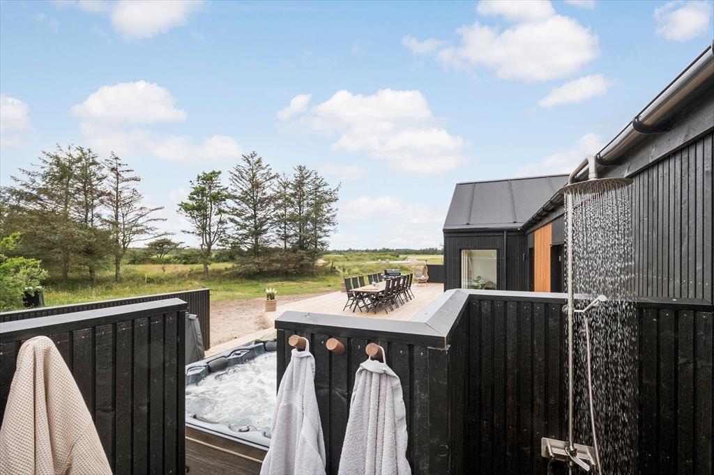 Udenfor venter den perfekte ramme om feriedagene – her er der plads til både afslapning, forkælelse og samvær. På den store sydvestvendte terrasse kan du slappe af i det varme, boblende vand i udespaen eller tage en svedig tur i saunaen efter en lang dag ved stranden. En udendørs bruser gør det nemt at skylle salt og sand væk, og de mange forskellige kroge på terrassen giver dig mulighed for at vælge netop din yndlingsplads, hvad end du søger morgensol, eftermiddagsskygge eller en lun aftenplads under stjernerne. Her er skabt et moderne udeliv med komfort og æstetik i højsædet – fra lækroge og loungesæt til havemøbler, hvor du kan sidde længe ude.