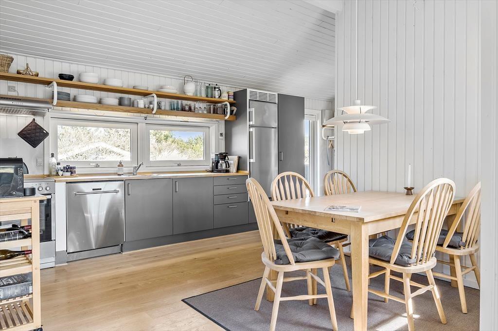 Indenfor bydes du velkommen til et lyst og indbydende sommerhus, hvor hyggen er i højsædet. Stuen er den naturlige samlingspunkt med en brændeovn, som spreder varme og stemning på de kølige aftener. Her kan du og dine nærmeste slappe af i den hyggelige indretning med bløde møbler og et åbent rum, der indbyder til både afslapning og samvær. Det åbne køkken gør det nemt at tilberede lækre måltider sammen, og der er masser af plads til at nyde både måltider og spil med familien. De tre soveværelser giver god plads til at hvile efter en aktiv dag og er indrettet med varme farver og en behagelig atmosfære.