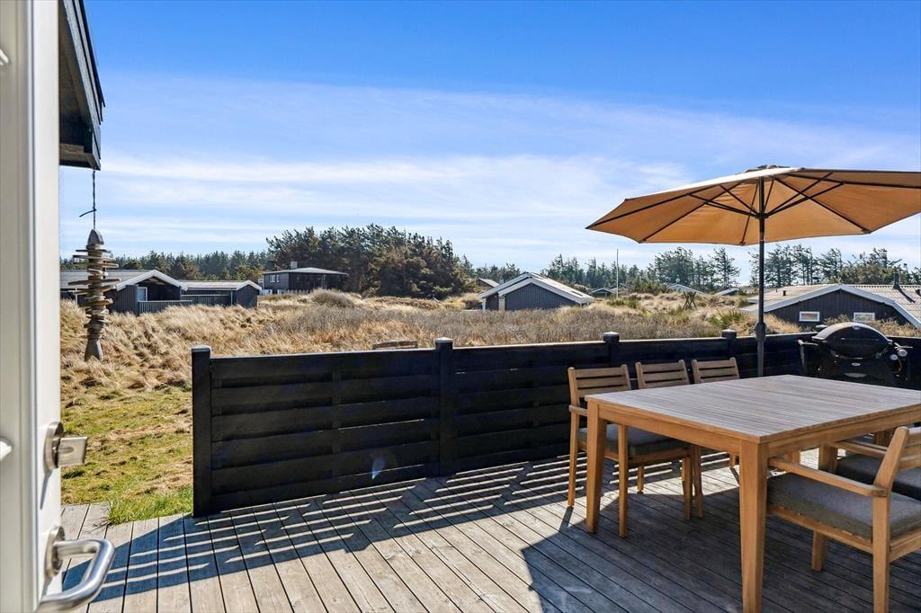 Terrassen er uden tvivl et af sommerhusets højdepunkter. Her kan du starte dagen med en friskbrygget kop kaffe, mens du lader blikket glide ud over Vesterhavet, der ligger blot en kort gåtur væk. Når solen står højt på himlen, er terrassen et dejligt sted at slappe af i havemøblerne, og om aftenen kan du tænde grillen og nyde en middag under åben himmel, mens bølgernes brusen sætter stemningen. Grunden omkring huset er enkel og let at holde, så du kan koncentrere dig om det vigtigste: at nyde roen, udsigten og ferien i fulde drag.
