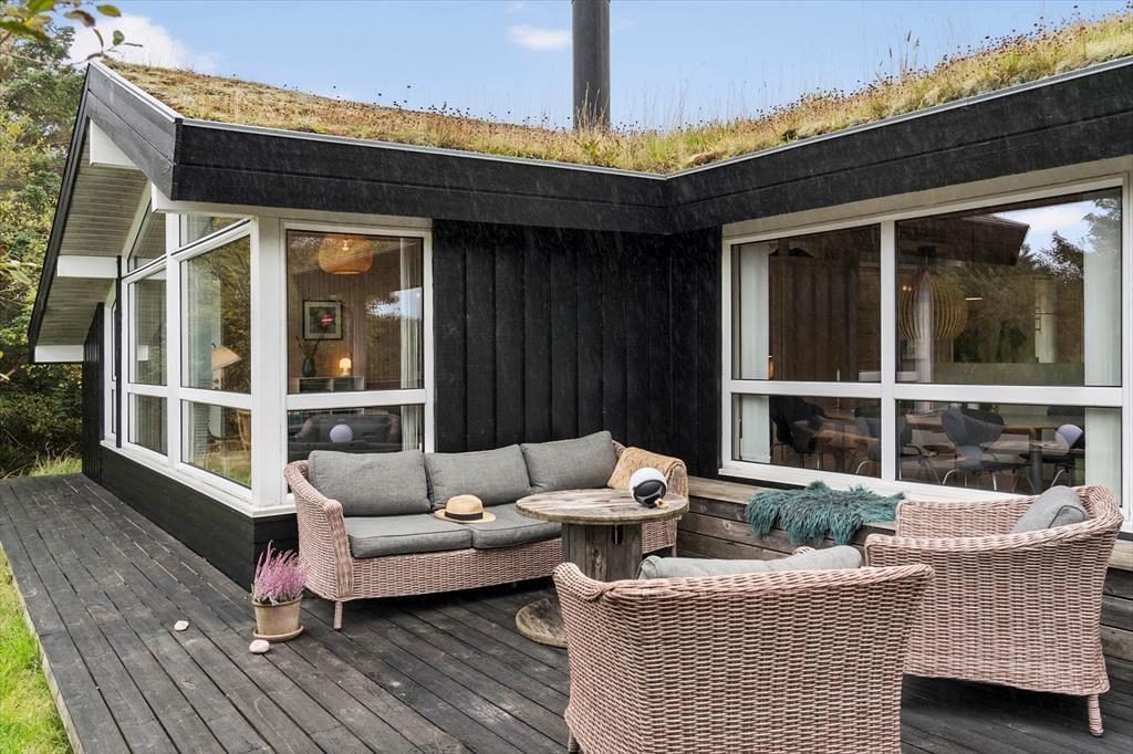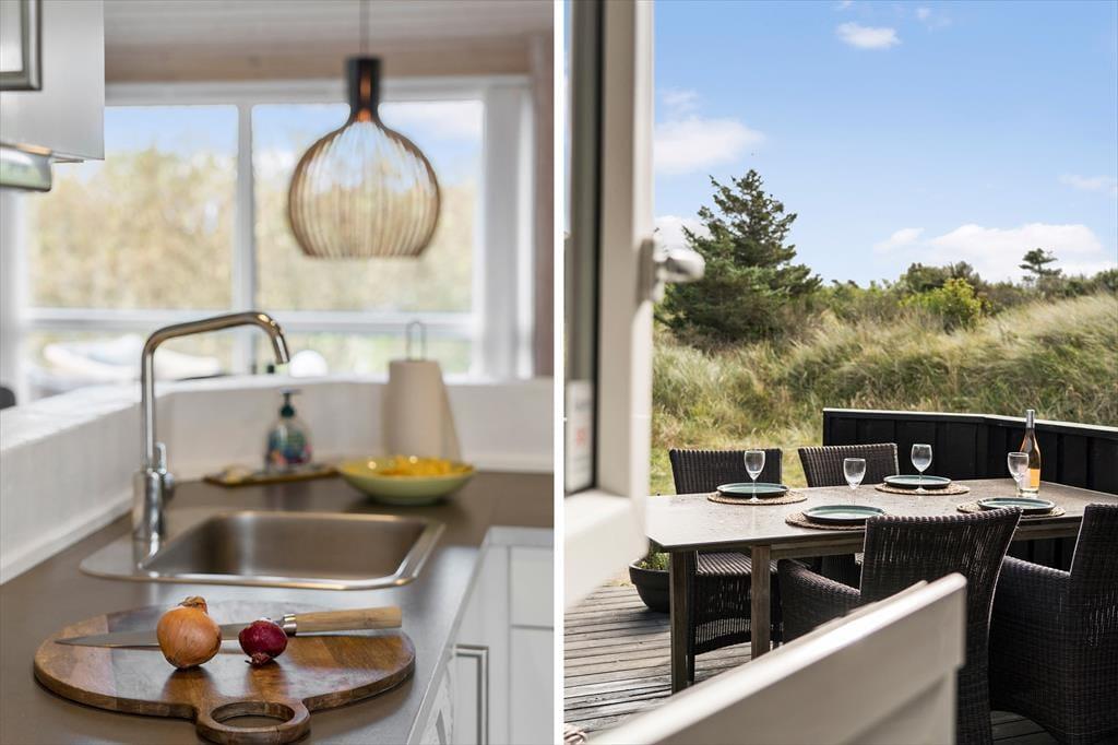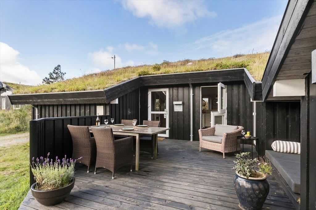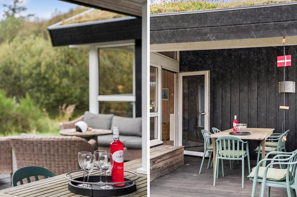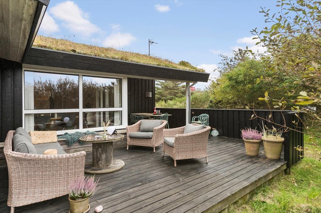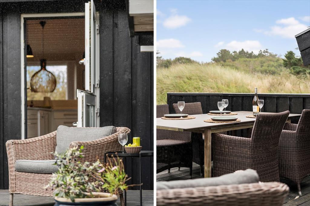 Udenfor venter den skønne terrasse, som indbyder til solrige dage med afslapning og hygge. Her kan du nyde morgenkaffen med udsigt til 'Lille Norge', som nærmest strækker sig helt op til husets baghave. Terrassemiljøet giver rig mulighed for at finde en god solplads, og med den korte gåafstand til stranden kan du nemt skifte mellem afslapning ved huset og forfriskende dukkerter i Vesterhavet. Efter en lang dag ved stranden kan du tænde op i grillen og nyde en dejlig middag under åben himmel, mens solnedgangen farver himlen.