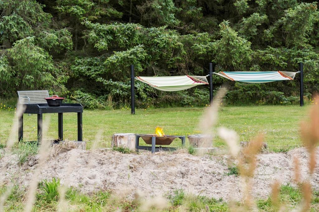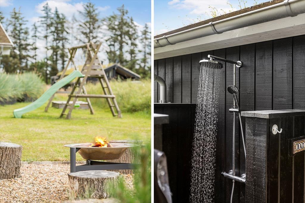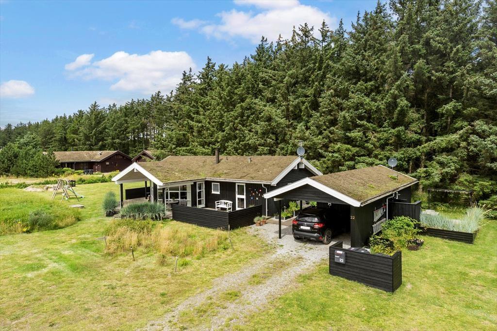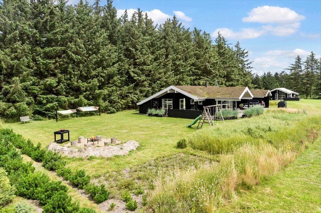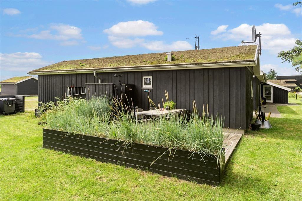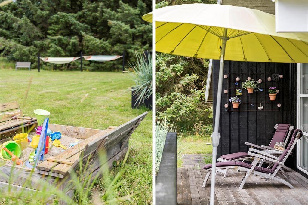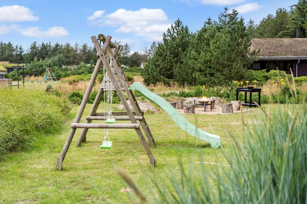 På den store naturgrund er der plads til leg og boldspil, og med gynge, rutchebane og sandkasse skal timerne nok gå hurtigt for børnene. Der er træterrasse om 2/3 af huset, en del er overdækket, og med læhegn forskellige steder er det altid muligt at finde læ for Vestenvinden. Bilen kan stå trygt og godt i den overdækkede carport.