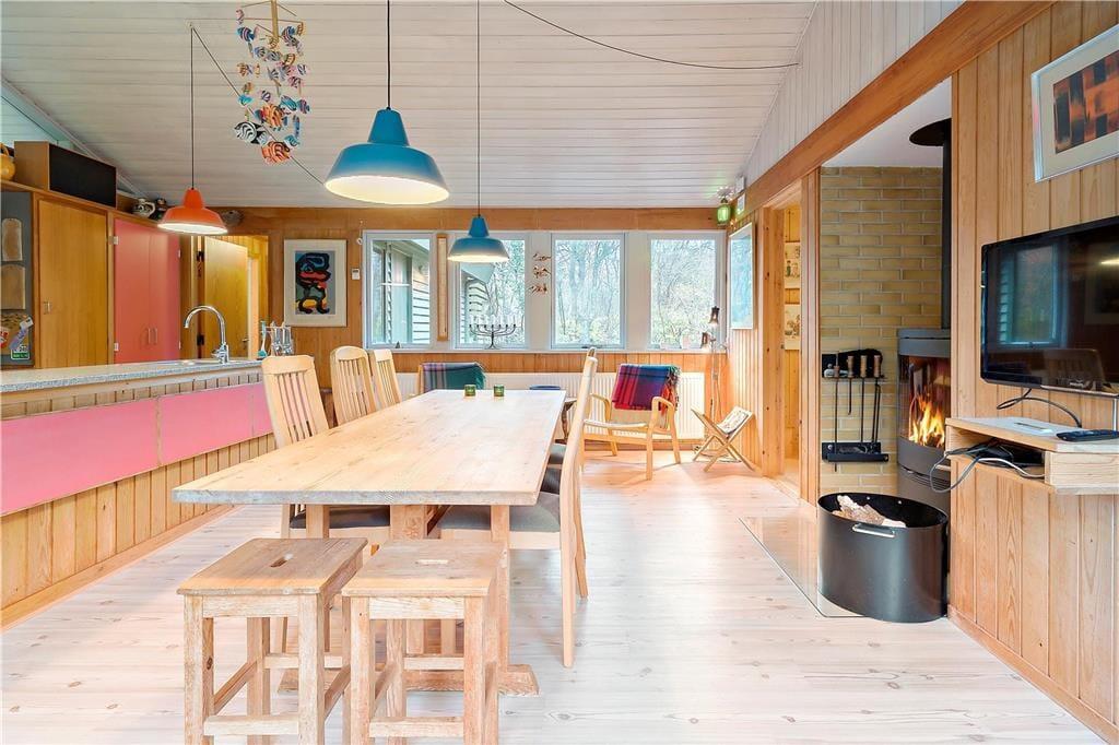 Huset er tegnet af en arkitekt, og man mærker, at der er lagt vægt på rummelighed og funktionalitet i processen. Der er således 4 soverum og to badeværelser, begge med bruser, og dagligdagen kan sagtens fungere med flere familier sammen. Det store køkken har alle tænkelige og moderne hjælpemidler og hænger sammen med spisepladsen, hvor man kan samles til måltiderne eller tage brætspillene frem. Desuden også brændeovn og tv her. I pejsestuen er endnu et tv og en åben pejs, her kan man sidde og lytte til træets knitren i varmen, mens man nyder udsigten over den store og parklignende grund. Endelig er her frit internet (WI-FI) og en wii-spillekonsol med tilhørende sportsspil.