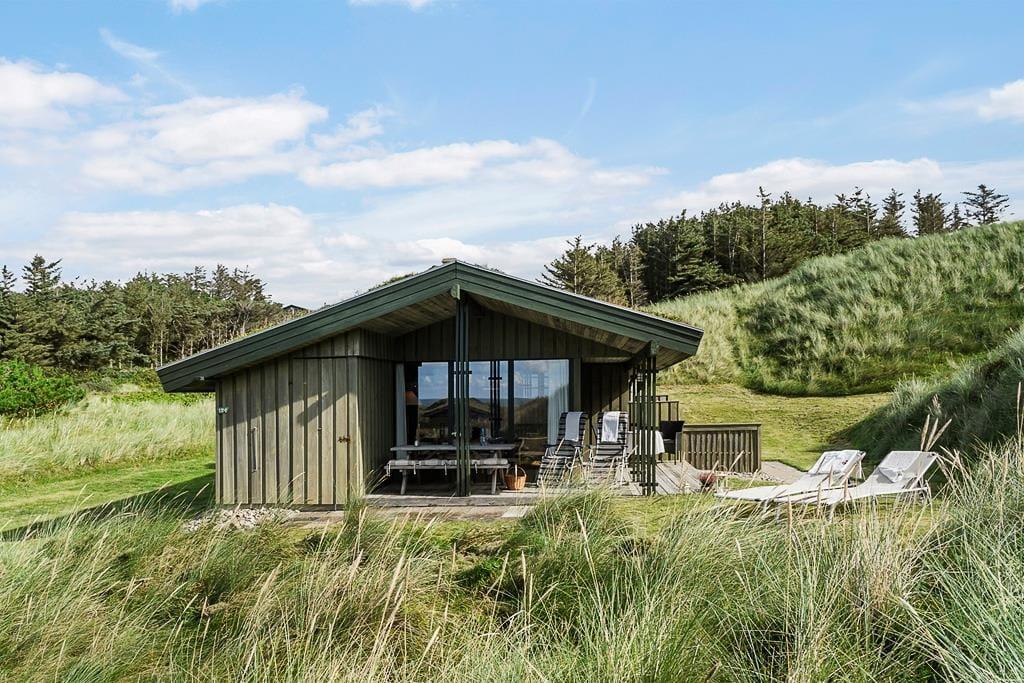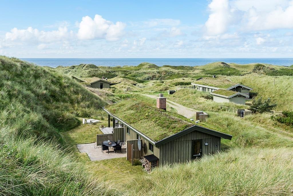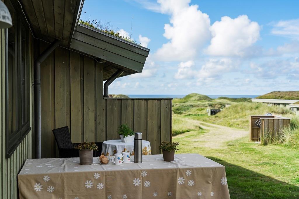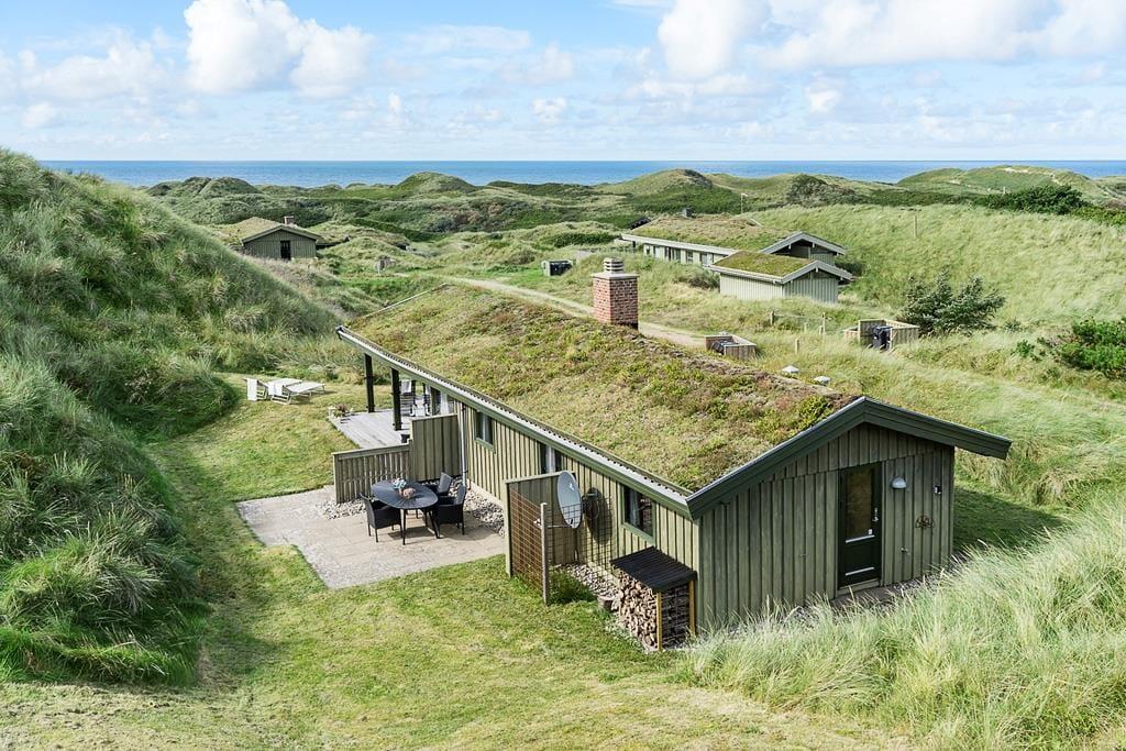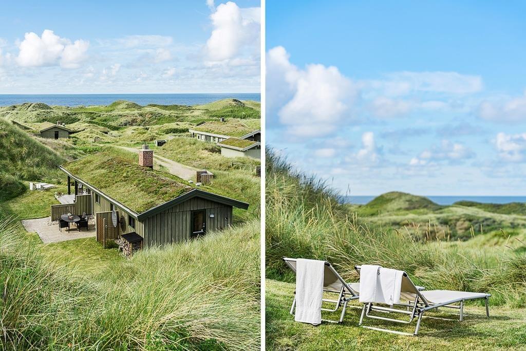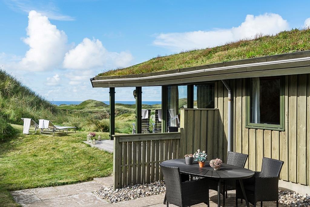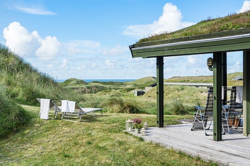 Sommerhuset ligger på en stor naturgrund med klitter, marehalm og god plads til at boltre sig. Grunden har en højdeforskel på op til 15 meter, og kravler I op på toppen af den højeste klit, får I en fantastisk udsigt over sommerhustage, det rå naturlandskab og det uendeligt store hav. Det er ikke tilladt med udendørsbelysning, blomsterkummer, hegn osv., så når I sidder på terrasserne kan I nyde et helt uspoleret kig til de smukke omgivelser og på sommeraftenerne også en helt formidabel solnedgang.