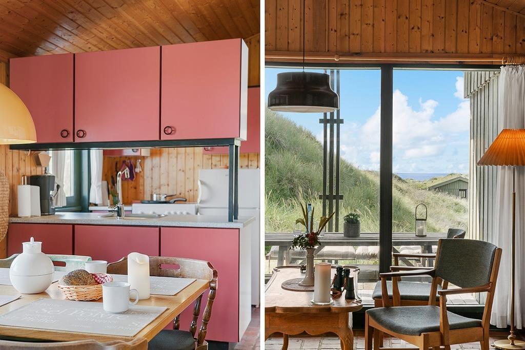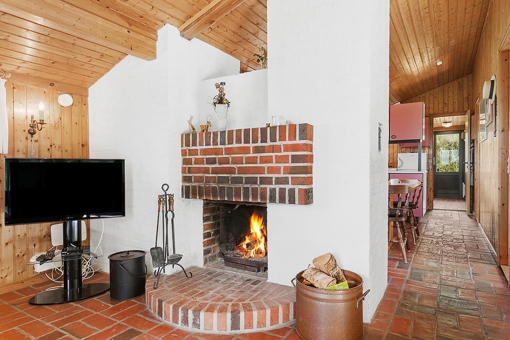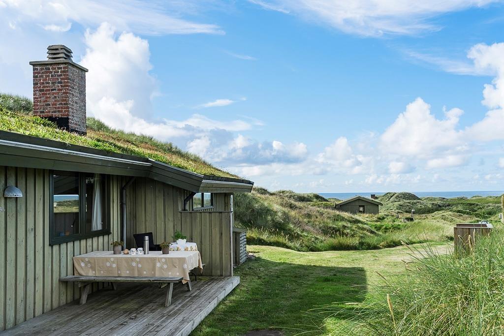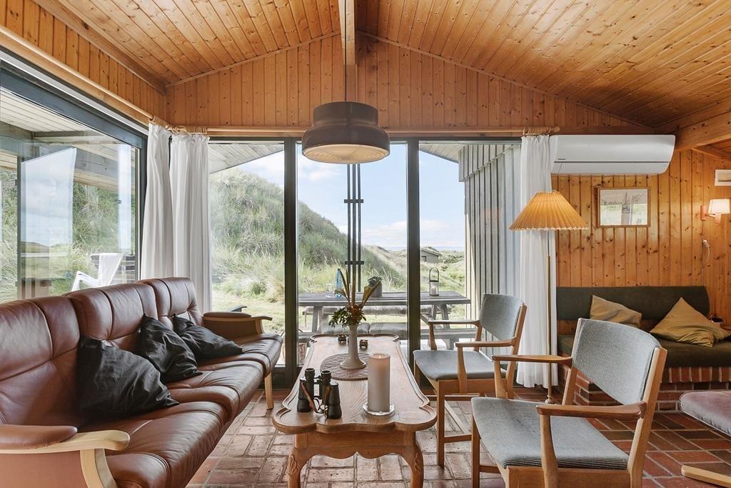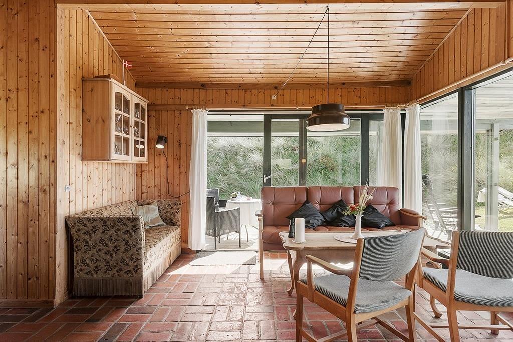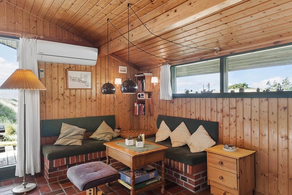Dette sommerhus er opført i 1975 og stilen fra denne tid er flot bevaret i form af trævægge, murstensgulve, en sofa bygget op af sten, klassiske kakler på badeværelset og en del originale møbler fra samme periode. Alt er velholdt og velfungerende, og med seks sovepladser kan I sagtens være en stor familie her. Sommerhuset består af tre værelser, badeværelse med bruser, køkken og et opholdsrum med en helt fantastisk udsigt til klitterne og Vesterhavet, som kun ligger 300 meter væk. På en kold dag kan I tænde op i pejsen og bruge dagen på indendørs hygge med læsning, kortspil og varm kakao. Alle sommerhuse i området er underlagt strikse regler for at bevare den smukke natur, eksempelvis skal tagene være belagt med græstørv for at falde naturligt ind i omgivelserne, og I skal derfor ikke vælge dette hus, hvis I leder efter luksus og mange moderne faciliteter, men sætter I pris på ro, afslapning og den gode, gammeldags feriestemning, så er I kommet til det helt rette sted.