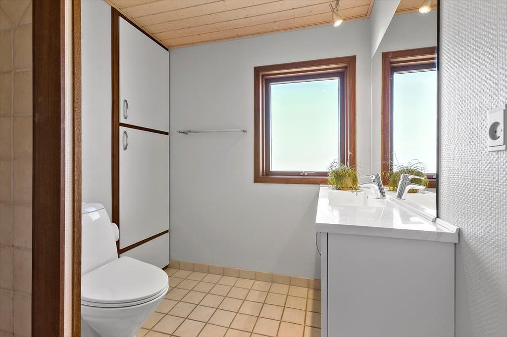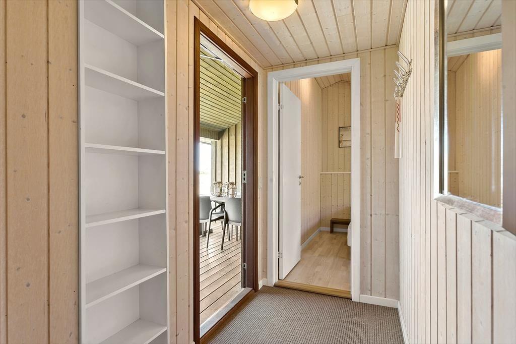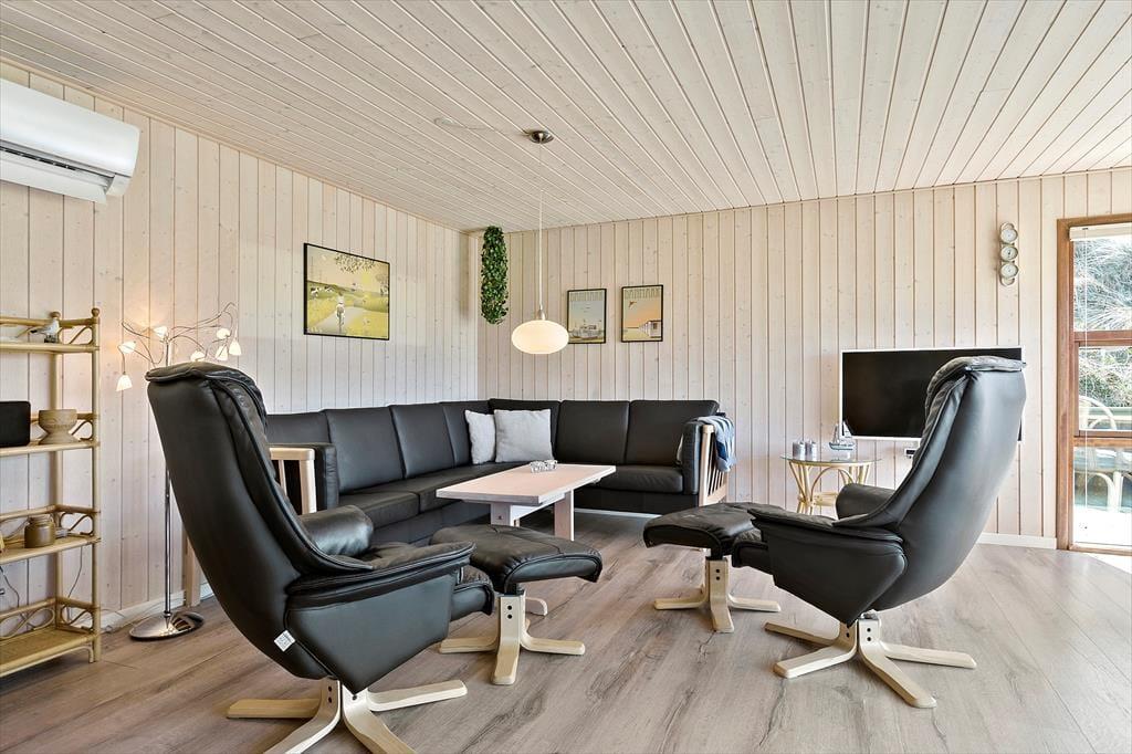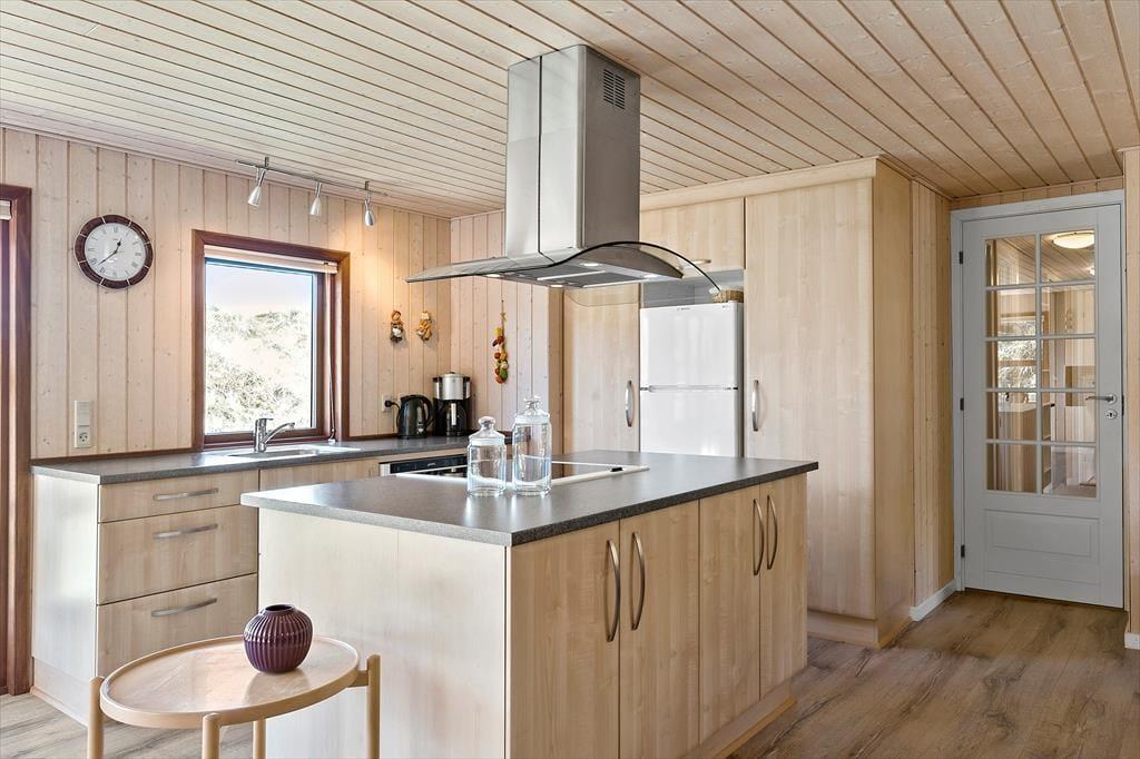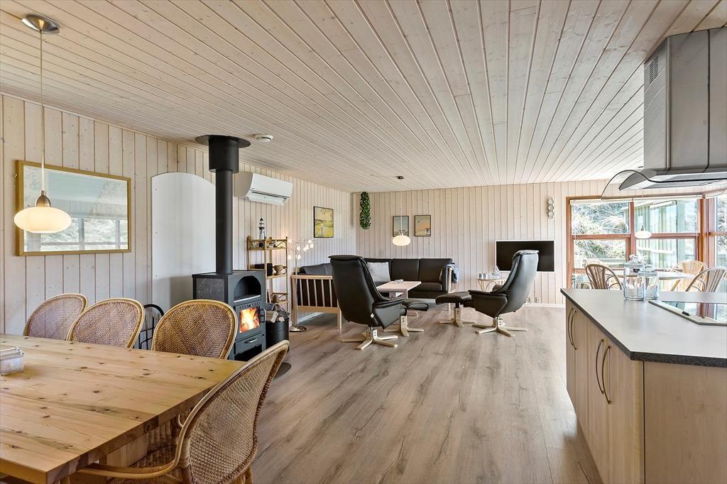 Som du træder ind i sommerhuset, bliver du mødt af et åbent og lyst køkken- og opholdsrum. Her er der god plads til samvær og afslapning, og de store vinduespartier lader solen strømme ind i rummet, så du altid føler dig tættere på naturen udenfor. Det åbne køkken giver mulighed for at tilberede lækre måltider, samtidig med at du kan være en del af samtalerne, mens andre slapper af i den hyggelige stue. Når mørket falder på, kan I tænde op i brændeovnen og skabe en hyggelig og varm stemning – perfekt til lange vinteraftener med familie og venner.