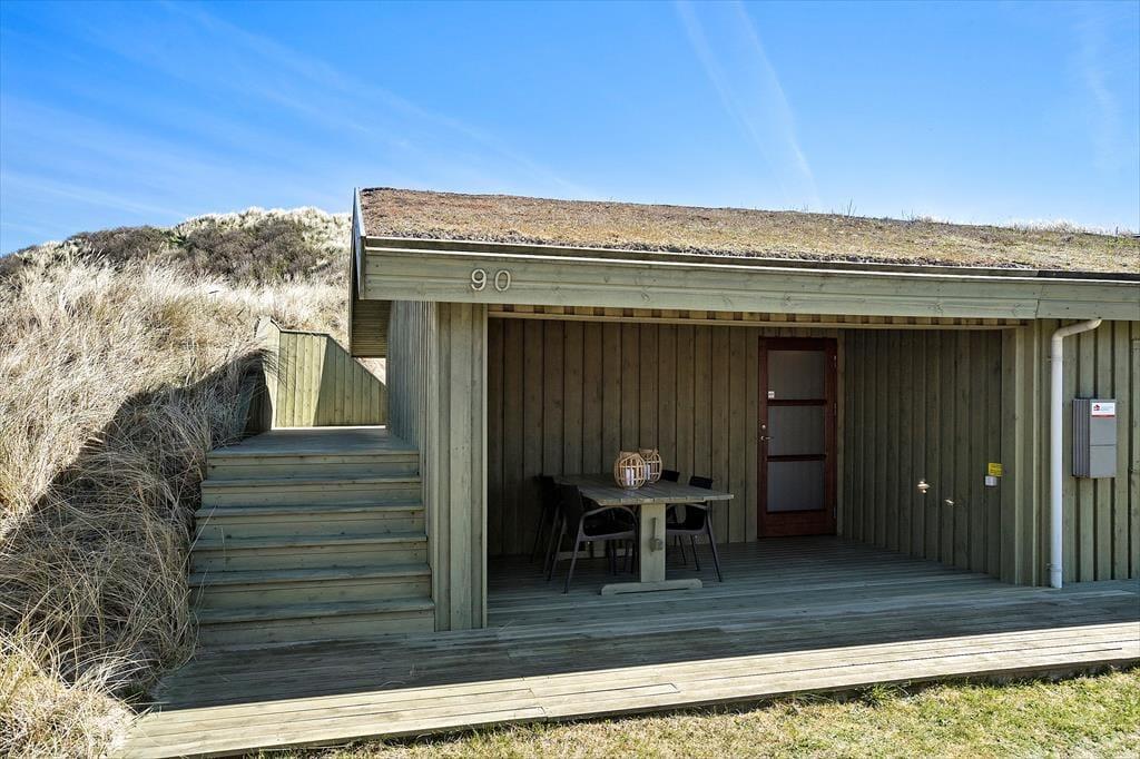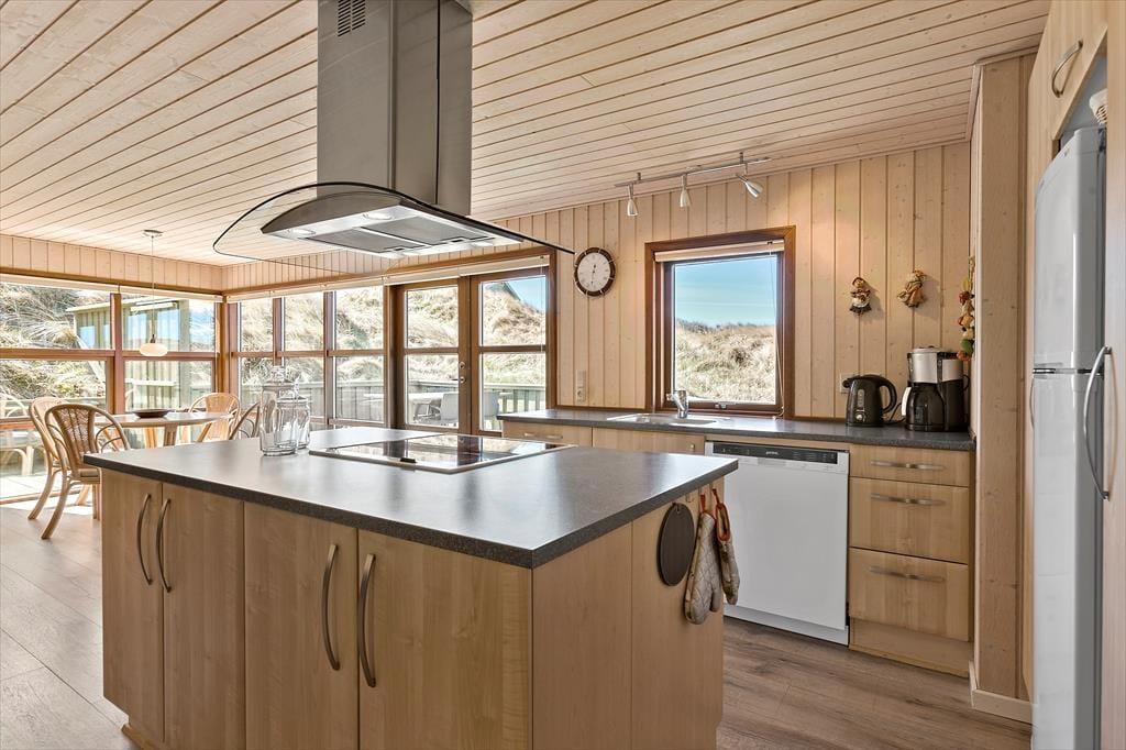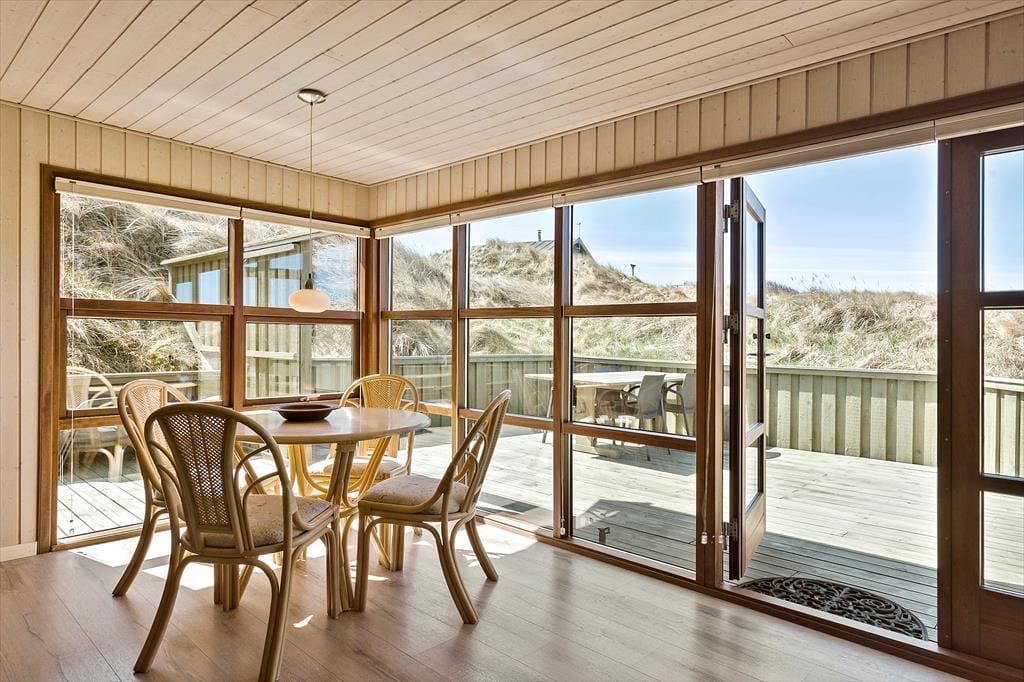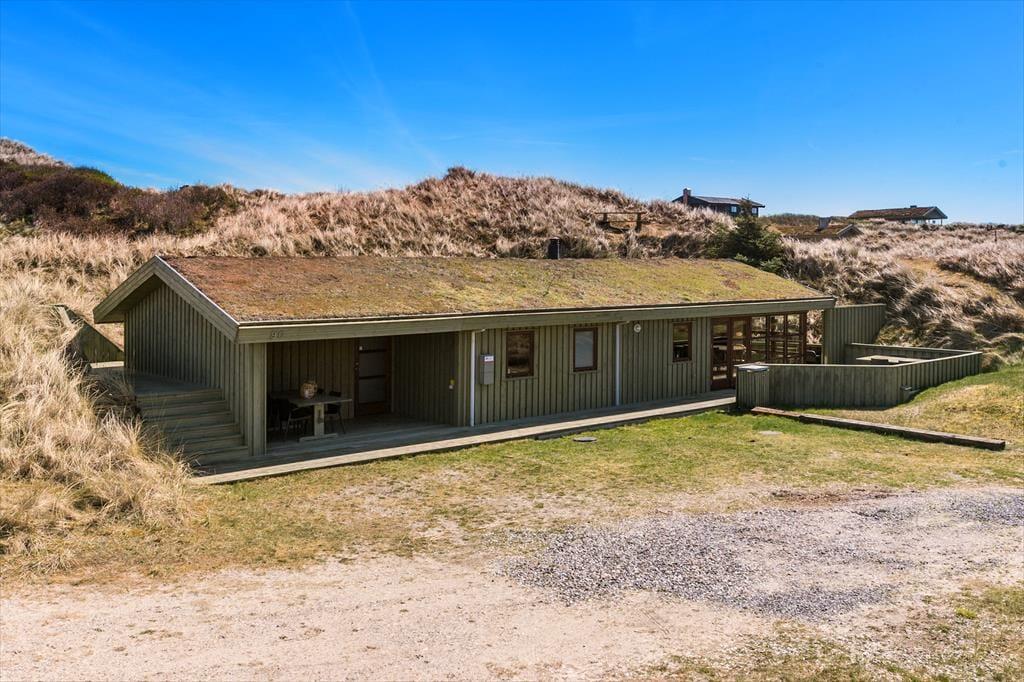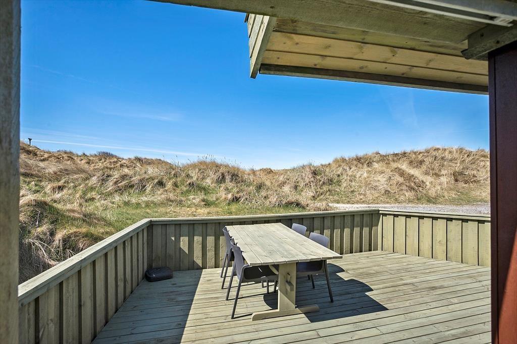Huset ligger på en naturgrund omgivet af klitter, og her kan du virkelig mærke naturens nærvær. Når vejret tillader det, kan du træde ud i den friske luft og nyde den rolige atmosfære omkring huset. Den store terrasse er det ideelle sted at sidde og tage et hvil efter en dag med udflugter i området, eller måske bare lade tankerne flyve, mens du lytter til vinden og fuglene i klitterne. Den lukkede gårdhave gør det muligt at nyde solen i fred og ro, uden at blive forstyrret af vinden. Uanset om du vil sidde stille og nyde stilheden eller tage på en opdagelsesrejse i naturen, er mulighederne mange.