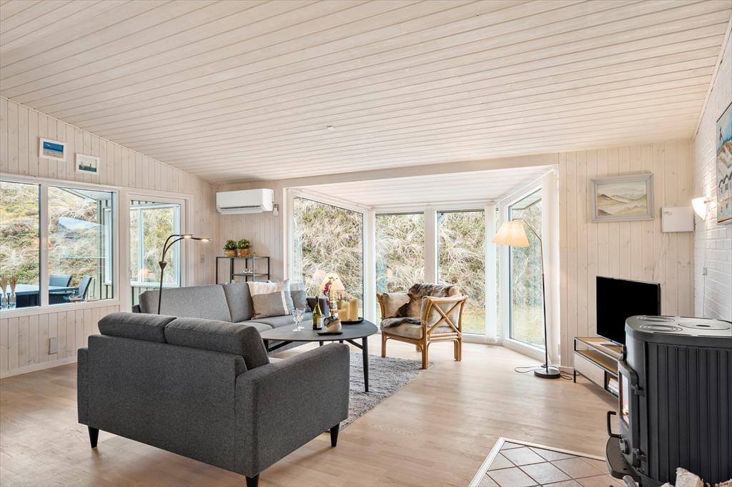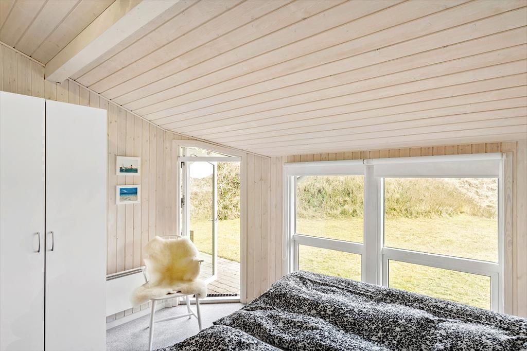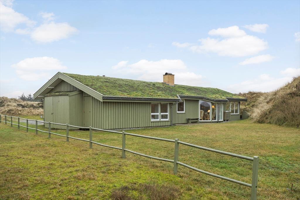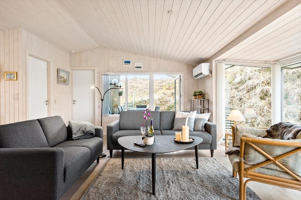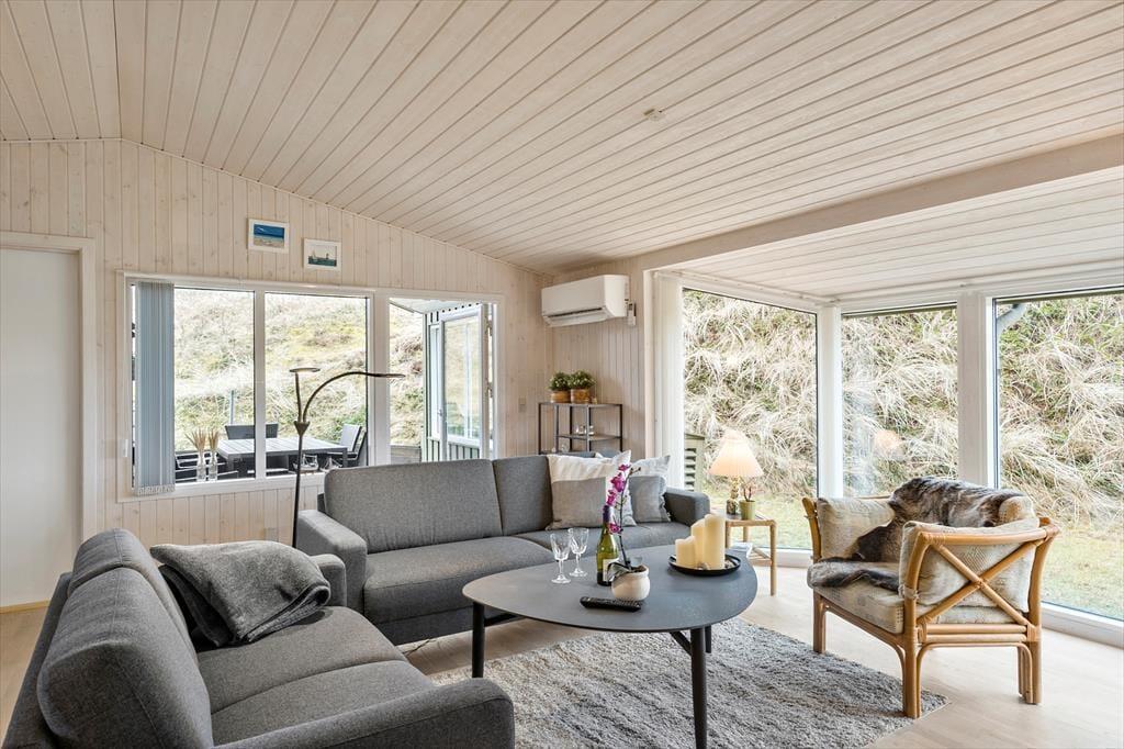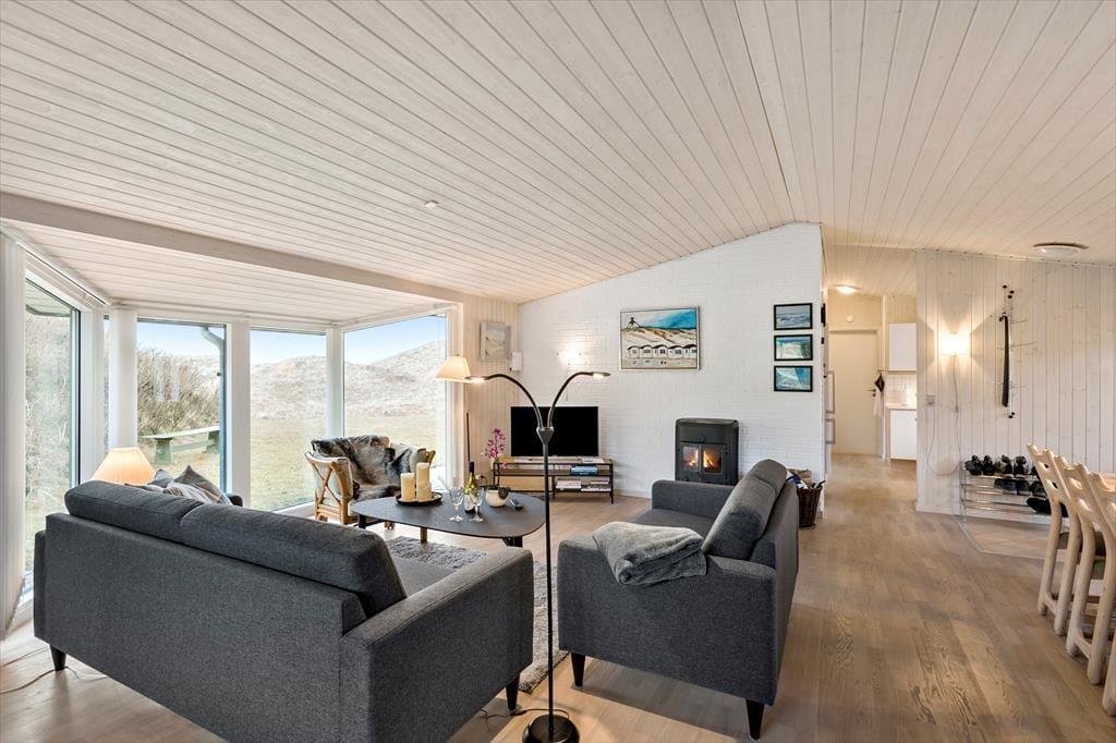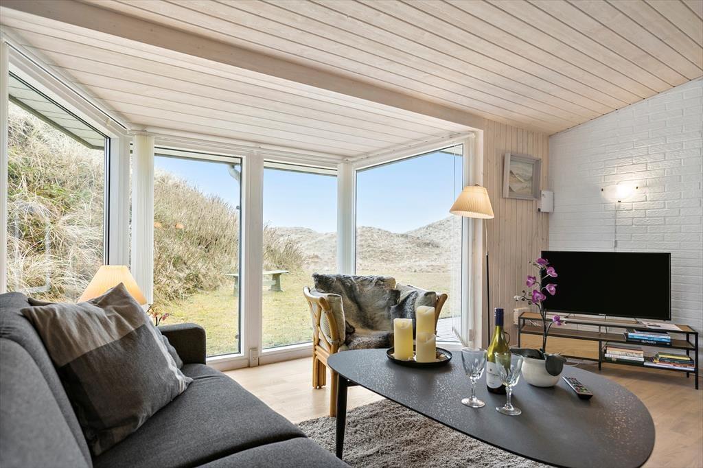 Saltums smukke natur bliver inviteret helt ind i stuen i dette særdeles rummelige og velindrettede sommerhus. Gennem husets vestvendte vinduer kan I se lige ud på klitterne, der står side om side som forvoksede muldvarpeskud, og hvis I går ud og op på den nærmeste klittop, kan I se ud over hele Jammerbugten. Sikke et sted at holde ferie!