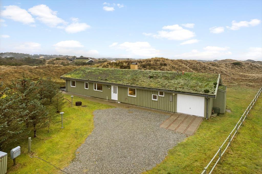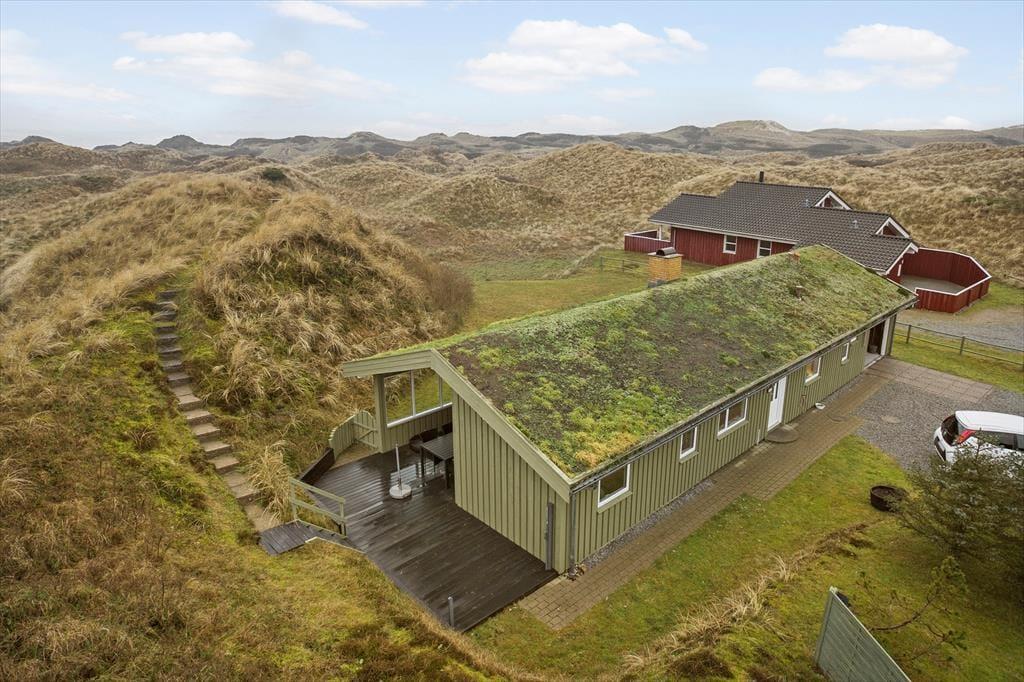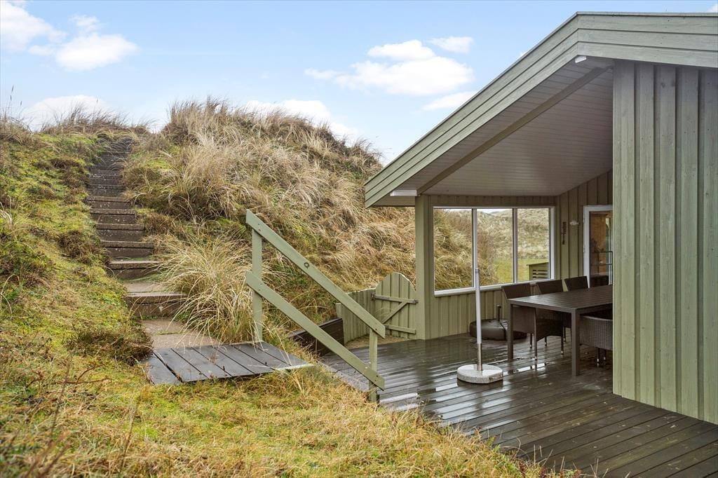 Ude i det fri på den 2500 m2 store klitgrund kan I selvfølgelig også nyde de smukke naturomgivelser. Omkring huset har I plads til leg og boldspil på græsplænen med udsigt til klitterne. Panoramavuet bliver endnu bedre, når I går op på klittoppen, der ligger nærmest huset, for her kan I se langt ud over det kuperede landskab. Klitterne tjener også til et andet godt formål, for på den sydvedte og delvist overdækkede træterrasse sidder I godt i læ, når vinden blæser ind fra havet.