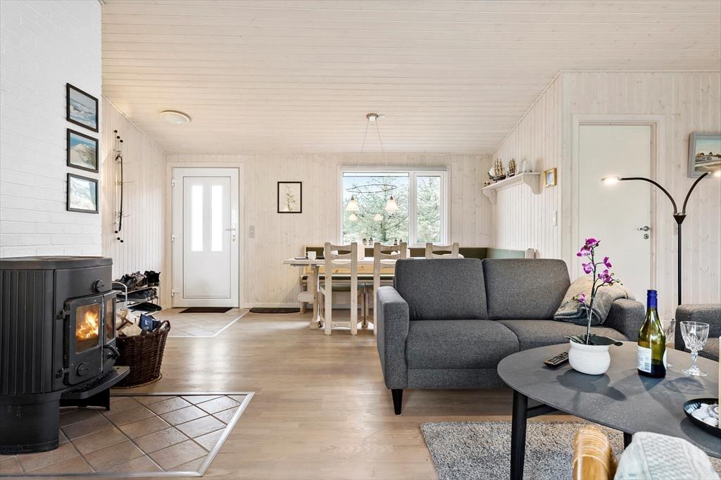 Det 117 m2 store sommerhus har en attraktiv adresse for enden af den lille Koglevej i første række til et kæmpestort, fredet areal, så det forklarer selvfølgelig, hvorfor udsigten er så betagende. Fra stuens karnap kan I se lige ud på klitterne – det gør altså bare hyggestunden med kaffe og avisen endnu herligere, når den foregår i så naturskønne rammer. Den rummelige stue er indrettet med komfortable siddemøbler og en hyggelig spiseplads, og så er der brændeovn, varmepumpe og fladskærms-tv med Chromecast. Et veludstyret køkken ligger i åben forbindelse med stuen, og derudover byder planløsningen på fire gode soveværelser og et stort brusebadeværelse med vaskemaskine, tørretumbler og gulvvarme.
