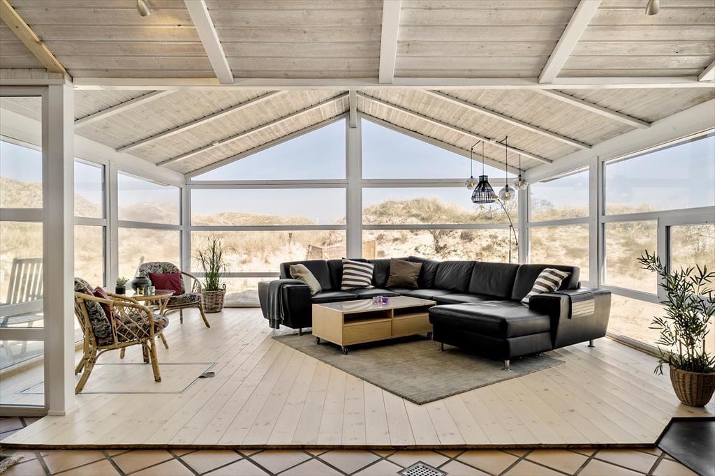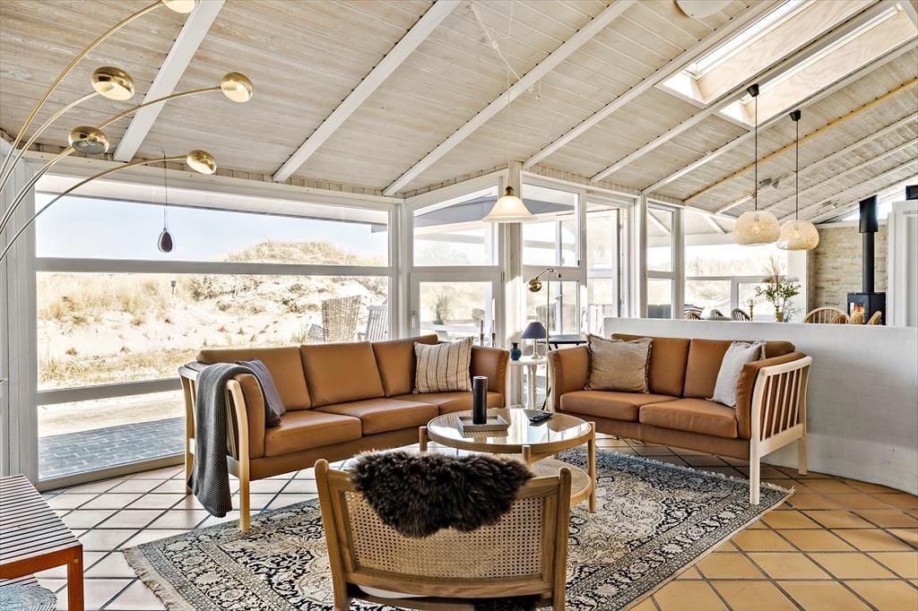 Det smukke klitlandskab er helt klart med til at gøre ferien særligt mindeværdig, for det føles eksklusivt at have vestkystens vilde natur lige udenfor vinduerne. Og det 133 m2 store sommerhus er selvfølgelig udformet, så I får fuldt udbytte af omgivelserne – ikke mindst i den såkaldte udsigtsstue, hvor vinduer vendt mod tre verdenshjørner går fra gulv til loft. Stuen er integreret med opholdsrummet, der også byder på en brændeovn, et spisebord og et veludstyret køkken, hvor I kan diske op med lækre madretter dagen lang. I opholdsafdelingen har I også en ekstra sofaafdeling med fladskærms-tv, og når det er ved at være sengetid, kan I fordele jer på de fire soveværelser, hvis sengepladser egner sig godt til seks voksne og et barn. I sommerhuset er der for øvrigt to brusebadeværelser, hvoraf det ene er med vaskemaskine og tørretumbler. Bemærk, at saunaen er privat, så den kan ikke benyttes.