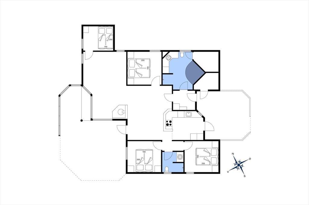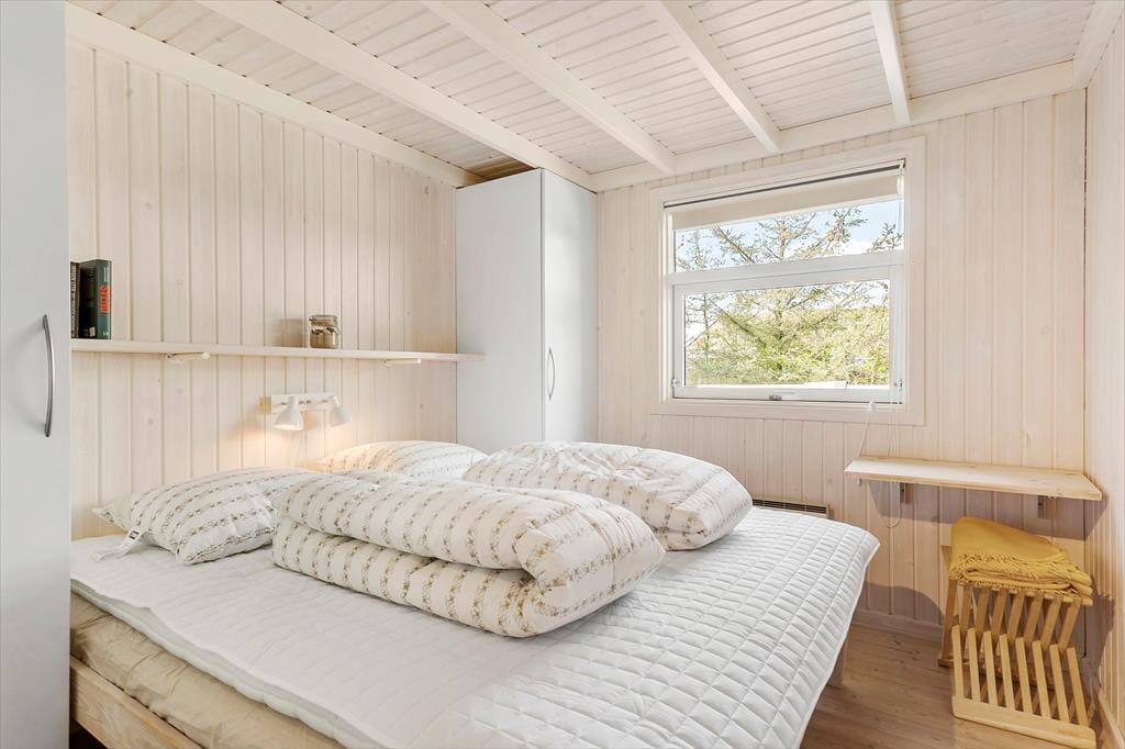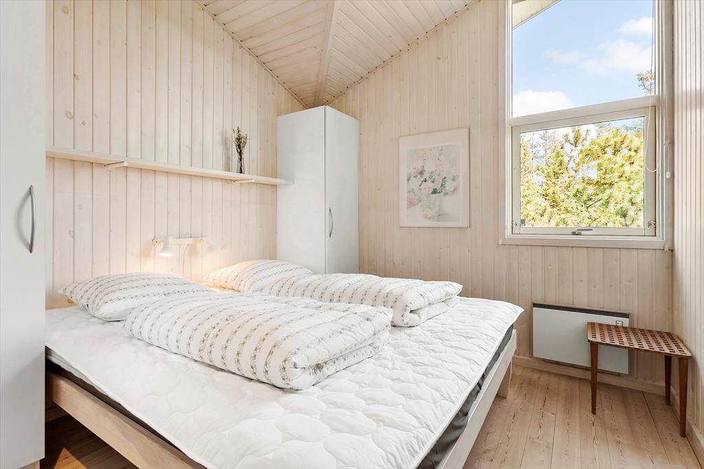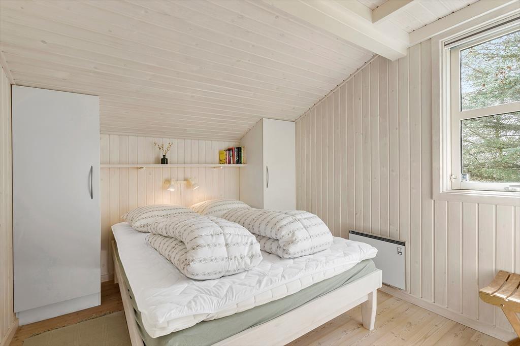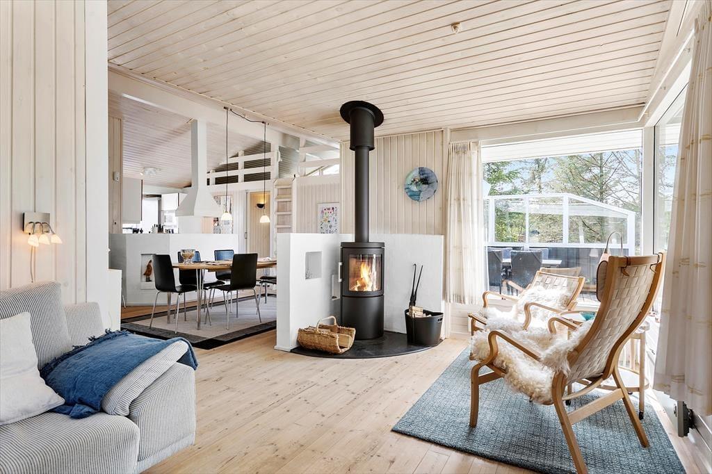 I kan være op til seks voksne og to børn inden døre, og uanset om I har huset fuldt eller ej, er det rart at have god plads til at folde ferielivet ud. Opholdsafdelingen er lys og rummelig, og takket være den åbne forbindelse mellem stue og køkken kan I hygge jer i hinandens nærvær det meste af tiden – også selvom der skal laves mad, eller om børnene vil op for at lege på hemsen. En tilbagelænet stund nær stuens brændeovn kan I sikkert også finde ro til, og hvis I vil helt ned i ferietempo, kan I tage husets spabad og sauna i brug. Begge dele finder I på det største af de to badeværelser, der ligger lige ved entréen. De fire soveværelser er godt fordelt i huset og er alle udstyret med dobbeltsenge.