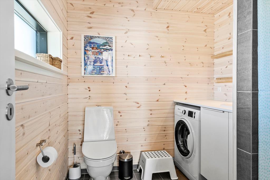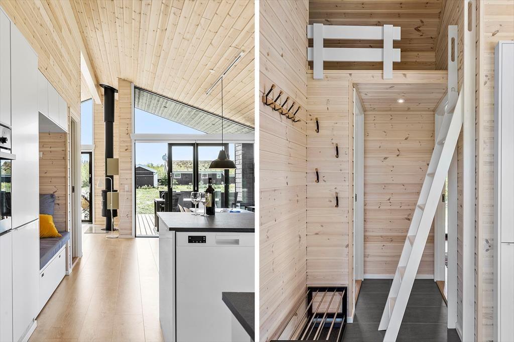 Atmosfæren er lys og let inden døre i det 89 m2 store sommerhus – ikke kun på grund af rummenes lyse trævægge og enkle indretning, men også takket være de store vinduespartier, der inviterer solen og de smukke omgivelser indenfor. Et moderne, grebsfrit køkken er integreret med stuen, der byder på en god spiseplads og en dejlig sofaafdeling med fladskærms-tv og brændeovn. En hyggelig detalje er alkoven, hvor børnene kan sidde med bøger eller mobilspil, mens de voksne åbner en flaske vin og forbereder aftensmaden. Et badeværelse med bruser og vaskemaskine ligger lige ved entréen, og endelig byder huset på tre gode soveværelser og en hems.