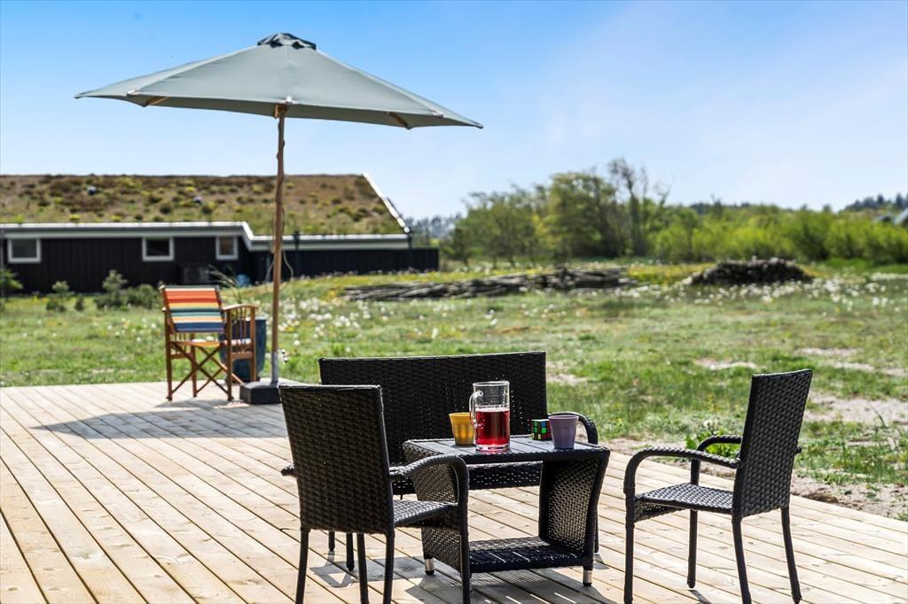 Ikke bare fra entréen og stuen, men også fra de tre værelser er der dør ud mod træterrassen, der breder sig rundt om huset. Her kan I vælge at sætte jer på de overdækkede arealer, hvis I trænger til skygge, og ellers kan I finde en opholdsplads i solen, når I vil drikke eftermiddagskaffe eller grille ude i det fri. På den store naturgrund har I god plads til at spille bold og frisbee, og med en sandkasse og mulighed for at spille petanque er der tænkt på underholdning for både børn og voksne.