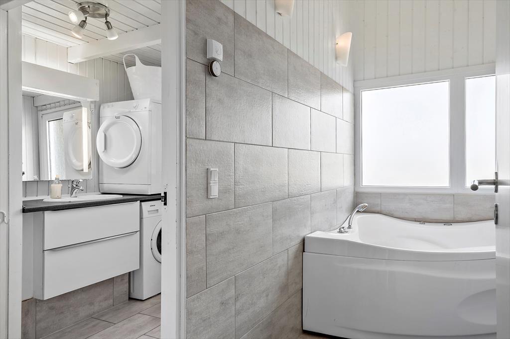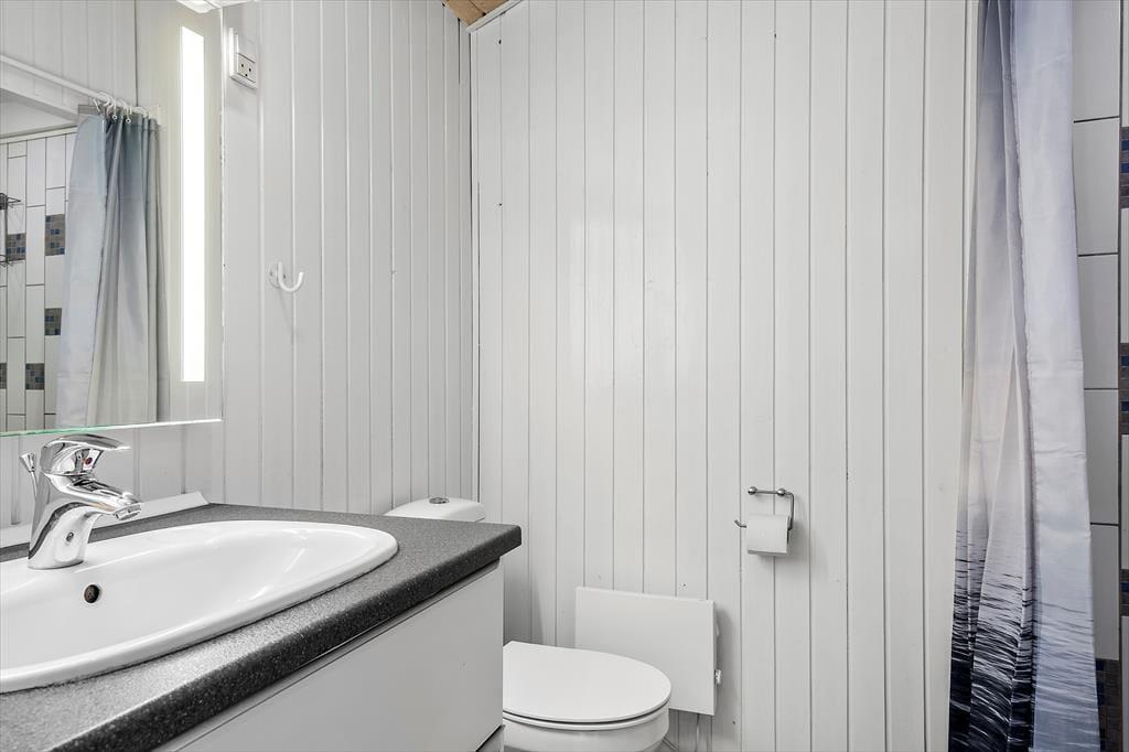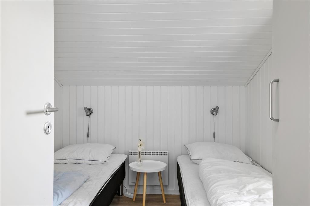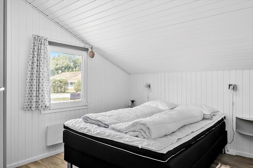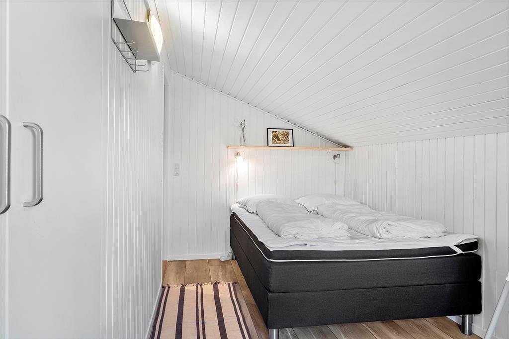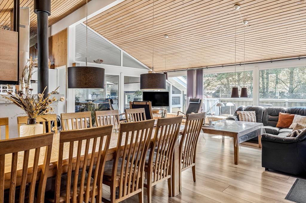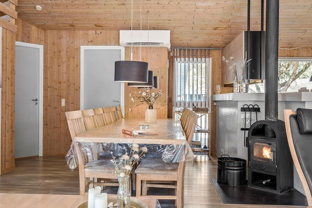 Sommerhuset er flot og velholdt og komfortabelt indrettet med gode møbler og plads til mange. Med fire soveværelser og to hemse kan her være op til 12 overnattende gæster. Og med to badeværelser behøver man heller ikke bekymre sig om kø til toiletterne om morgenen. Køkkenet, spisepladsen og stuen udgør tilsammen det centrale opholdsrum; her er brændeovn og tv, og man kan overskue, hvad der sker i aktivitetsrummet og på grunden udenfor. Af børnevenlige tiltag i huset kan nævnes vaskemaskine, tørretumbler, pusleplads, barneseng og stol, og til de lidt større børn er her installeret gratis WI-FI, så det er en fordel at medbringe tablets eller pc på ferien.