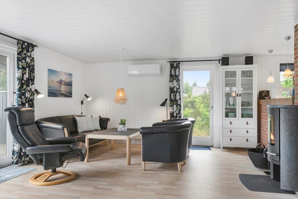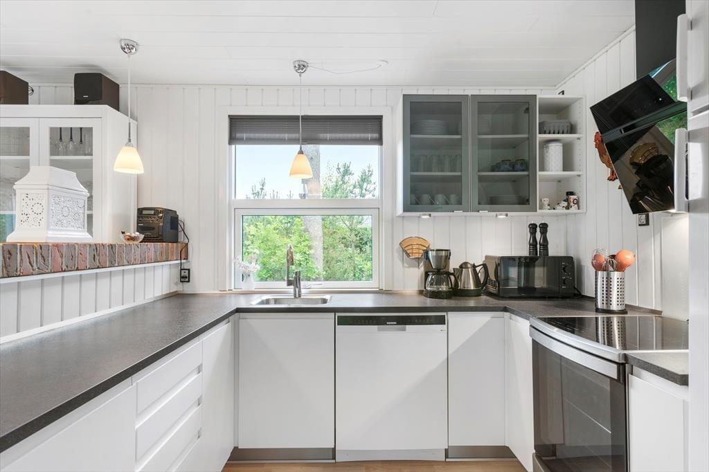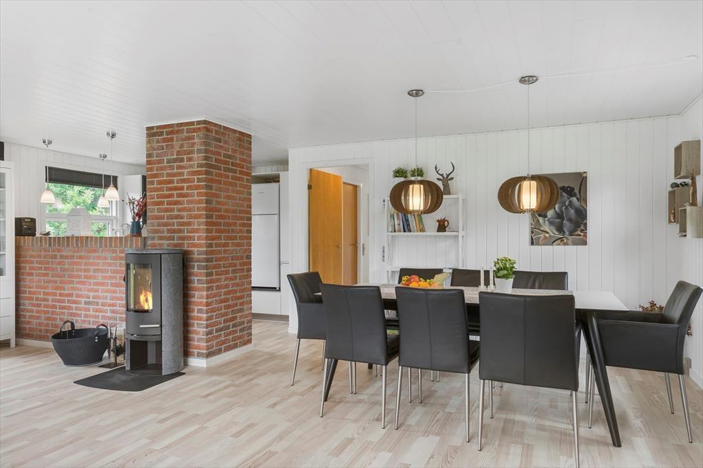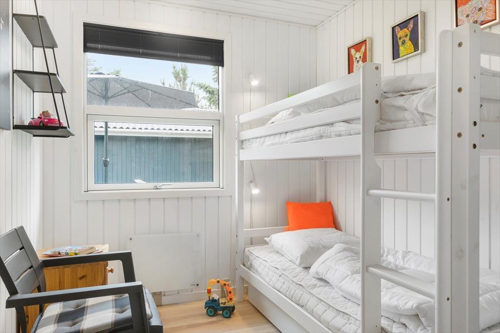 I 2022 blev sommerhuset shinet op både inde og ude, så det fremstår lyst og venligt overalt. Det fungerer i dag som en skøn base for familieferien – og med tre soveværelser, hvoraf det ene er med køjeseng og de to andre med dobbeltseng, kan det endda være, at I har mulighed for at invitere bedsteforældrene med. Det rummelige badeværelse er udstyret med en rummelig bruseniche foruden vaskemaskine og tørretumbler, og et u-formet køkken med blandt andet opvaskemaskine og komfur ligger i åben forbindelse med husets dejlige stue. Alt efter årstiden kan I tænde op i brændeovnen, inden I finder brætspil og snacks frem og gør klar til en rolig eftermiddag i sofaafdelingen.