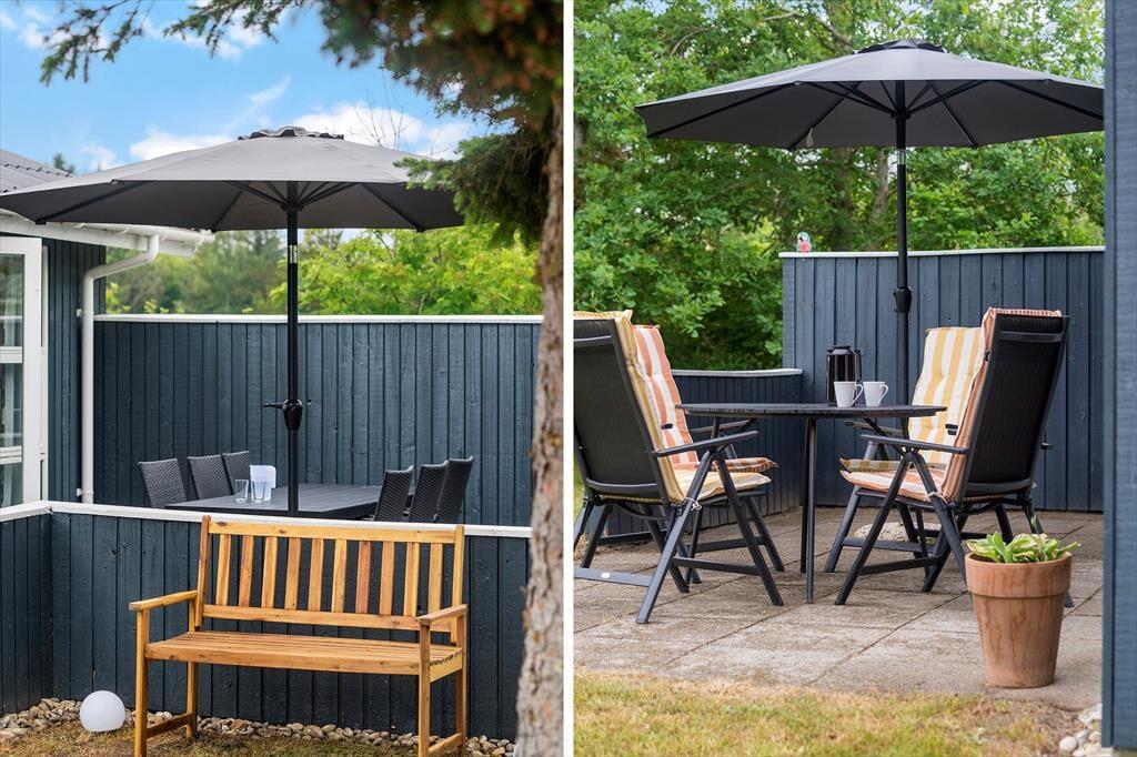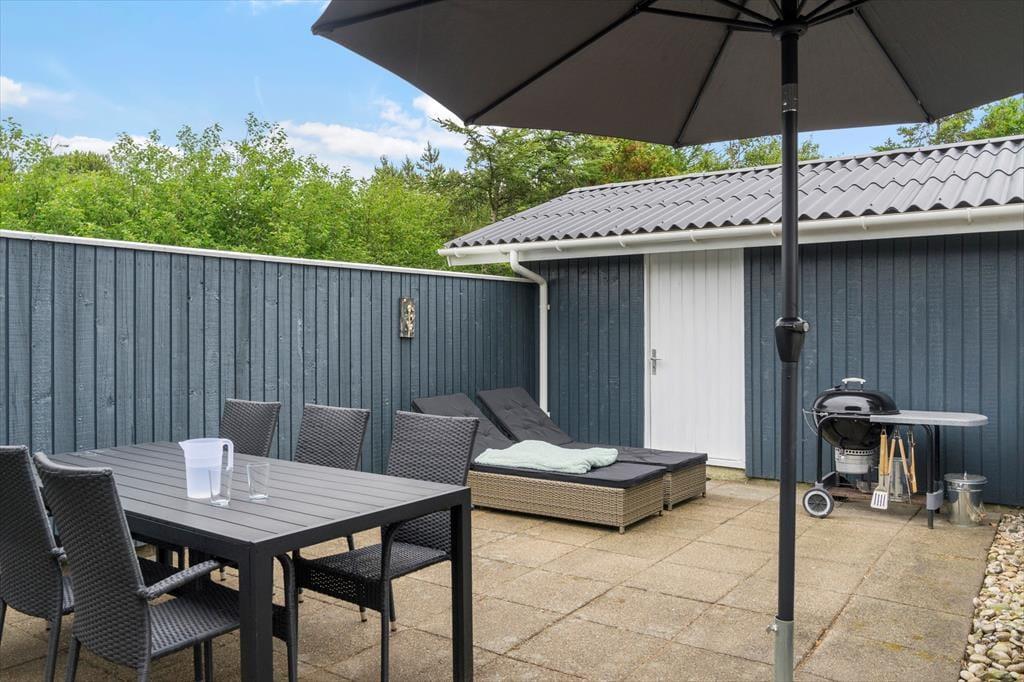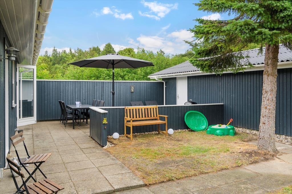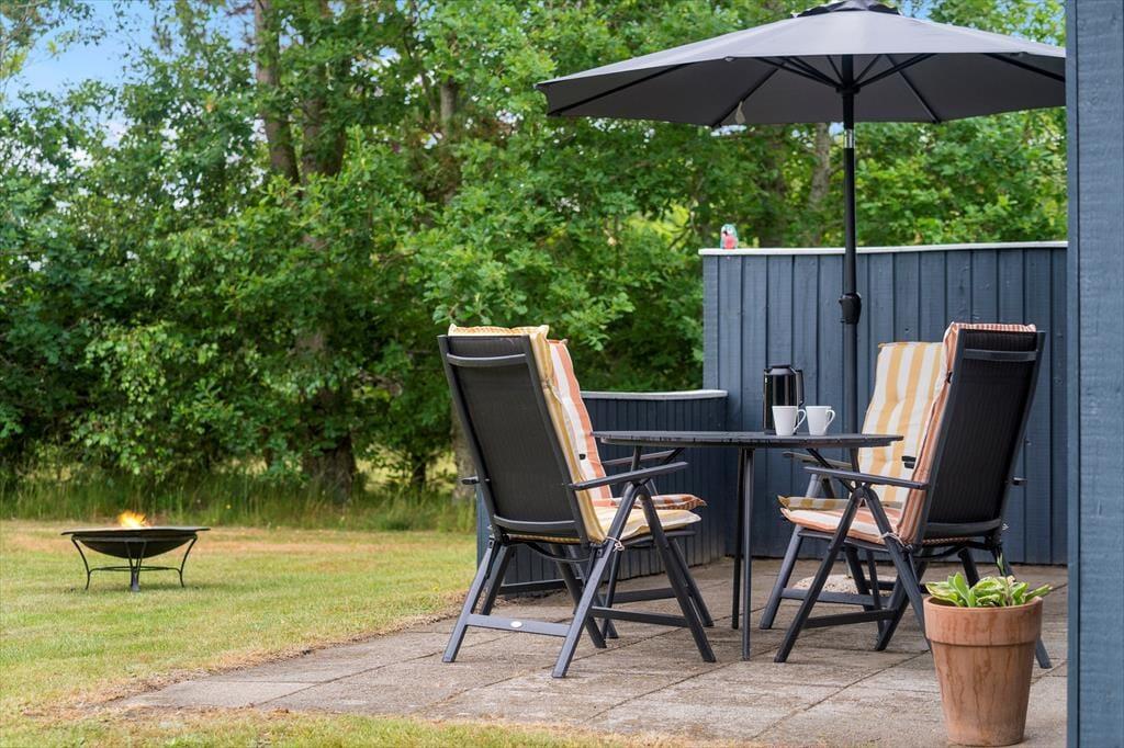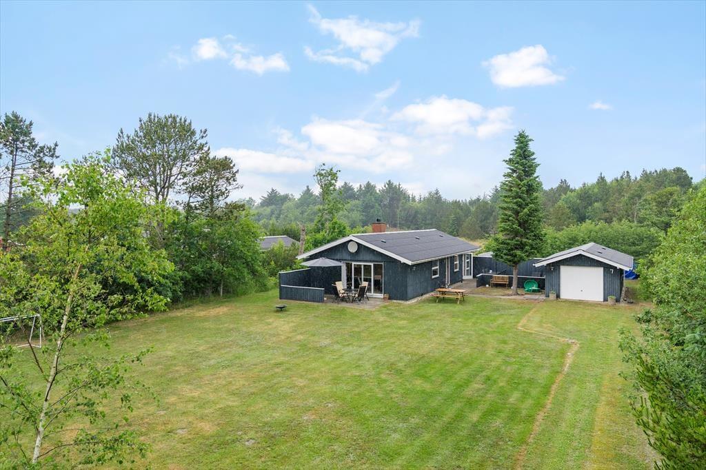 På den 1450 m2 store grund er der godt at være, for en stor græsplæne inviterer til leg og boldspil, og der er også god plads til solbadning og grillhygge på sommerhusets hyggelige terrassearealer. Hele herligheden skærmes godt af randbeplantningen ind mod naboerne, og så er vejen for øvrigt lille og lukket, hvilket er med til at understrege den fredfyldte og ugenerede fornemmelse.