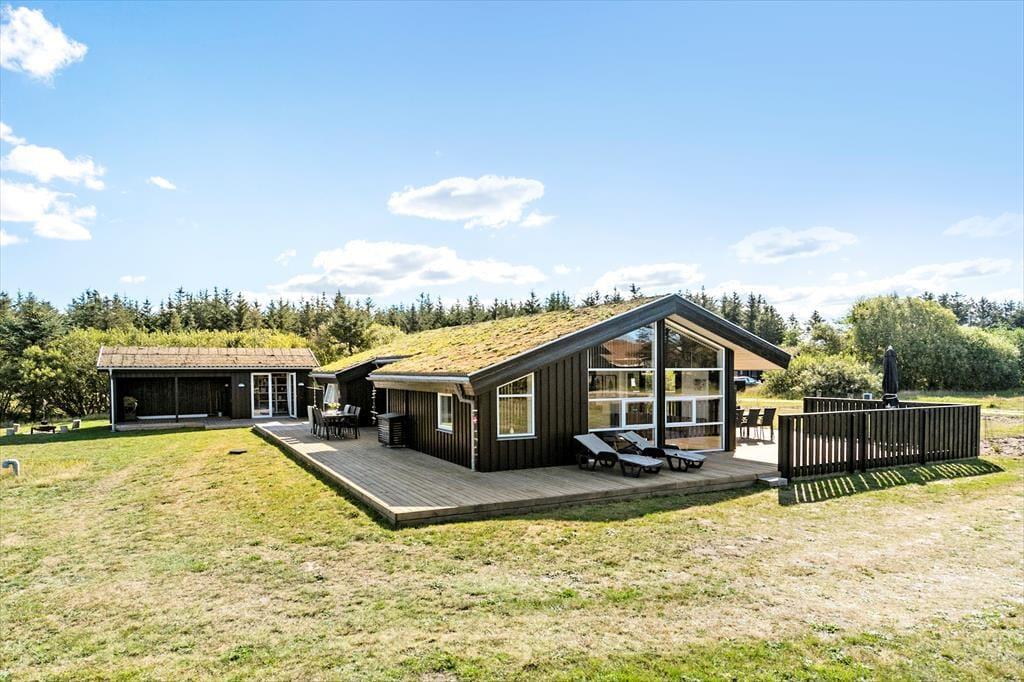 Huset er beliggende på dejlig åben naturgrund hvor der er masser af plads og højt til himlen. Der er dejlige træterrasser på de tre af husets sider. Så man kan sidde om morgenen med en kop kaffe, eller nyde de lange lune sommeraftener med et glas vin og grillmad. Havemøbler, grill, parasol og liggestole er naturligvis til rådighed. På den store plæne er der rig mulighed for leg og boldspil. Her kan børn og barnlige sjæle boltre sig.