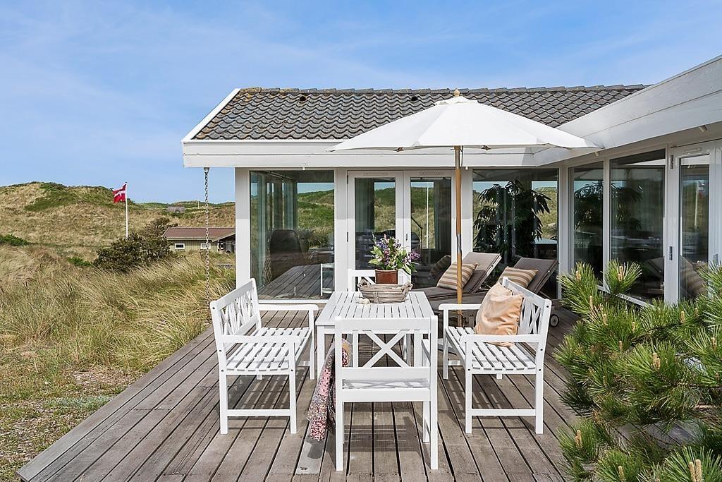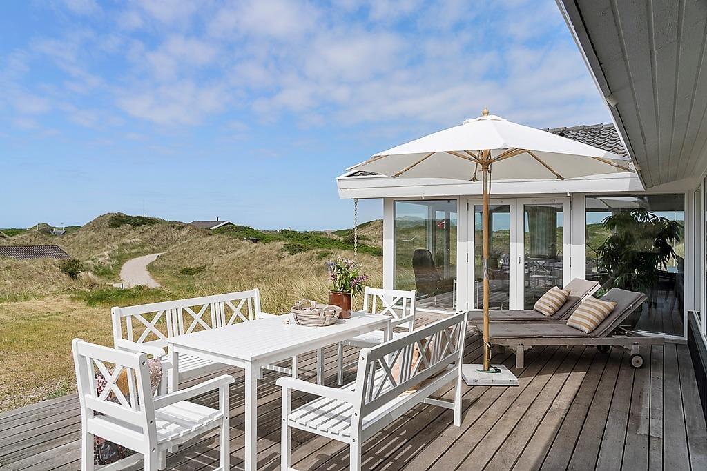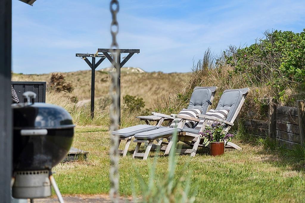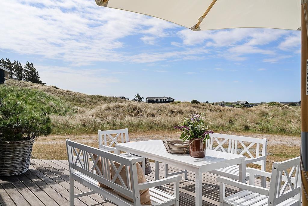 De udendørs omgivelser er også fortrinlige. Foran sommerhuset ligger en stor, vestvendt terrasse, hvorfra I kan nyde synet af bløde klitter og bølgende marehalm – og måske ligefrem se havet i horisonten. Kommer vinden fra vest kan I sætte jer om på den østvendte terrasse, som er endnu en dejlig opholdsplads med gode havemøbler og liggestole.
