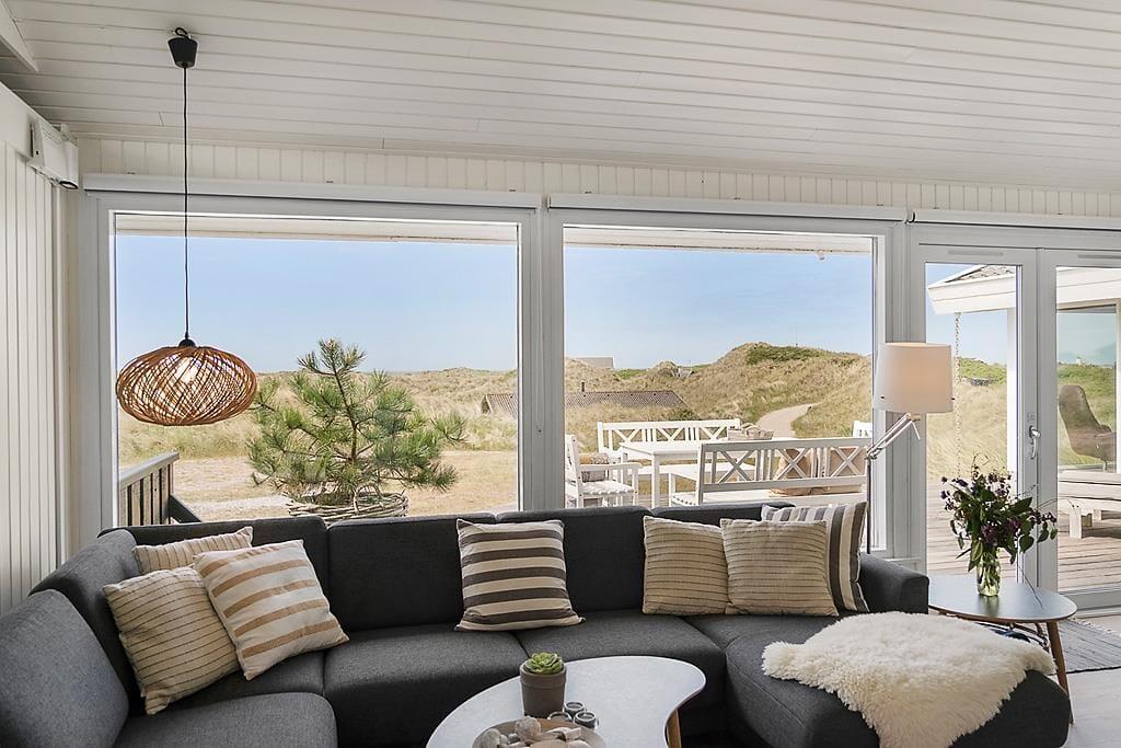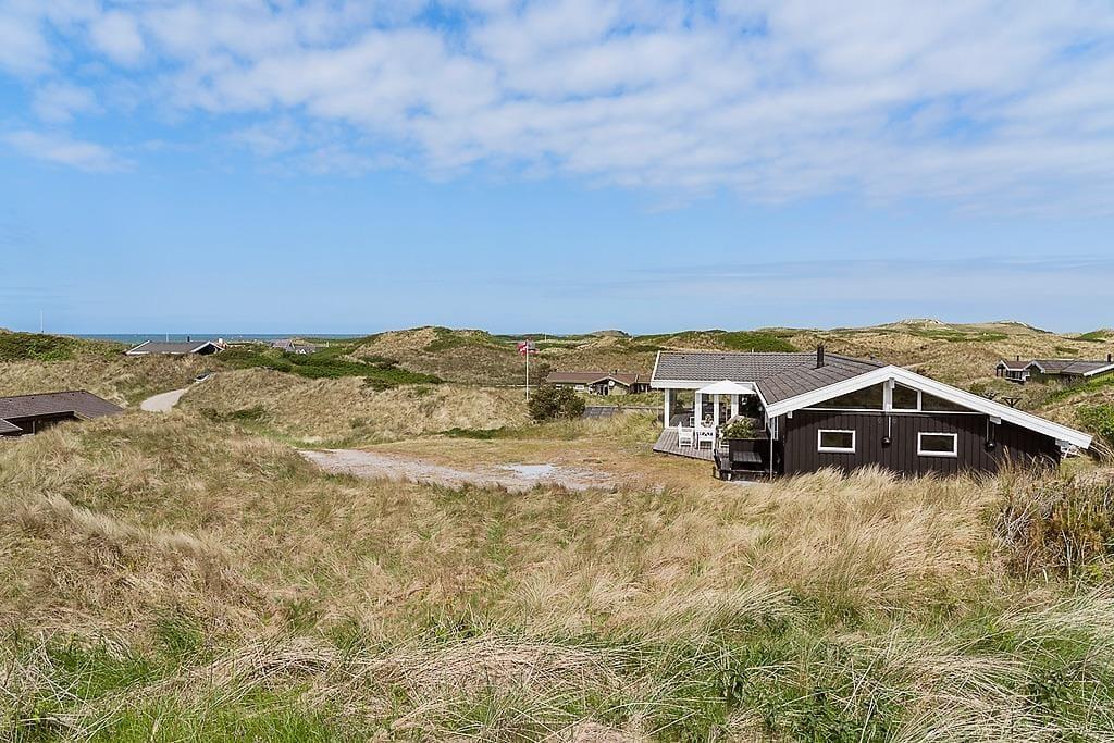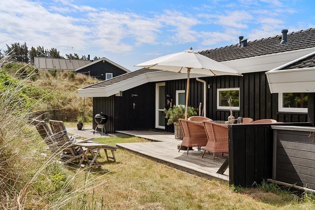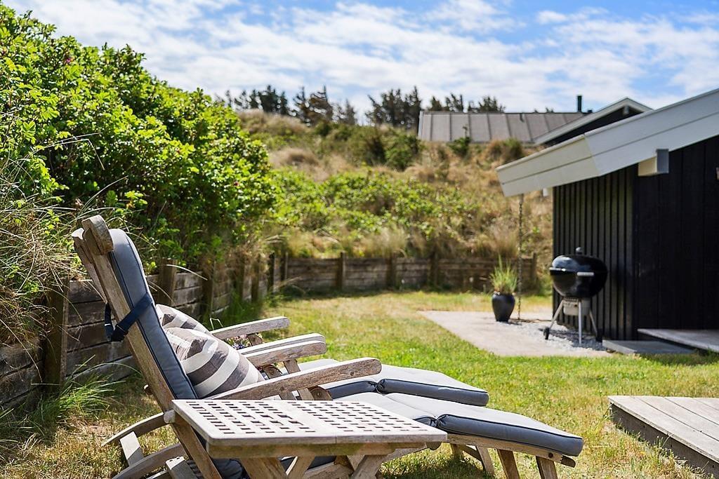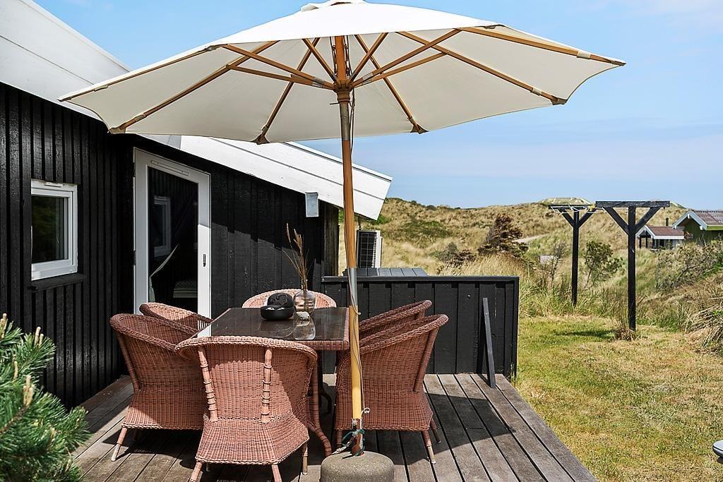 De udendørs omgivelser er også fortrinlige. Foran sommerhuset ligger en stor, vestvendt terrasse, hvorfra I kan nyde synet af bløde klitter og bølgende marehalm – og måske ligefrem se havet i horisonten. Kommer vinden fra vest kan I sætte jer om på den østvendte terrasse, som er endnu en dejlig opholdsplads med gode havemøbler og liggestole.