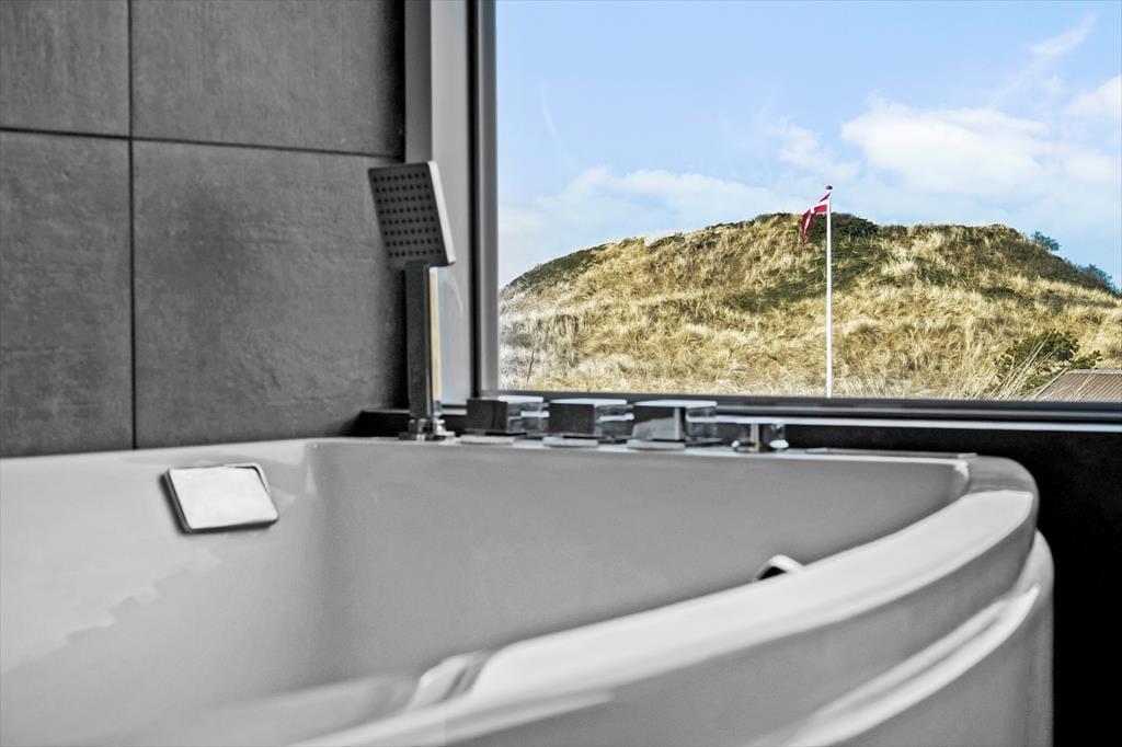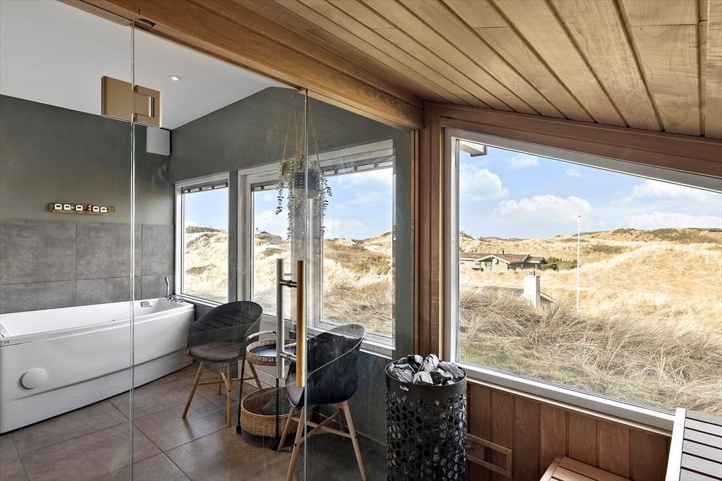 Egentlig behøver man ikke at se mere end et foto fra wellnessafdelingen, før det står klart, hvor lækkert og velindrettet dette sommerhus er. Det stilfulde rum er nemlig udstyret med både spabad og sauna, og begge dele er placeret med fri udsigt over Saltums flotte klitlandskab. Et helt perfekt sted at slappe af og nyde ferielivet!