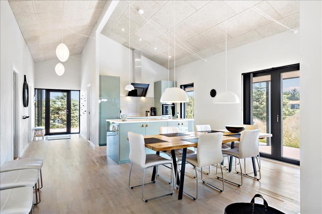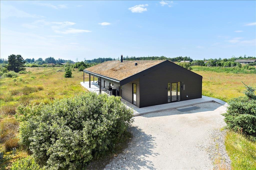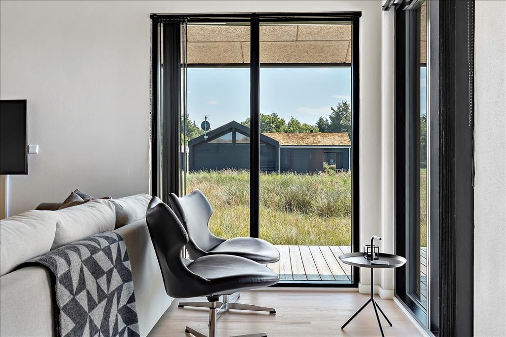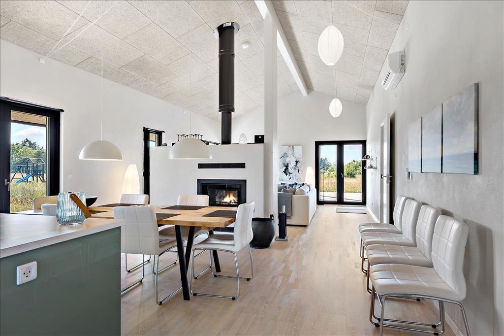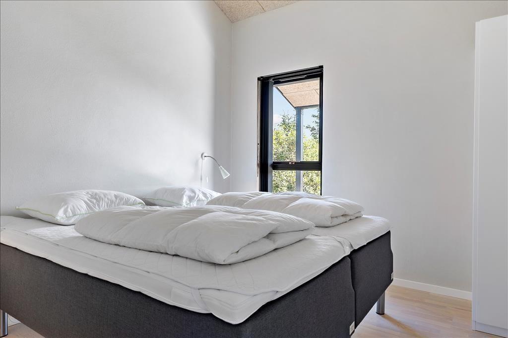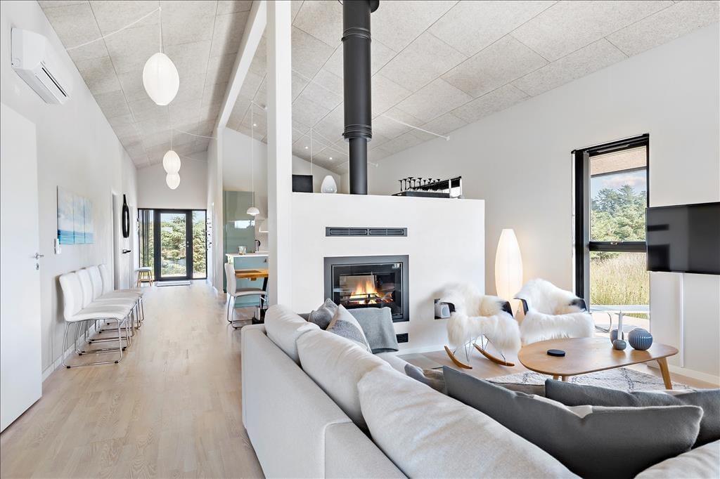 Sommerhuset blev opført i 2019 med levende tag og en flot, mørk facade, der brydes af store vinduespartier. Det giver et glimrende lysindfald inden døre, og samtidig får I en fin og fri udsigt til de grønne omgivelser. I alle rum er indretningen moderne og stilren, og den lyse farvesammensætning bidrager til den behagelige atmosfære. Selv husets to badeværelser er lækkert indrettet, og det ene er endda udstyret med både spa og sauna, så I kan forkæle jer selv med en wellness-aften eller to. Planløsningen byder desuden på fire indbydende soveværelser (alle sengelamper indeholder USB-opladningsmulighed), og endelig er der opholdsrummet, hvor et flot og veludstyret køkken er integreret med en dejlig stue. En pejseopsats skaber på elegant vis en naturlig opdeling af rummet – og I kan endda nyde synet af pejsens flammer fra både spiseafdelingen og sofahjørnet.